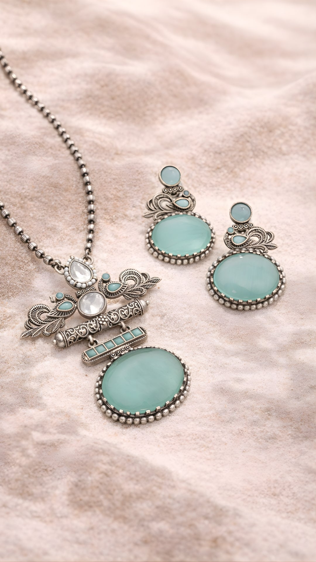 Pastel elegance meets bold silverwork in this aqua green necklace set. Oversized stones are paired with peacock-inspired oxidized detailing, giving...