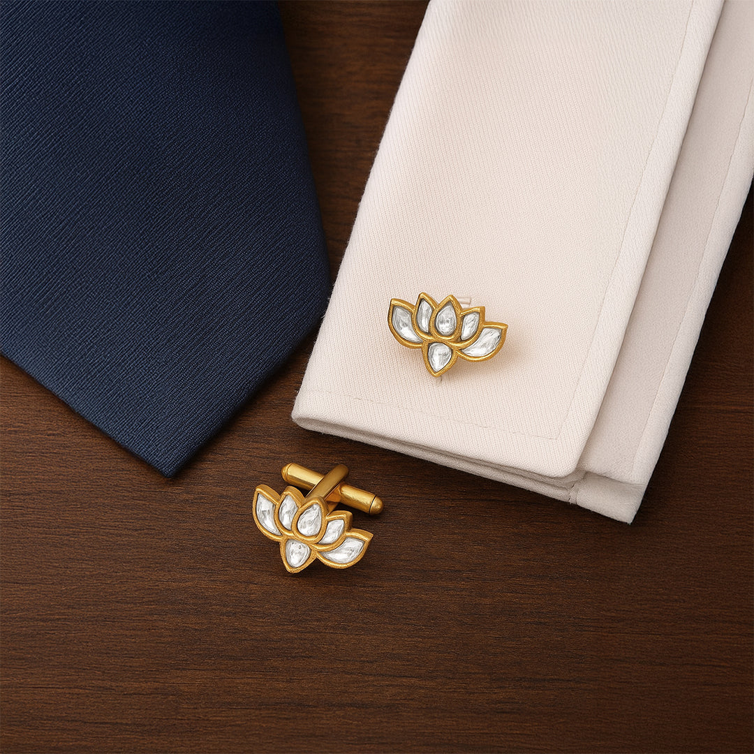 Style: Lotus Motif | Color: Gold with White StonesCelebrate calm confidence with the White Lotus Elegance Cufflinks. Set in polished...