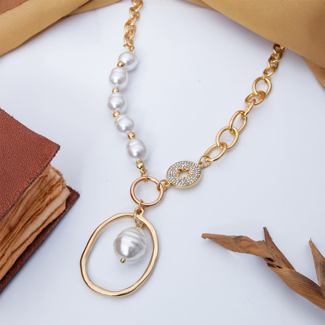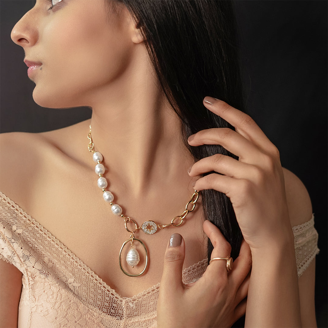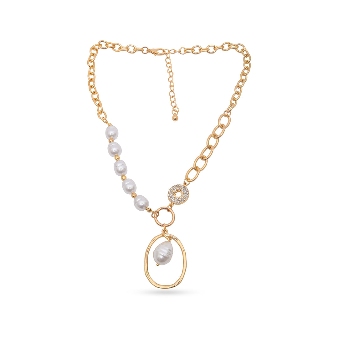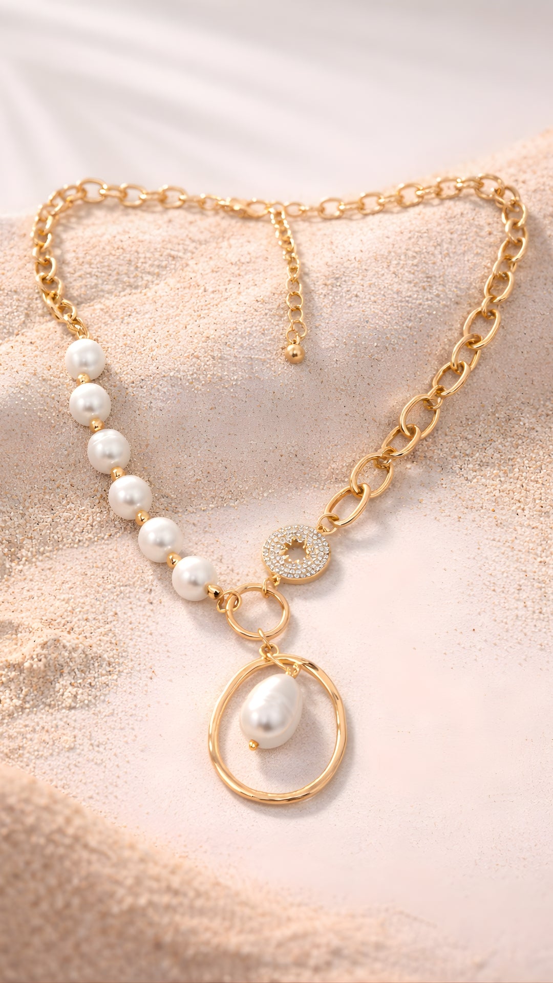 Dare to stand out with the Ava Asymmetrical Pearl Link Necklace—a half-and-half design balancing chunky gold links and elegant pearls....