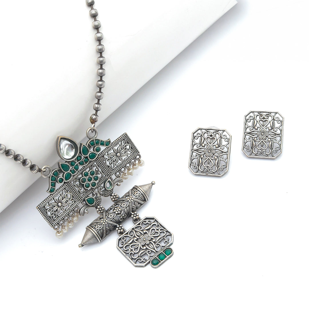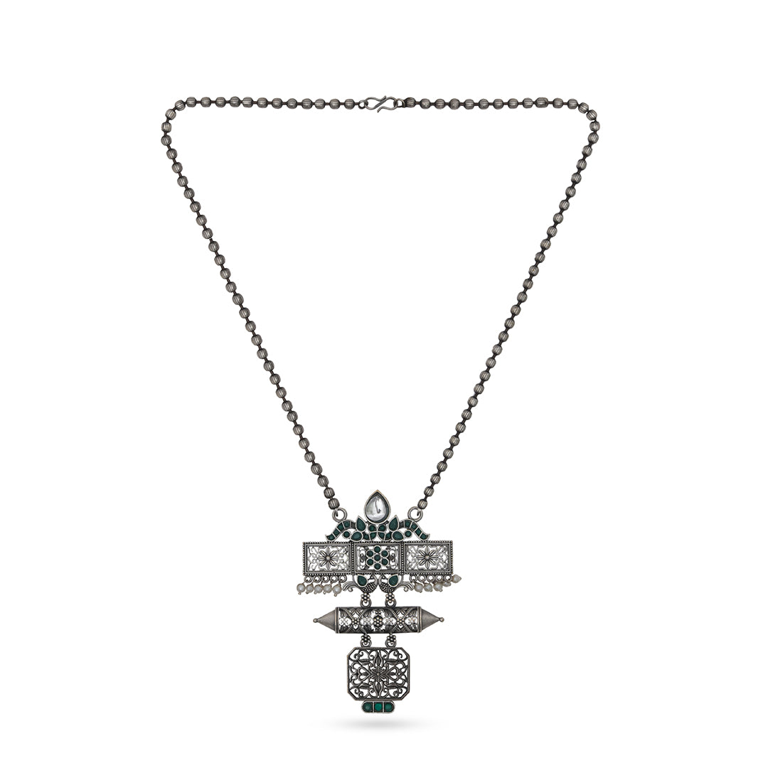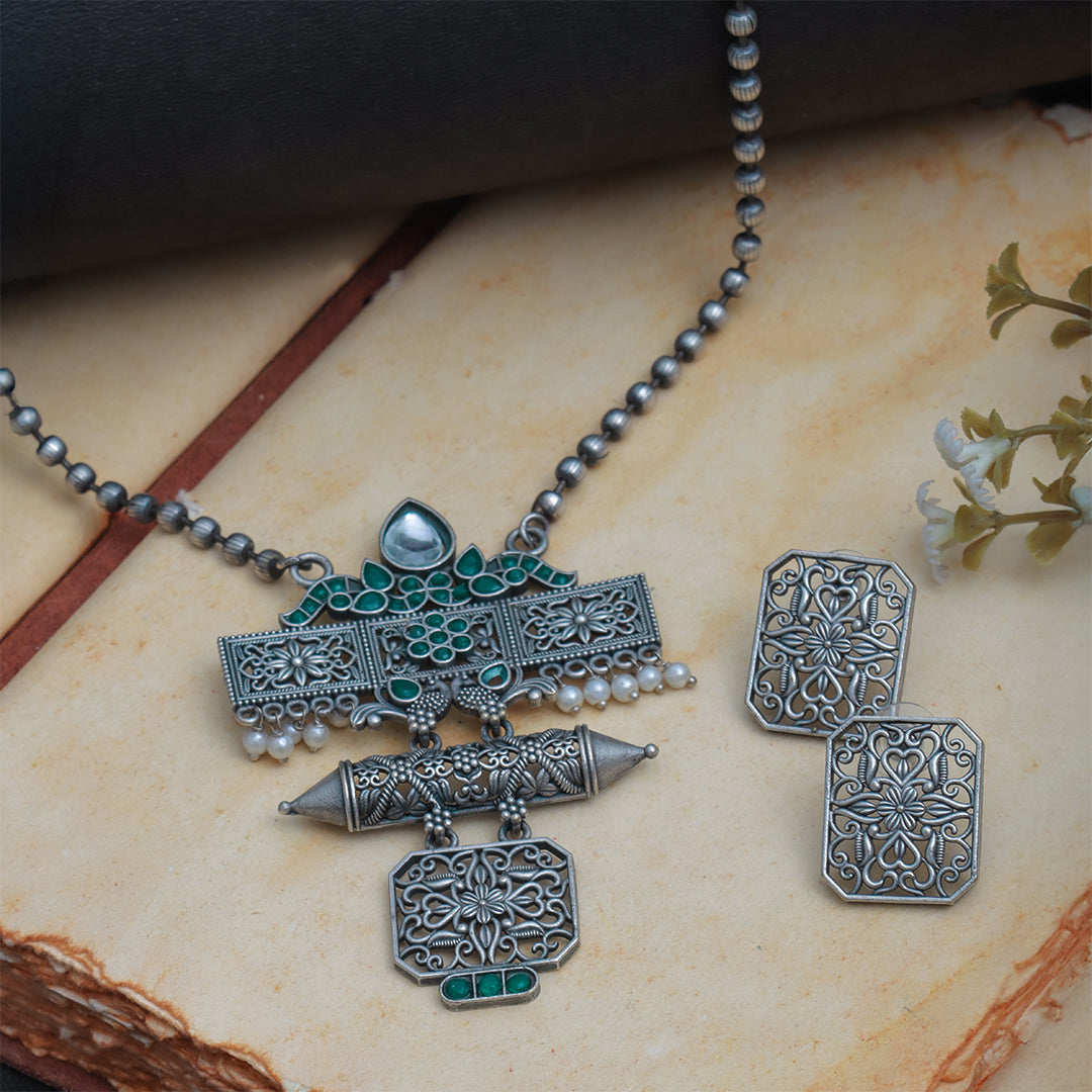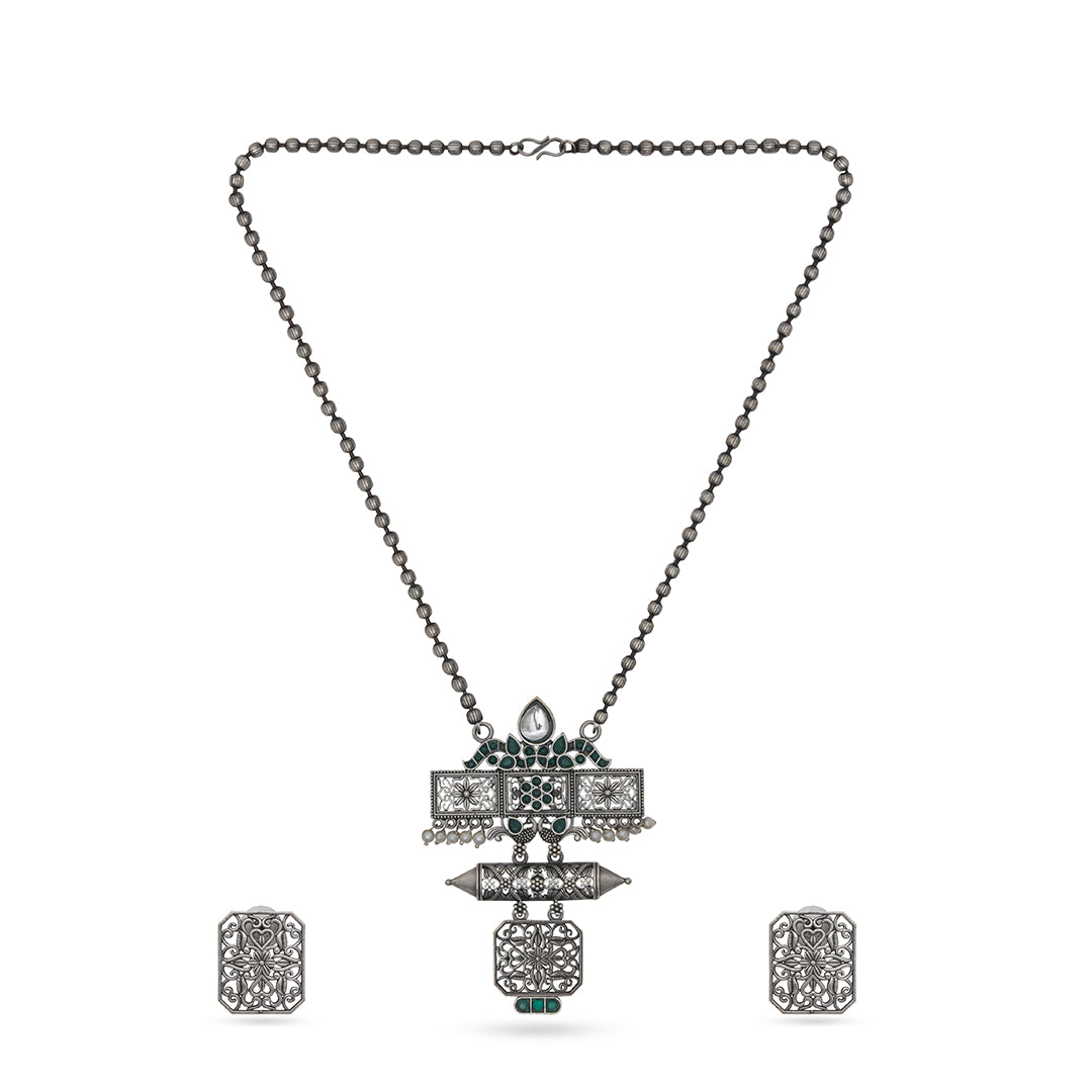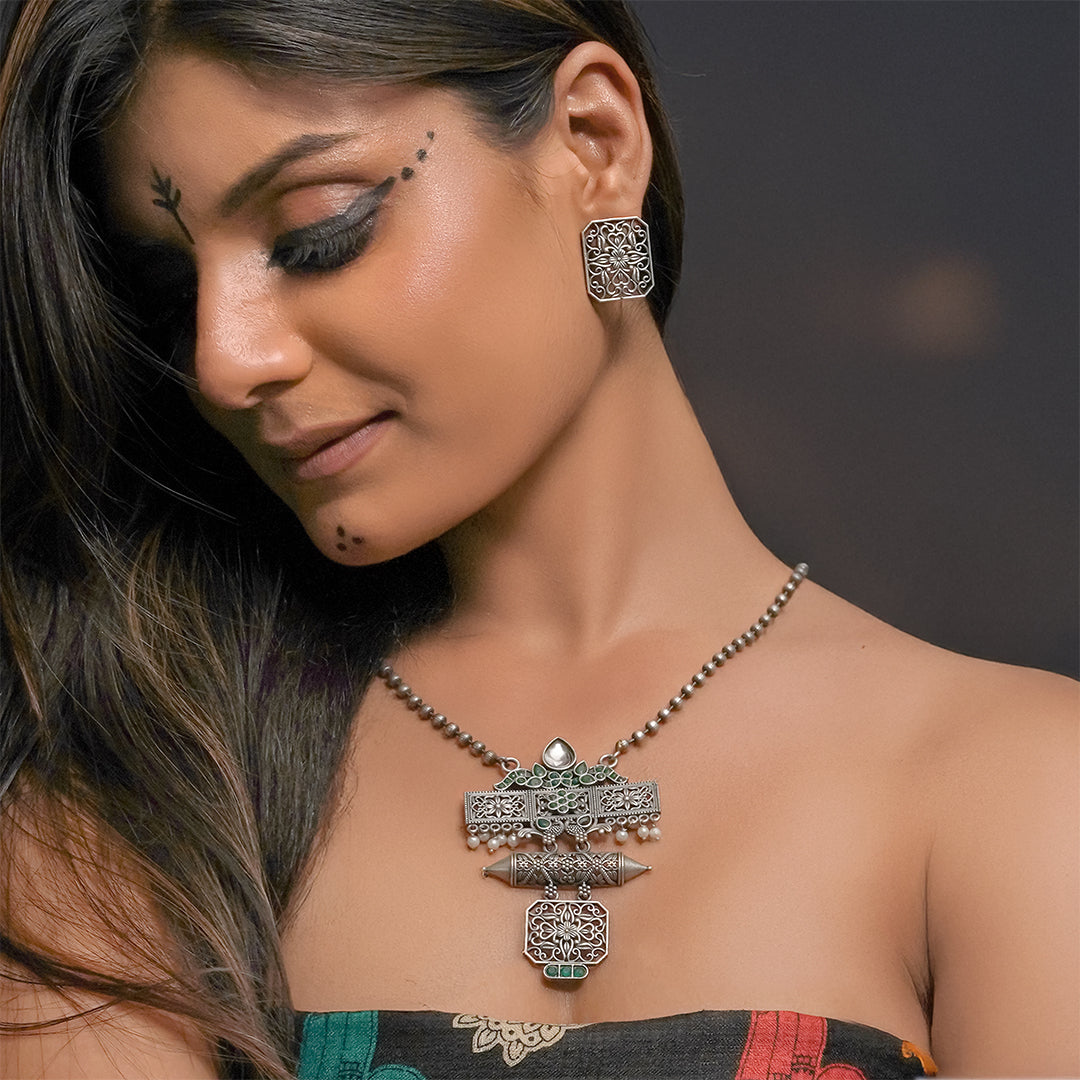 Inspired by temple architecture and Ramayana symbolism, the Ayodhya Heritage Set in green is a regal expression of tribal opulence....
