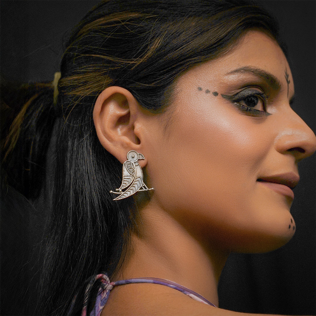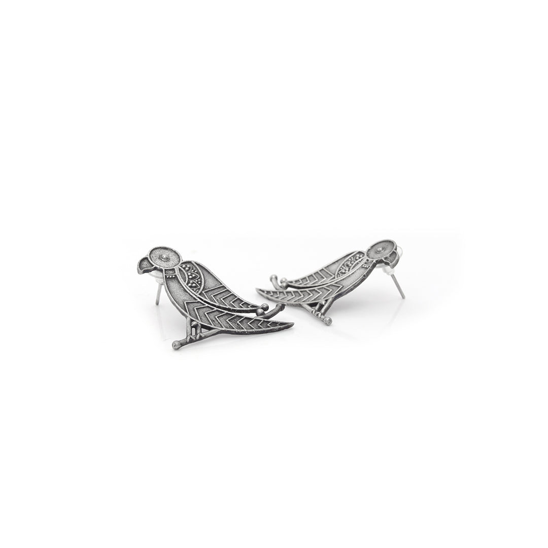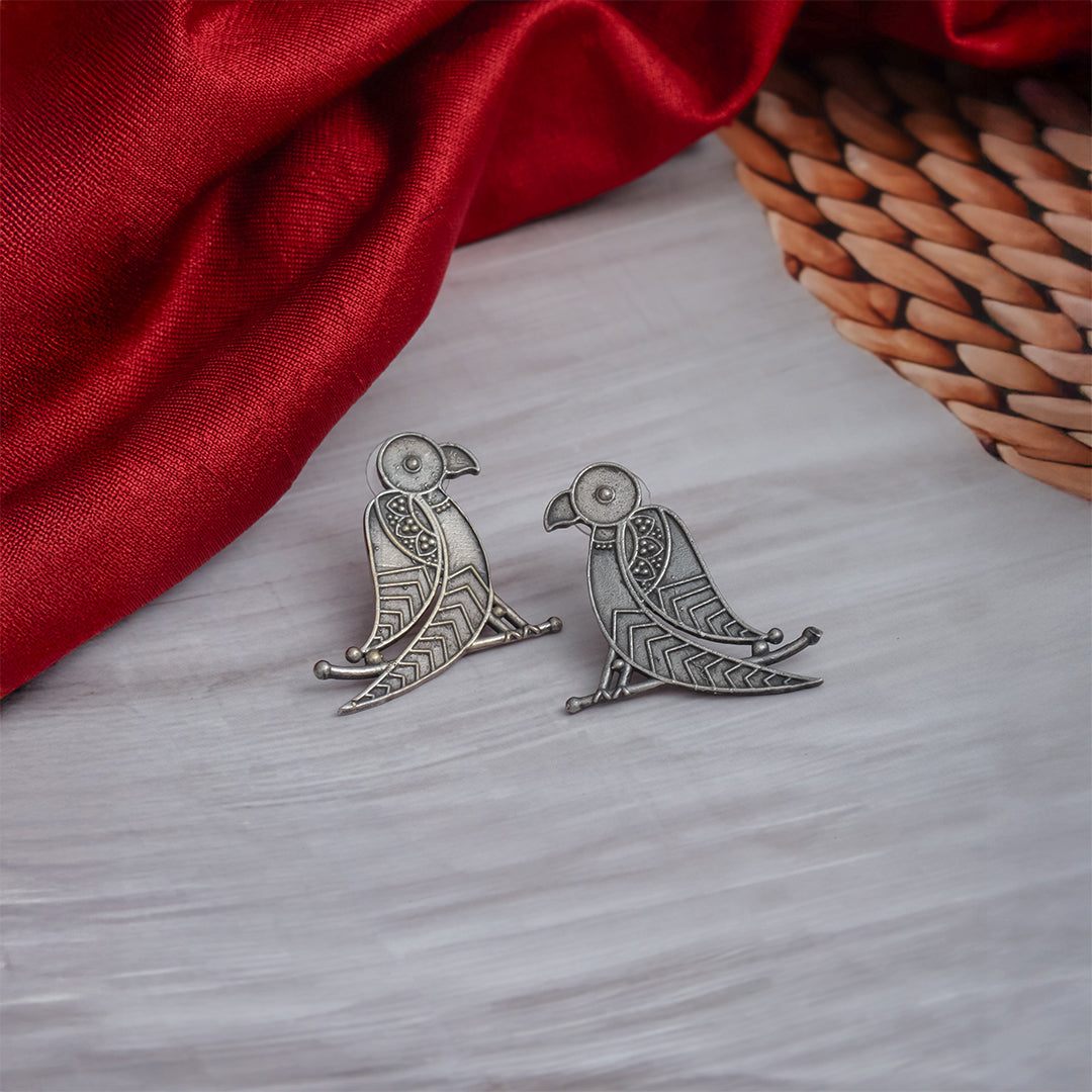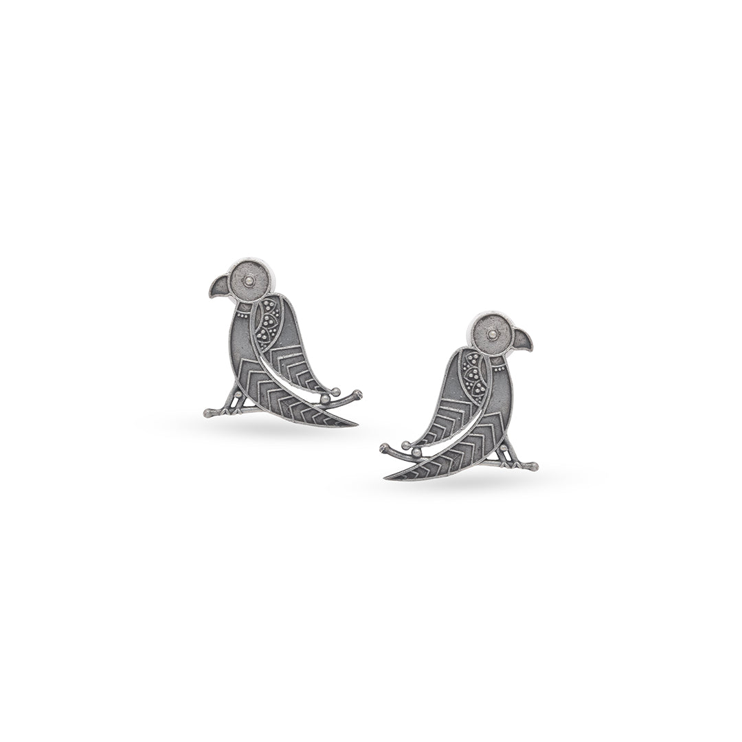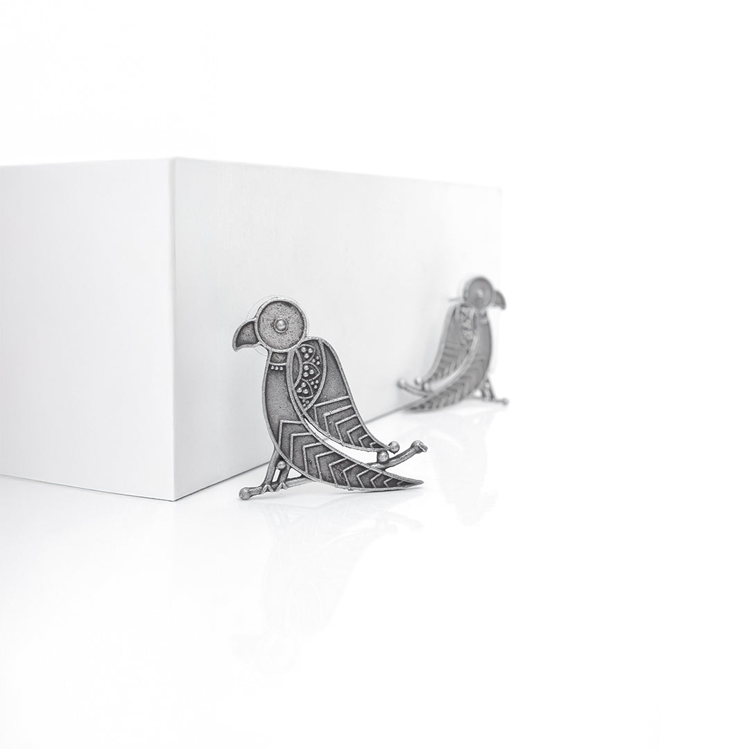 Minimal yet profound, the Baithak Earrings depict a bird calmly seated in a reflective pose, rendered in a striking oxidized...