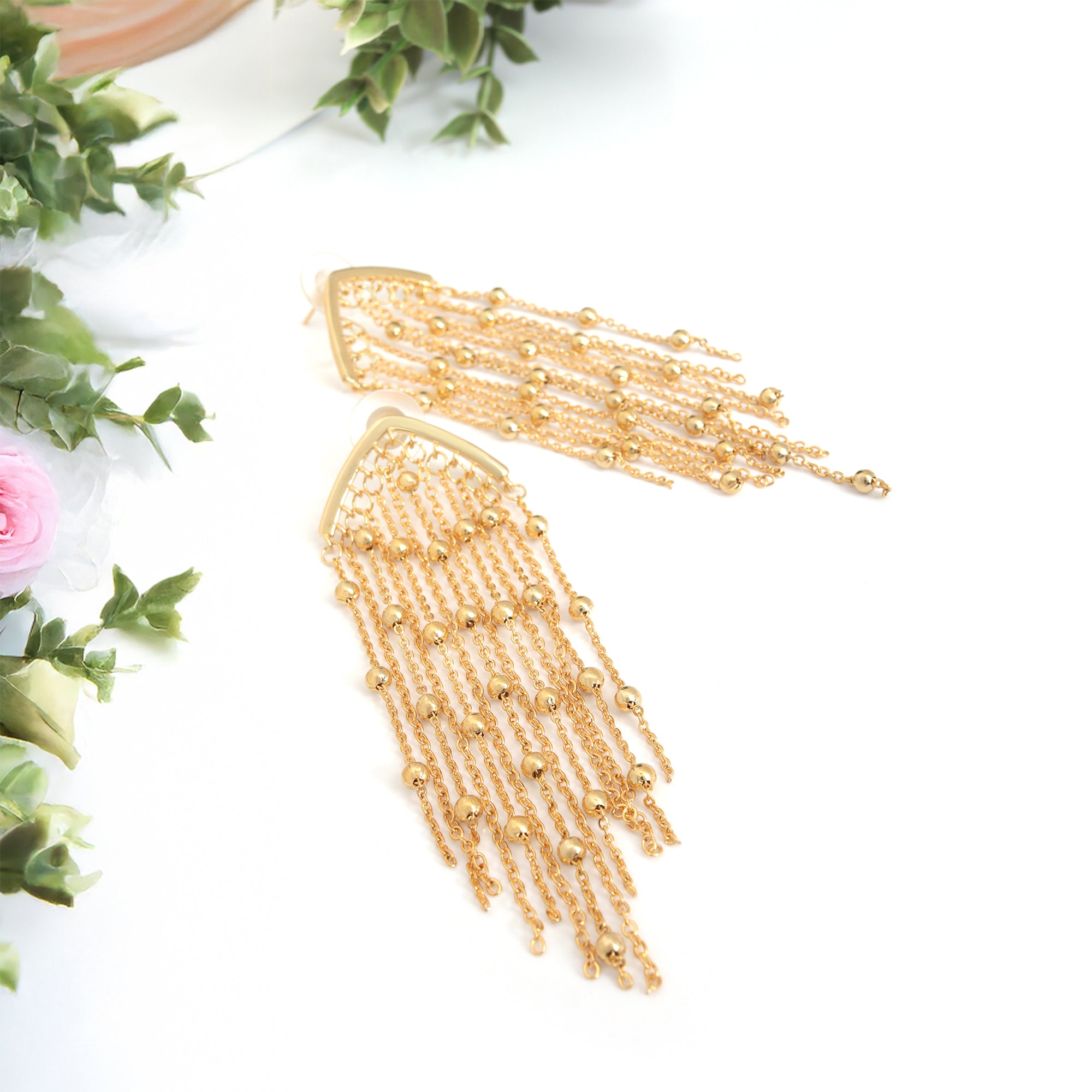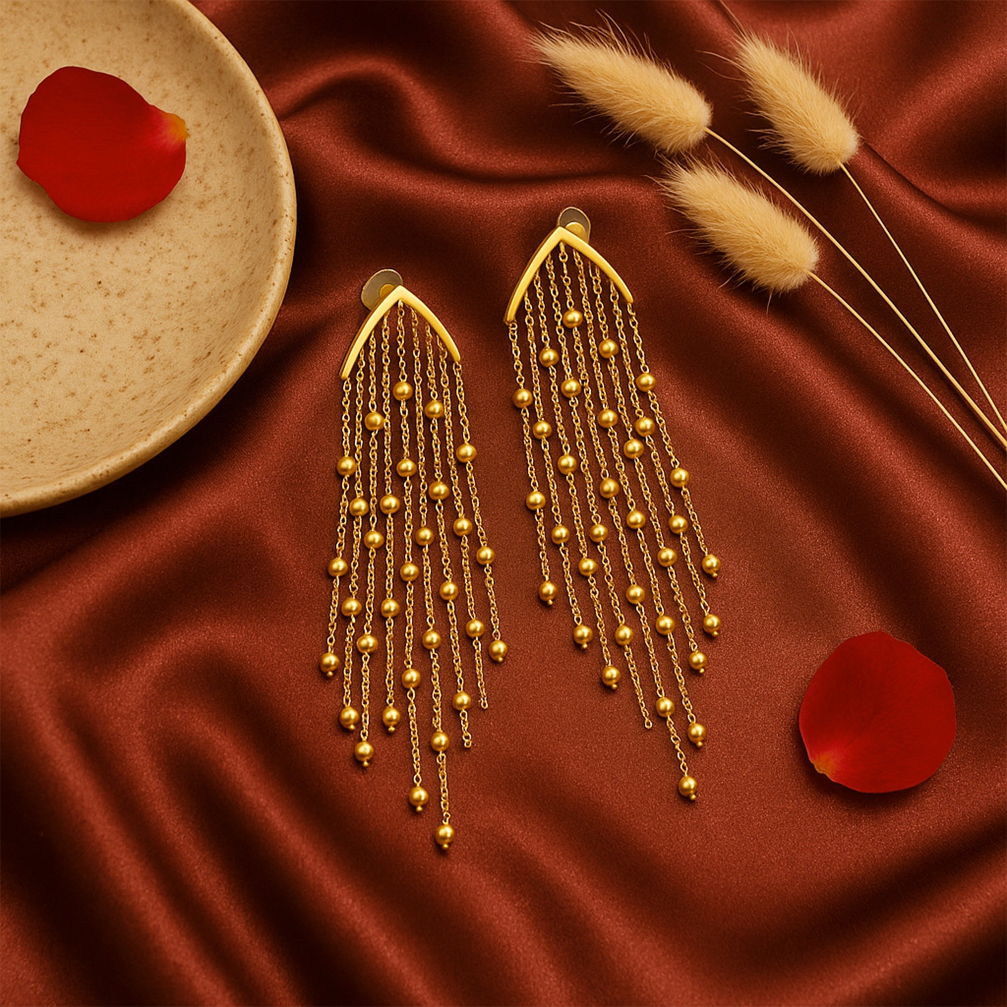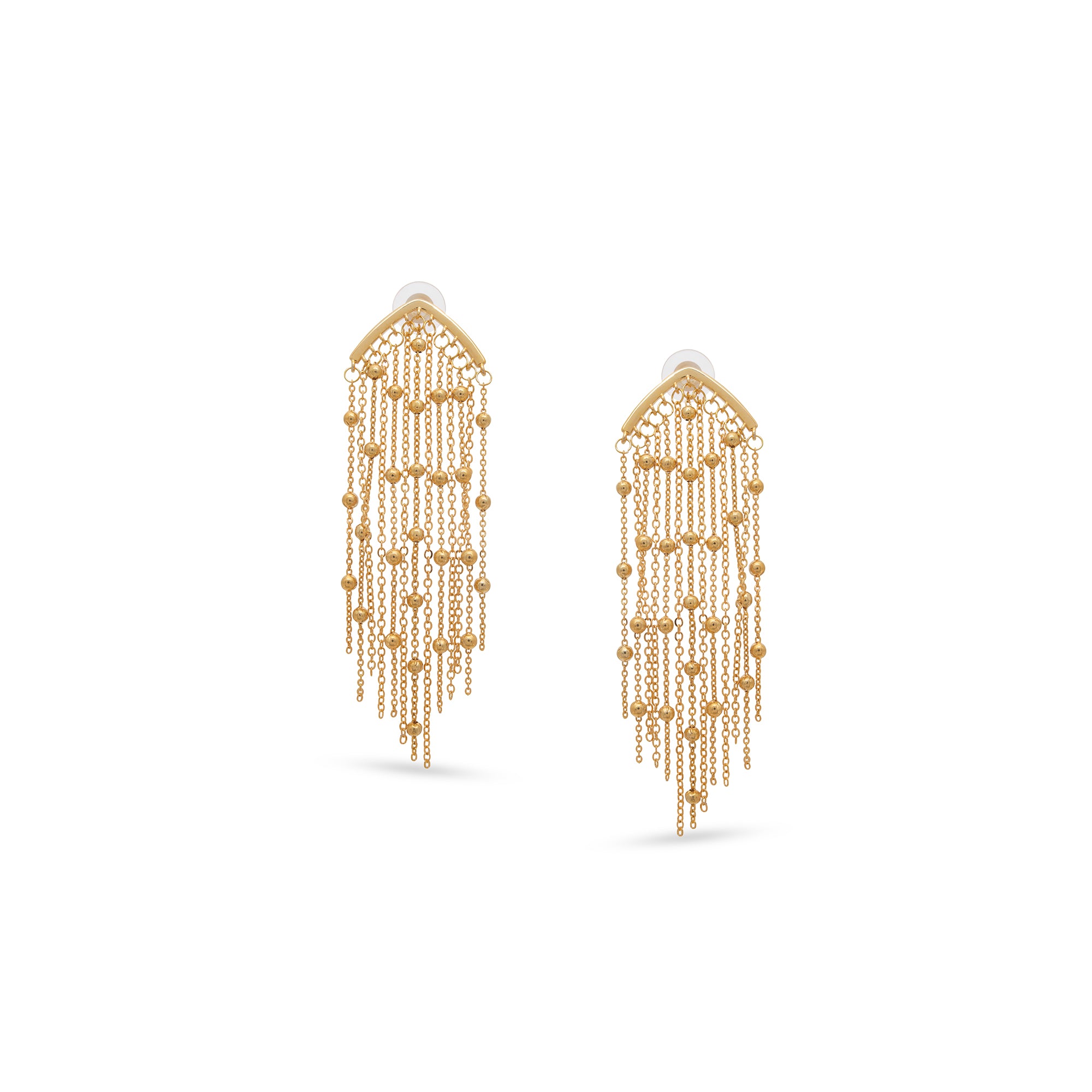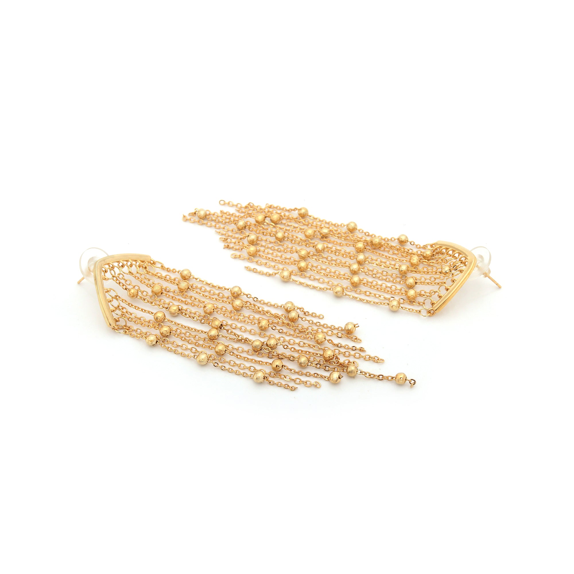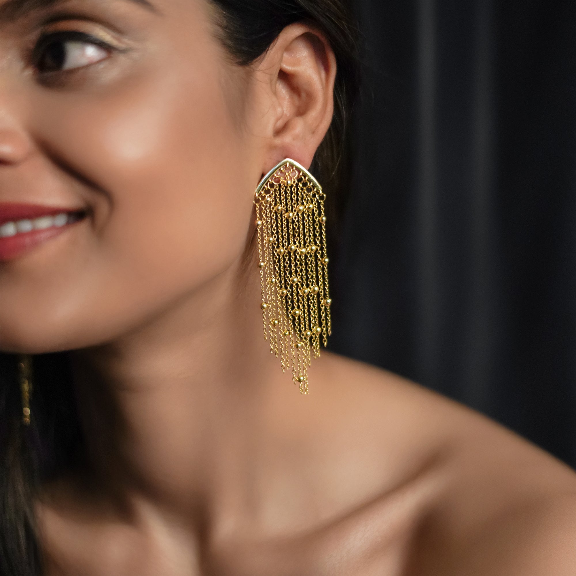 The Beaded Cascade Statement Earrings are a striking design that features multiple chain layers dotted with metallic beads. These earrings...