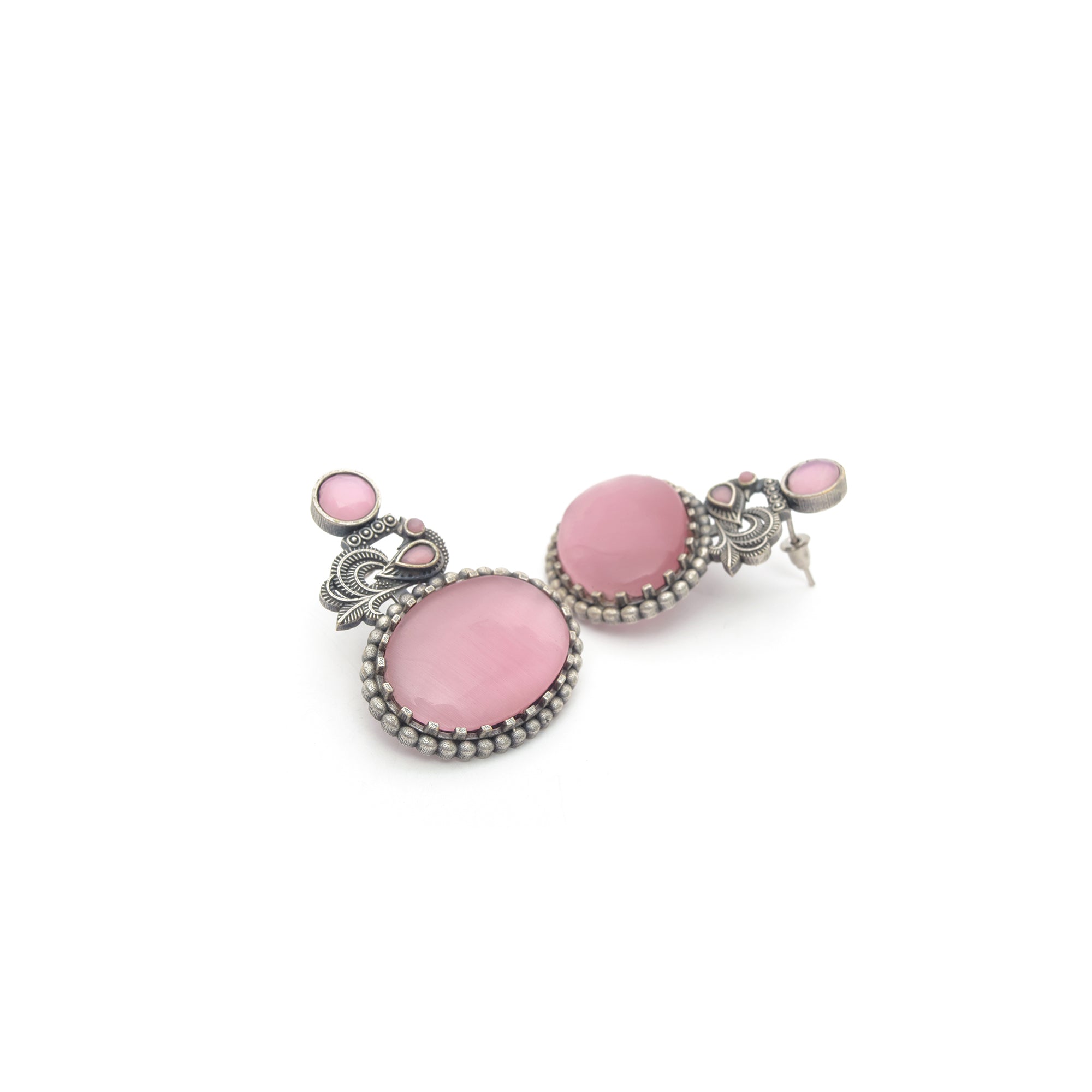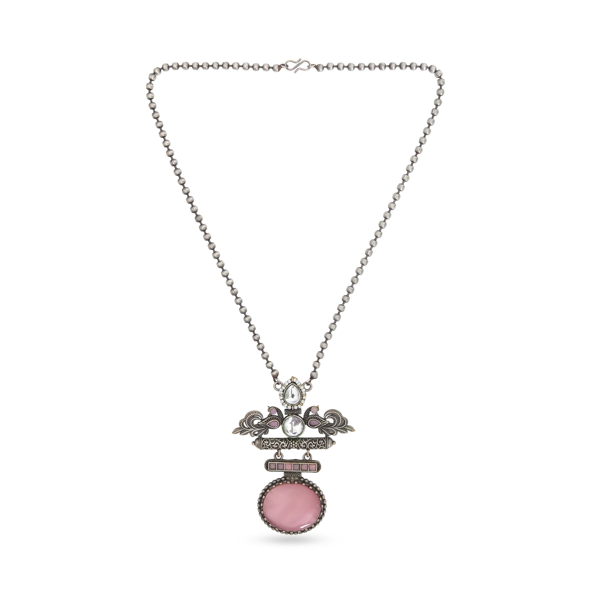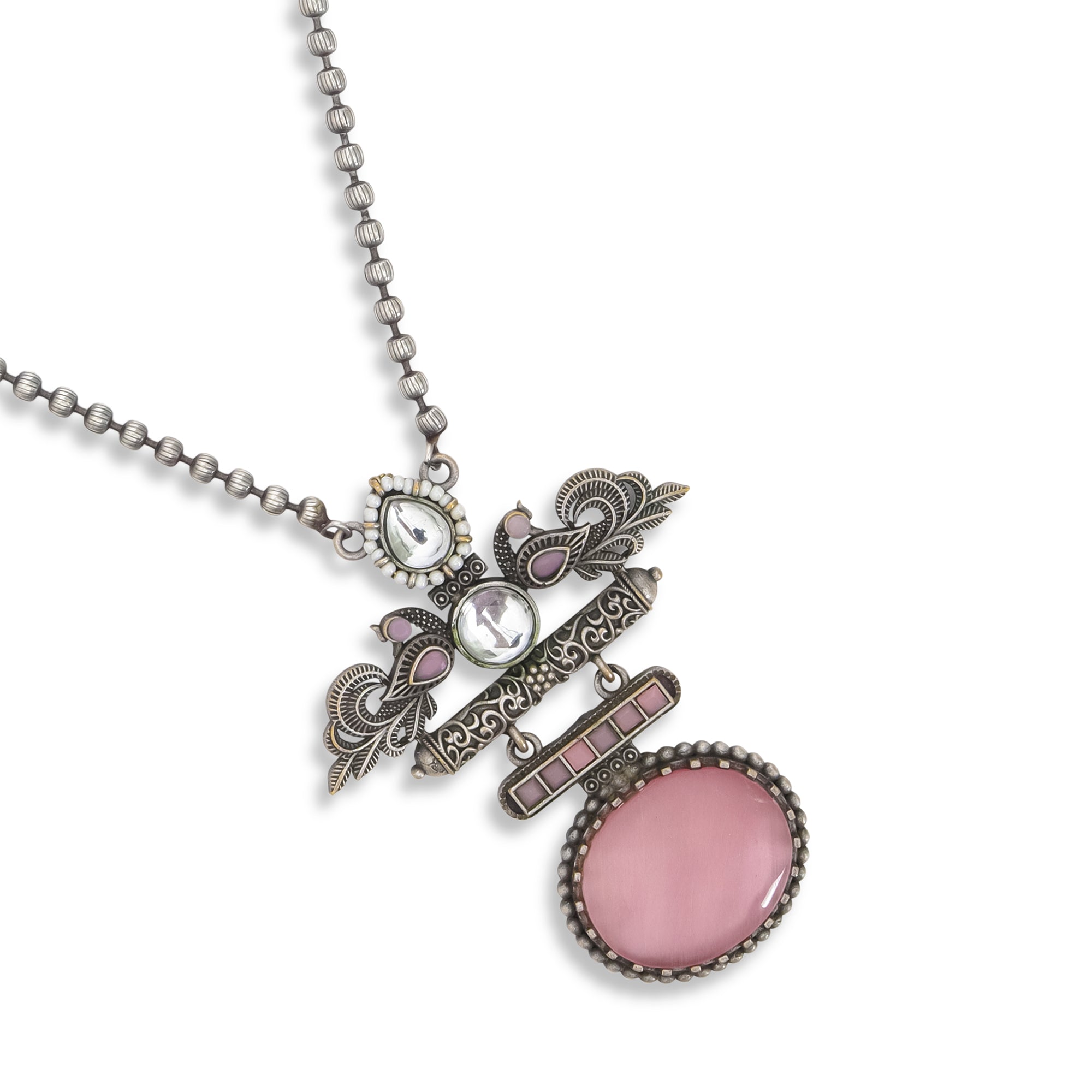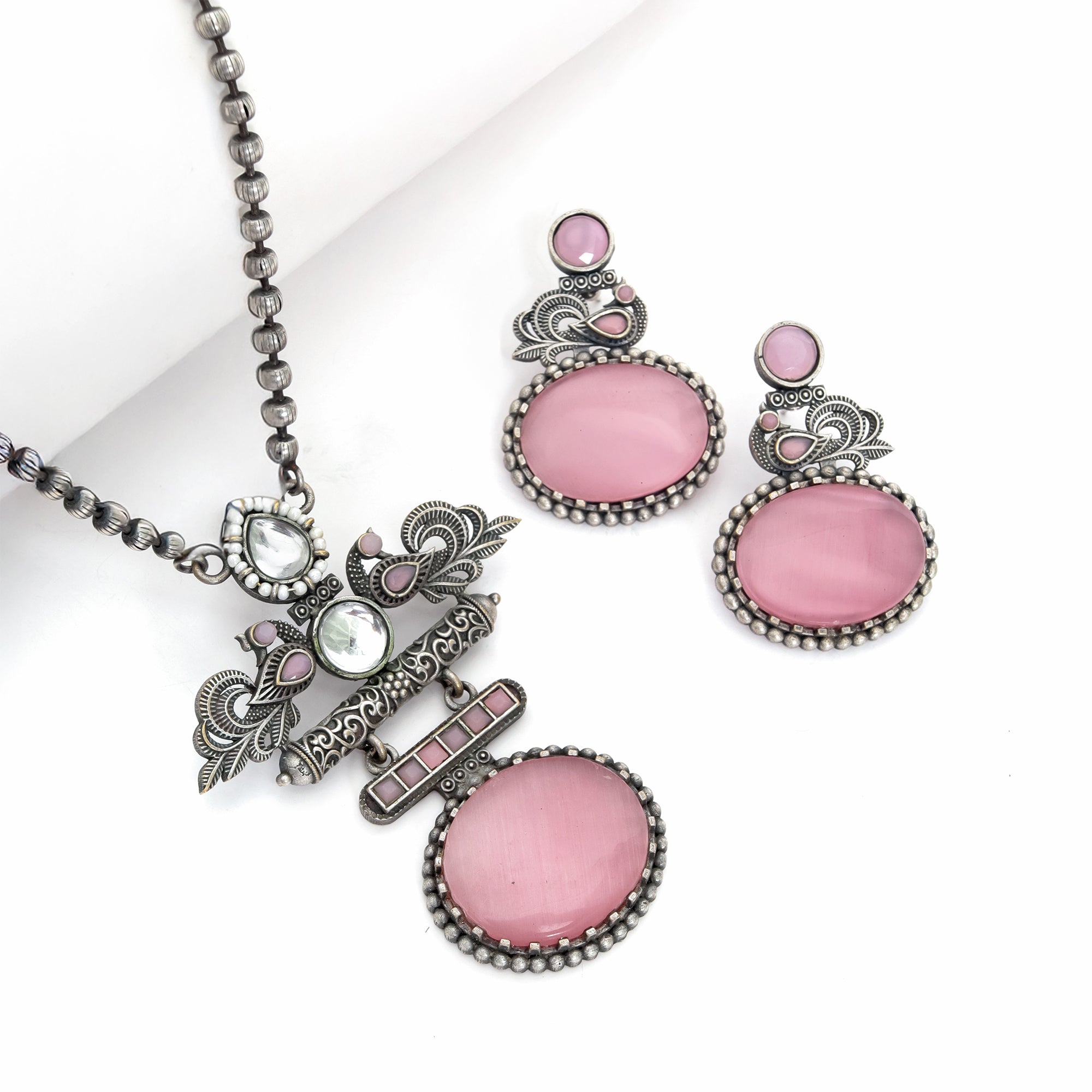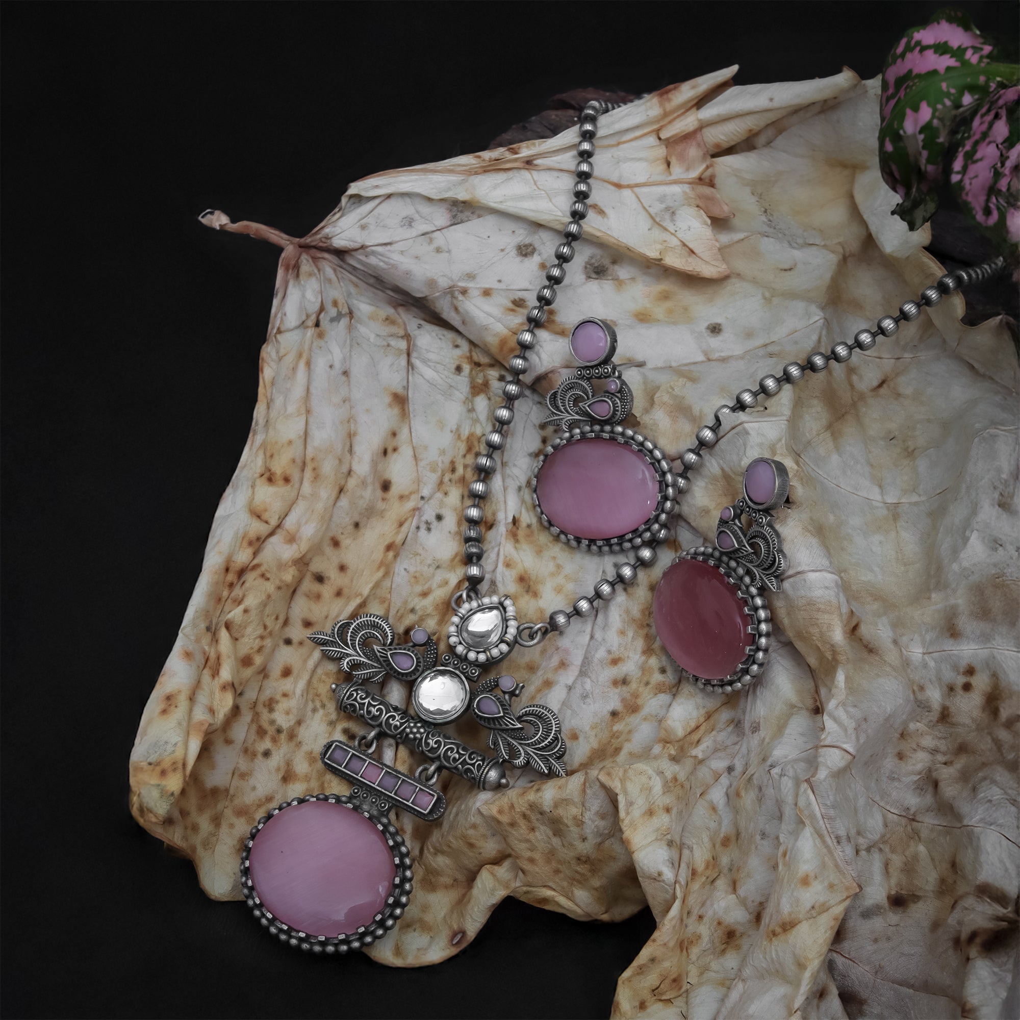Soft blush pink meets oxidized silver in this ultra-feminine yet striking necklace set. With floral and peacock-inspired detailing surrounding large...