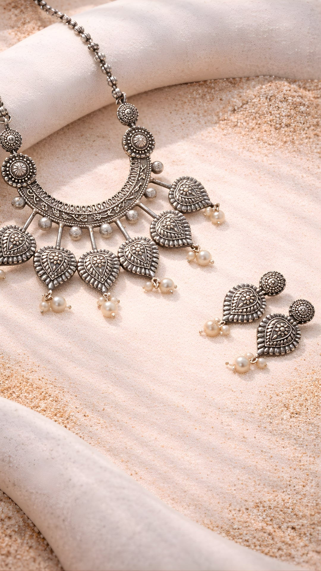 The Chandrika Manjari Set from the Rama Collection is a radiant blend of moonlight charm and floral artistry. Crafted in oxidized silver, the necklace features a bold crescent base symbolizing the eternal moon, adorned with heart-shaped motifs inspired by blooming manjari (flower buds) and peepal leaves. Each motif is etched with intricate tribal detailing and finished with delicate pearl danglers that sway with movement, adding grace and rhythm to the design.