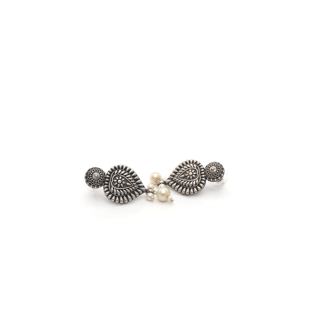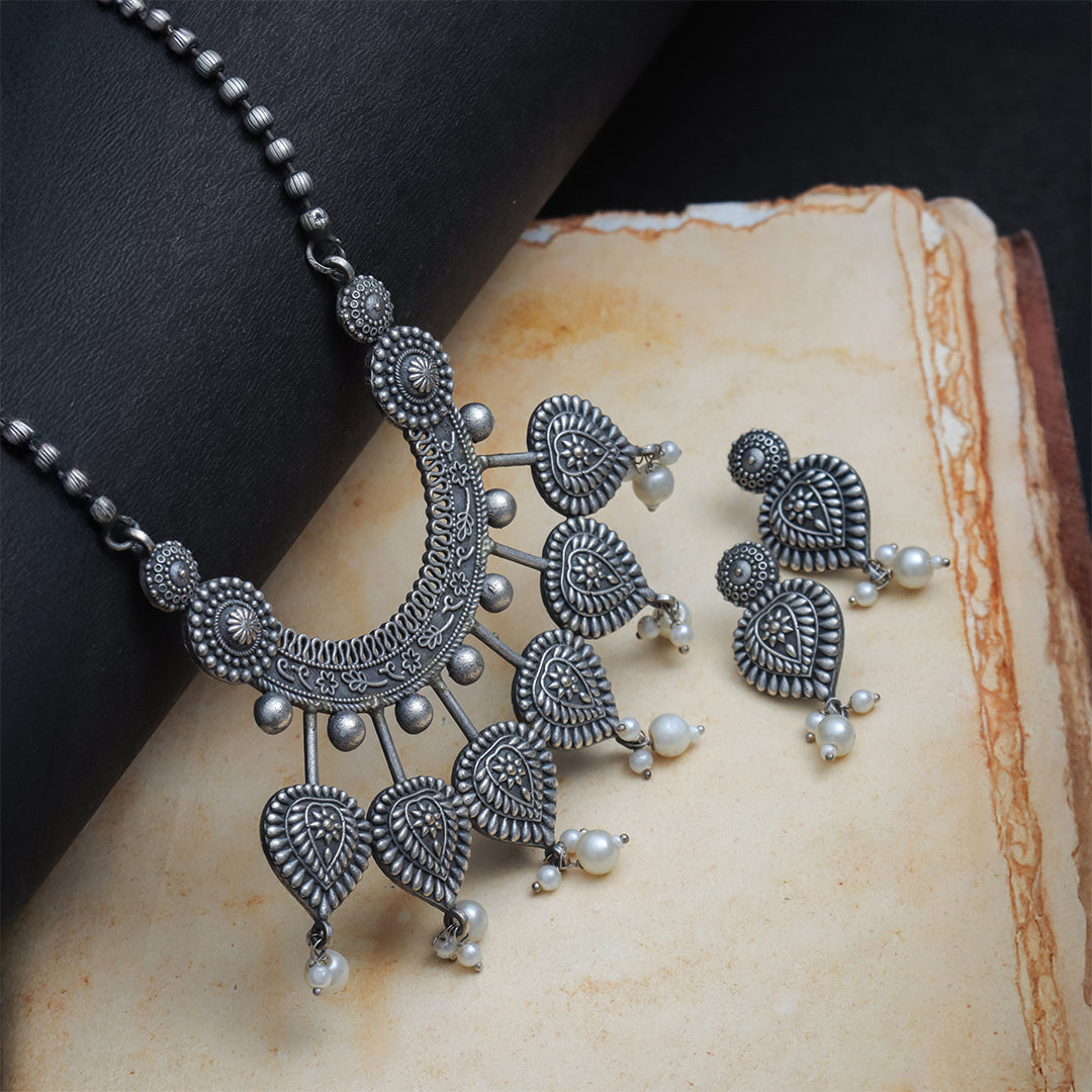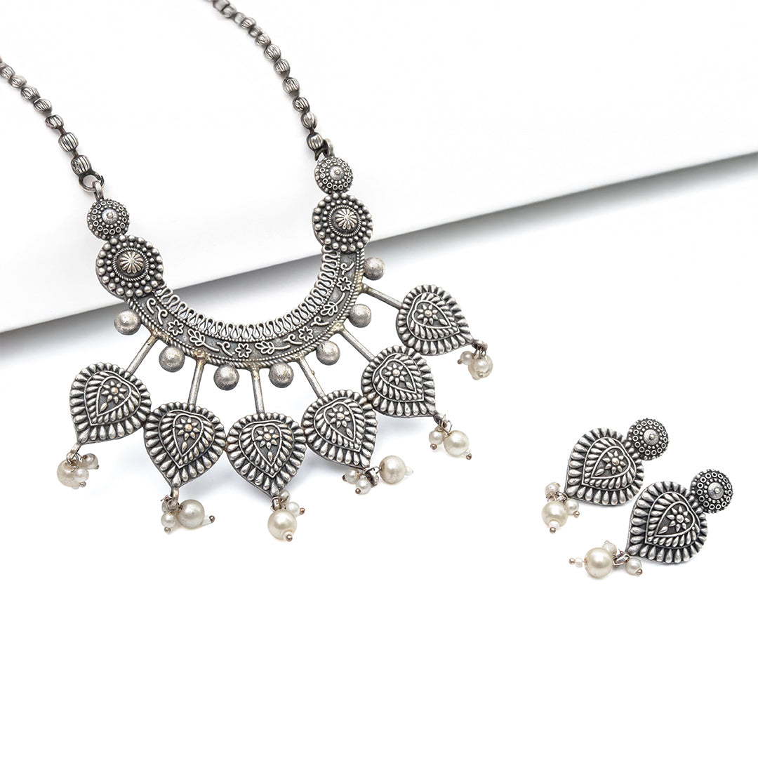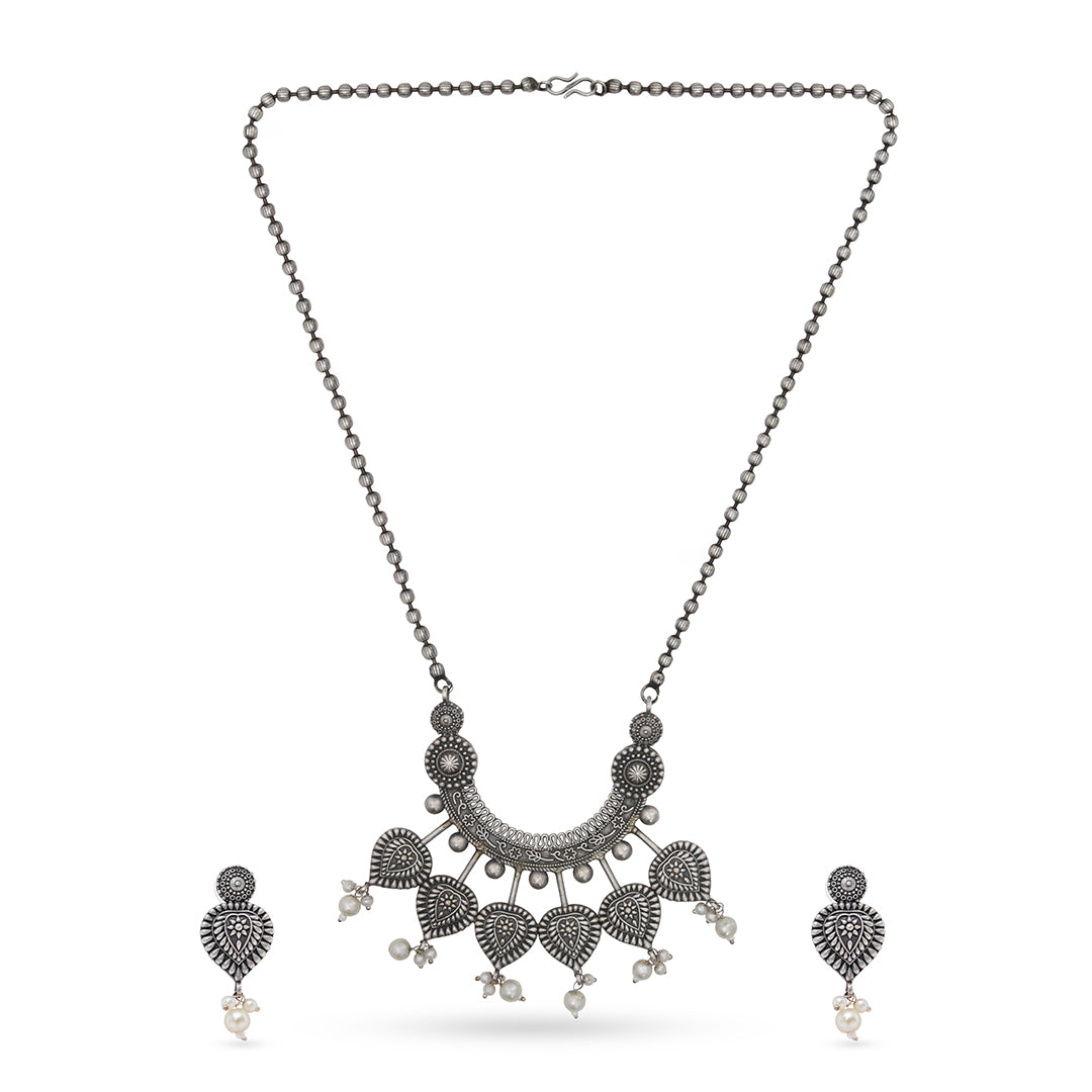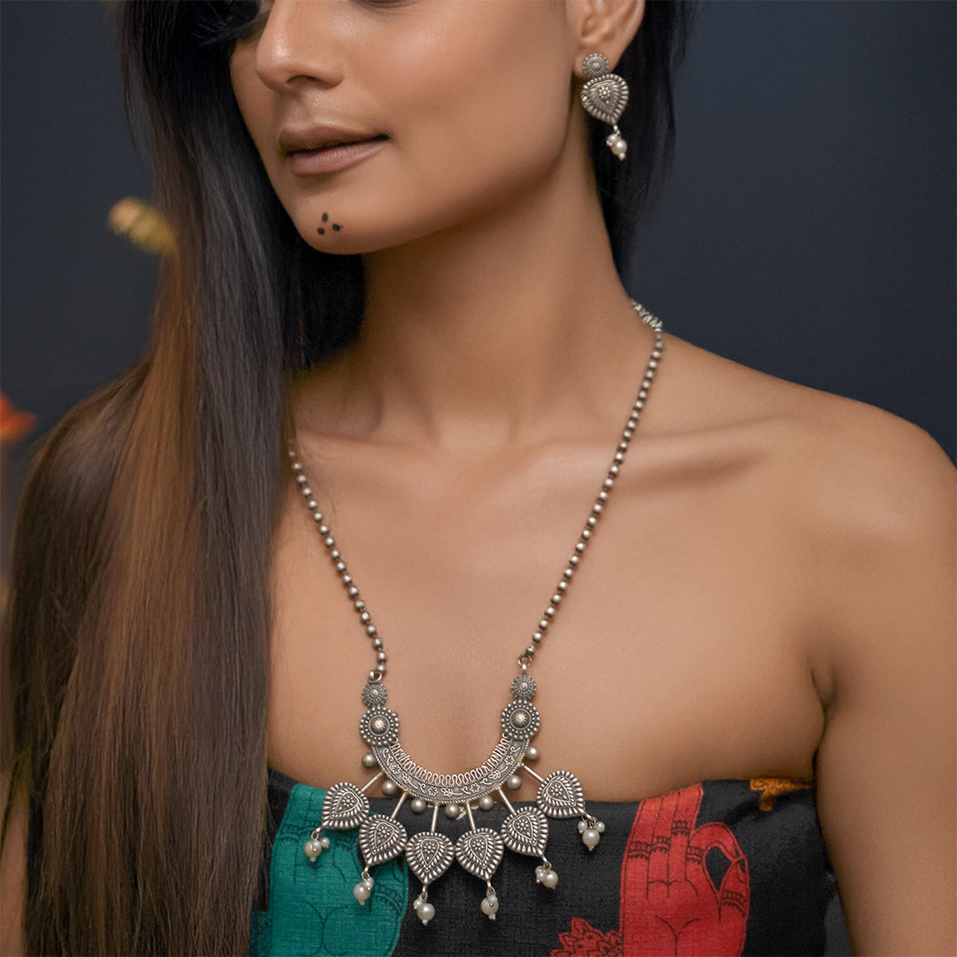 The Chandrika Manjari Set from the Rama Collection is a radiant blend of moonlight charm and floral artistry. Crafted in oxidized...