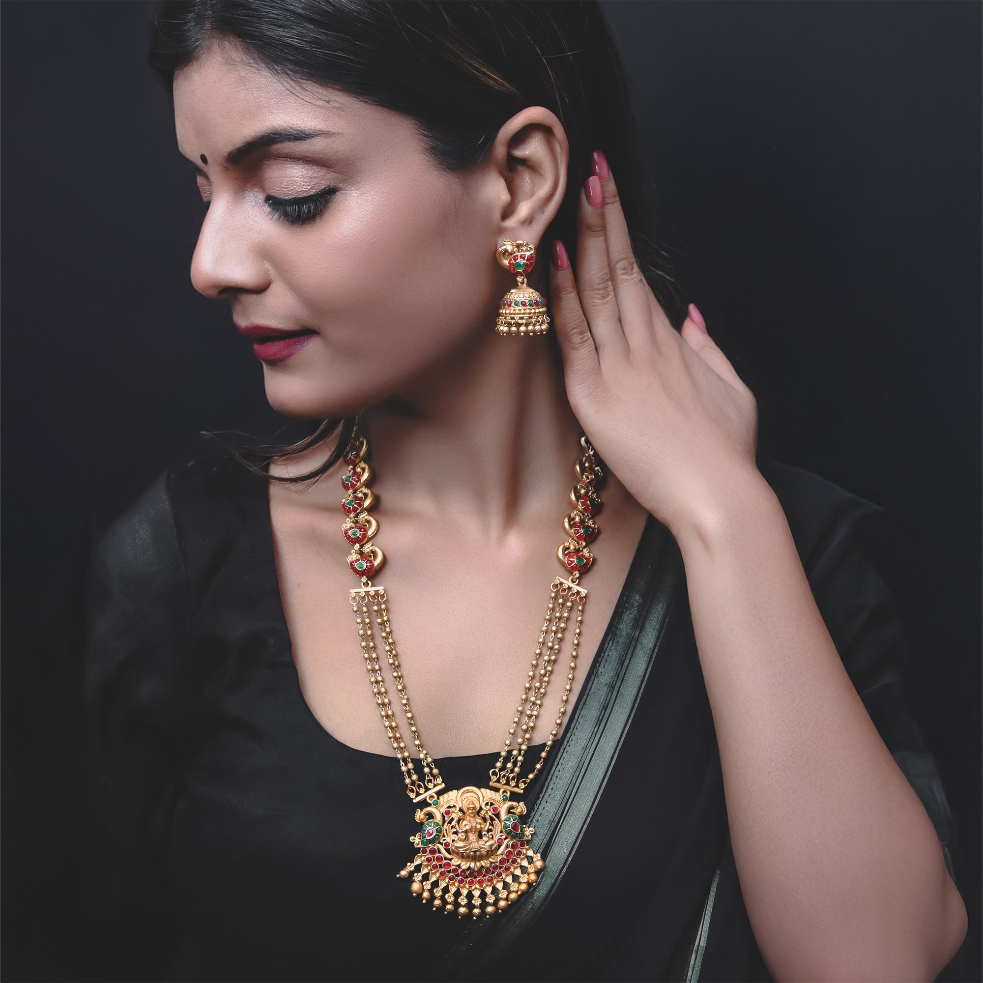 The layered chain structure with traditional bead detailing adds a royal silhouette, while the matching jhumki-style earrings complete the ensemble with grandeur. Every element of this set speaks of temple heritage, cultural depth, and timeless craftsmanship.