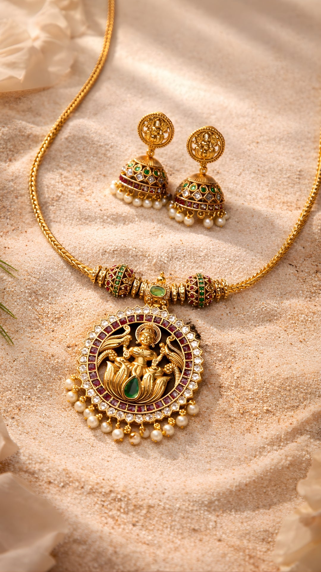 Rooted in tradition, the Devika Set from our Treasure Collection is a divine expression of South Indian artistry. This temple-style...