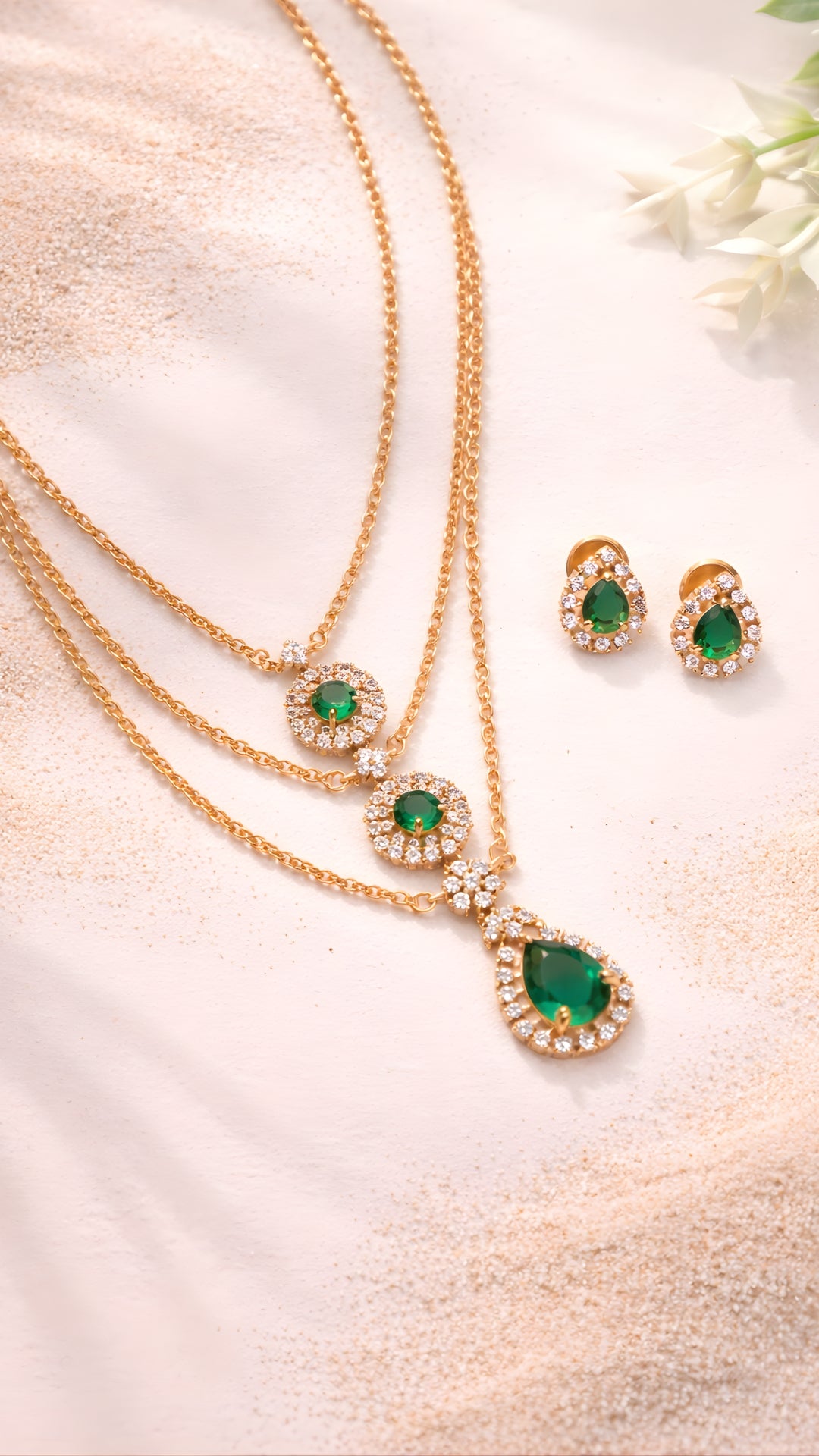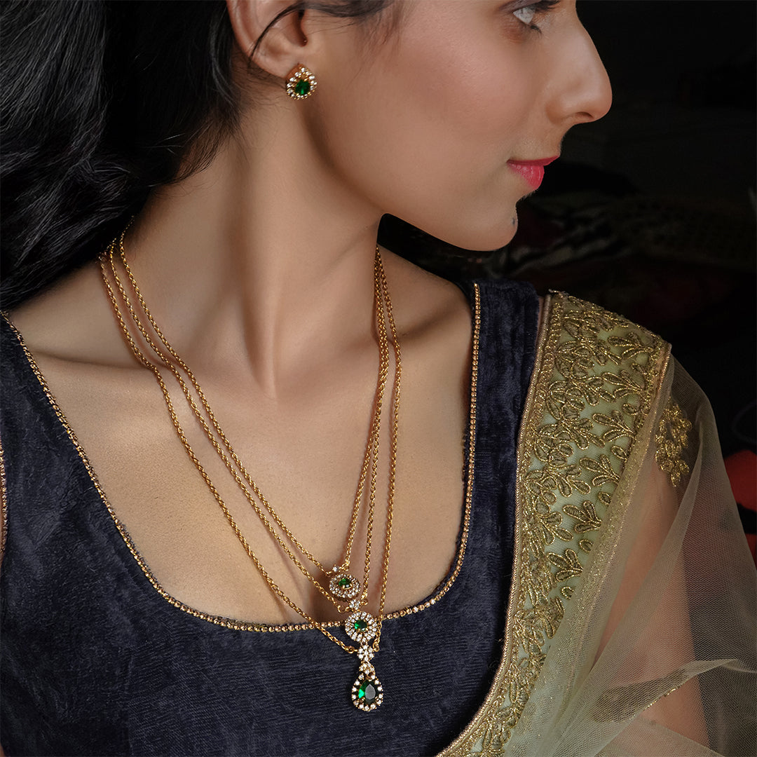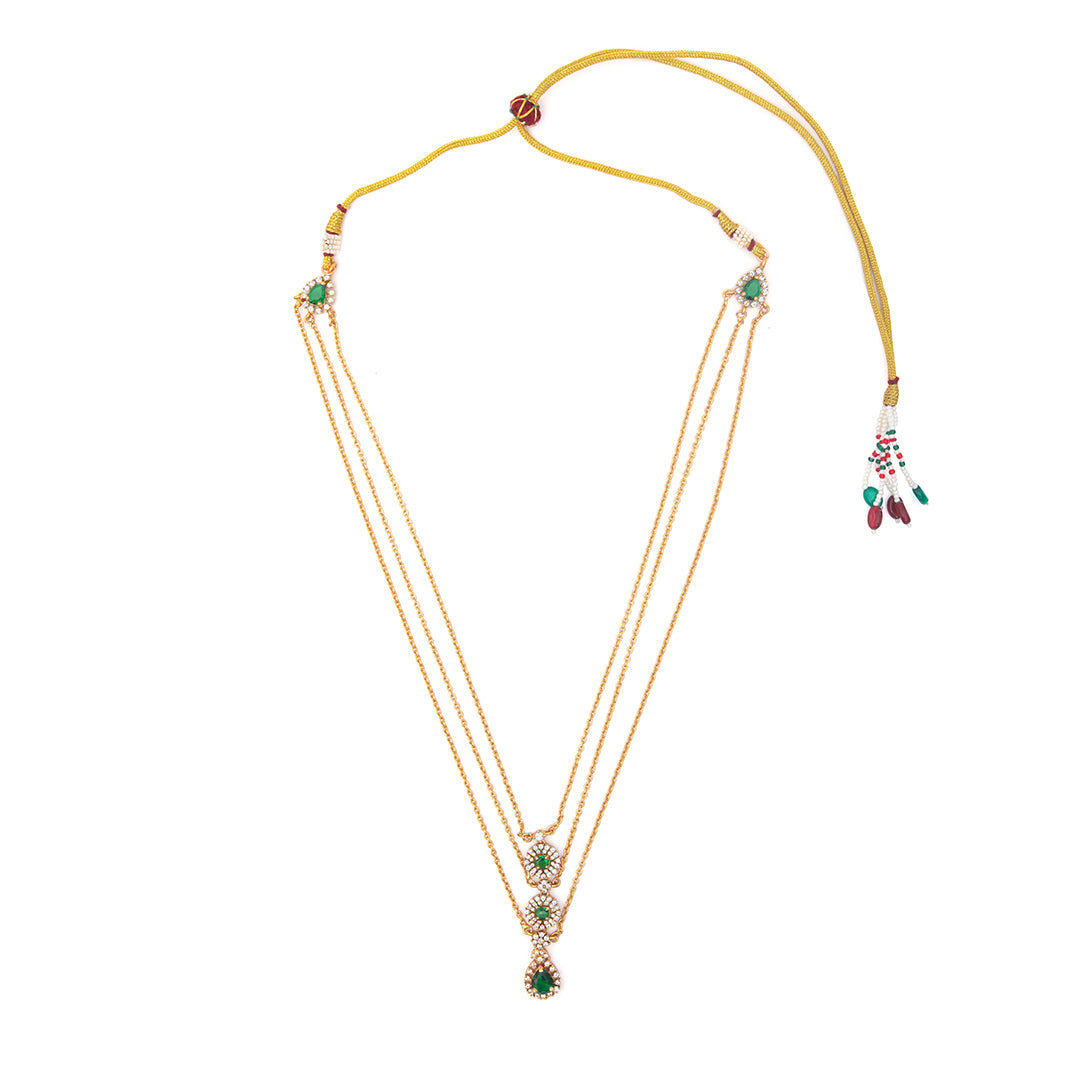 The Emerald Surmayi Haar is a triple-layered necklace with vibrant green stone pendants, set on soft golden dori threads. Elegant...