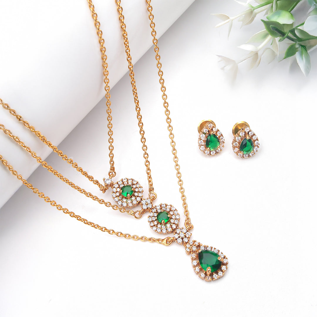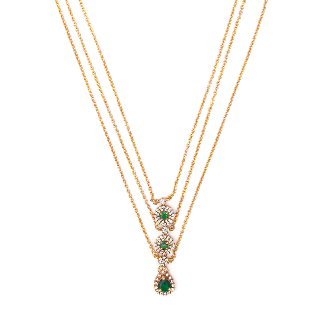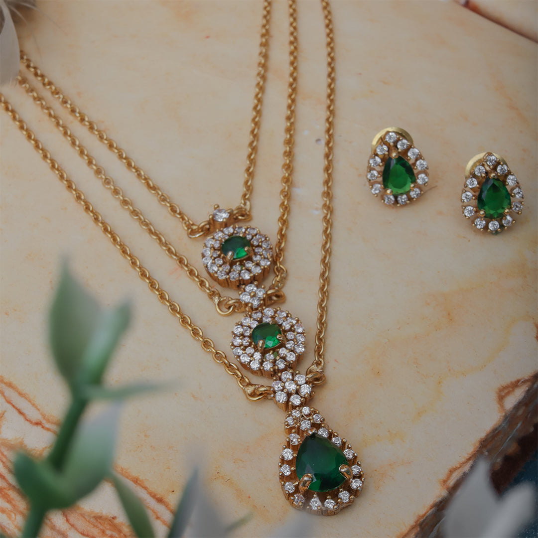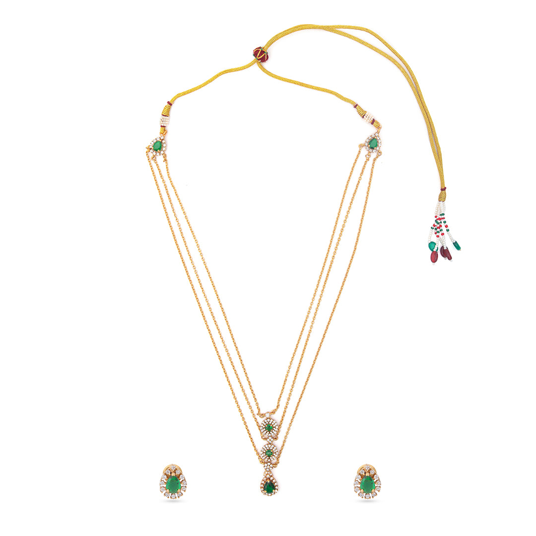The Emerald Surmayi Haar is a triple-layered necklace with vibrant green stone pendants, set on soft golden dori threads. Elegant...