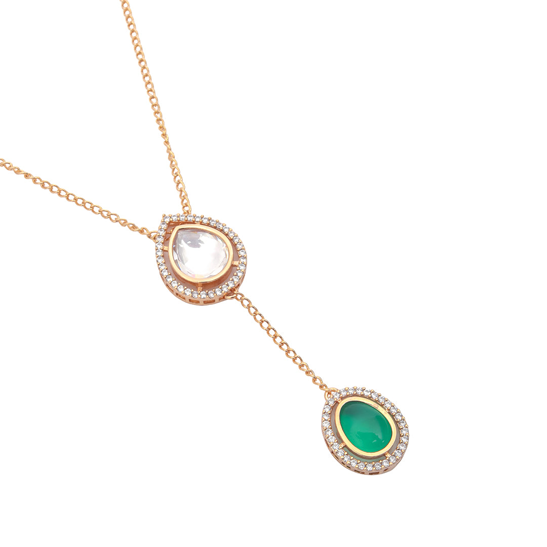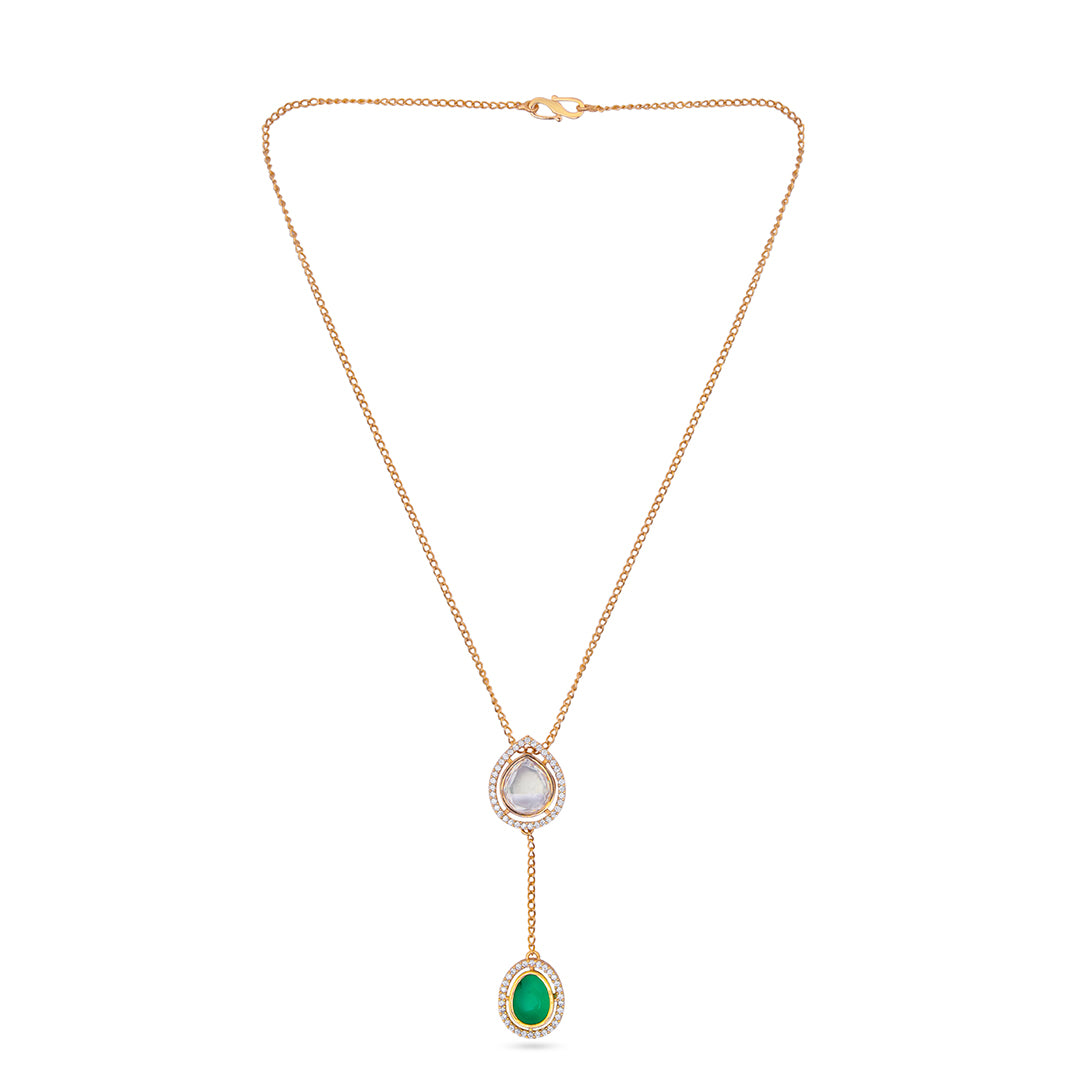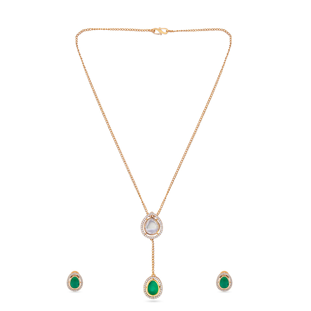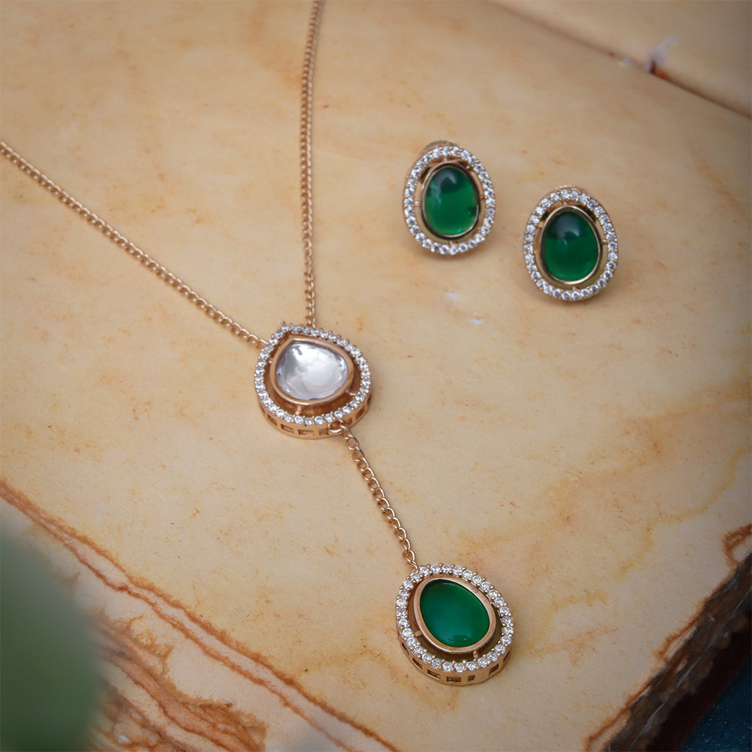 Modern minimalism meets classic charm in the Emerald Whisper Necklace Set. Featuring a dual-drop pendant with green and white stones,...