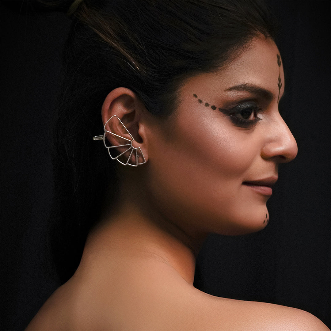 Boldly architectural and artistically inspired, the Fanriksha Earrings derive their form from the traditional hand-held fan—symbolizing grace, rhythm, and feminine...