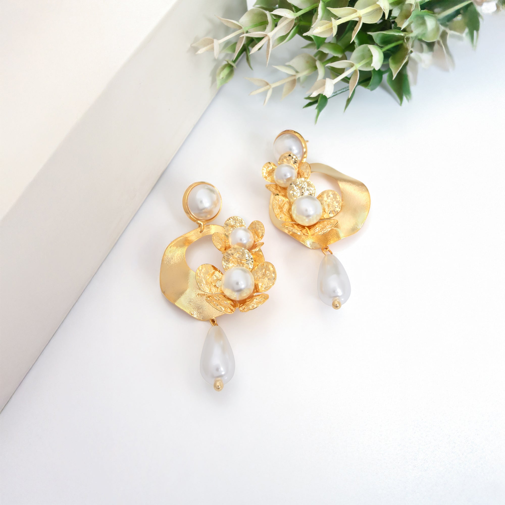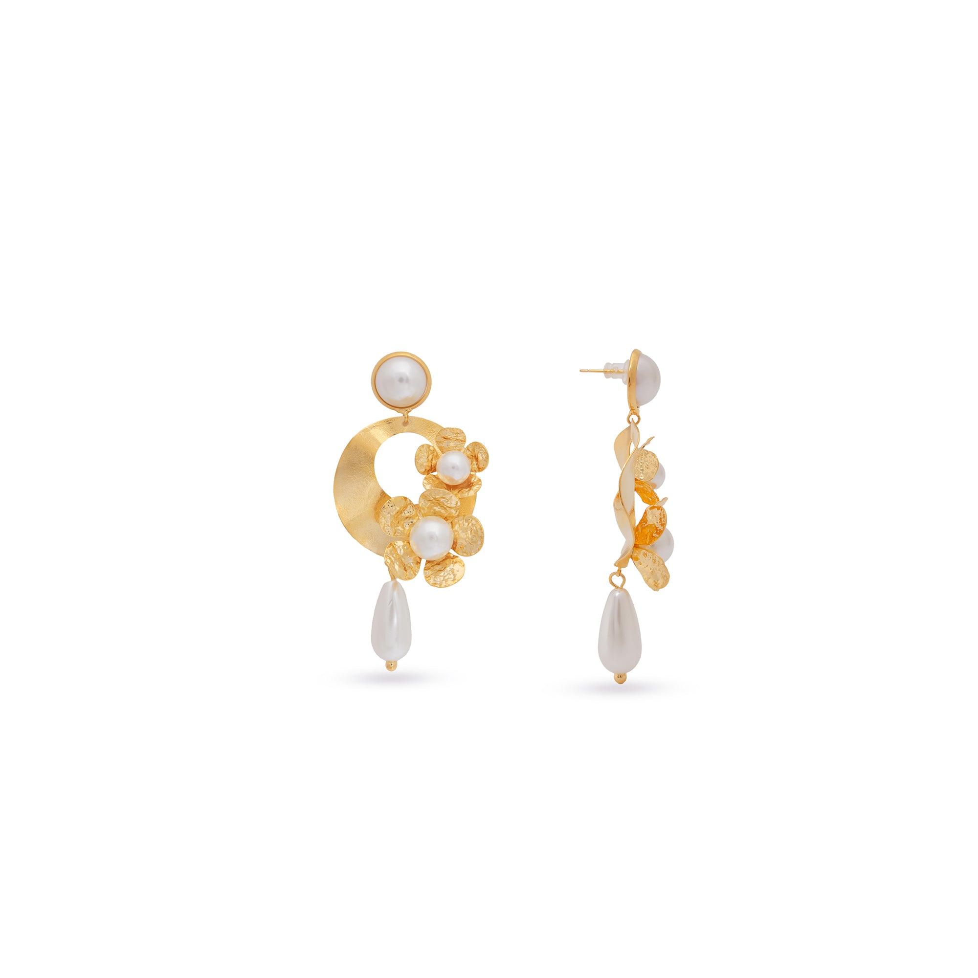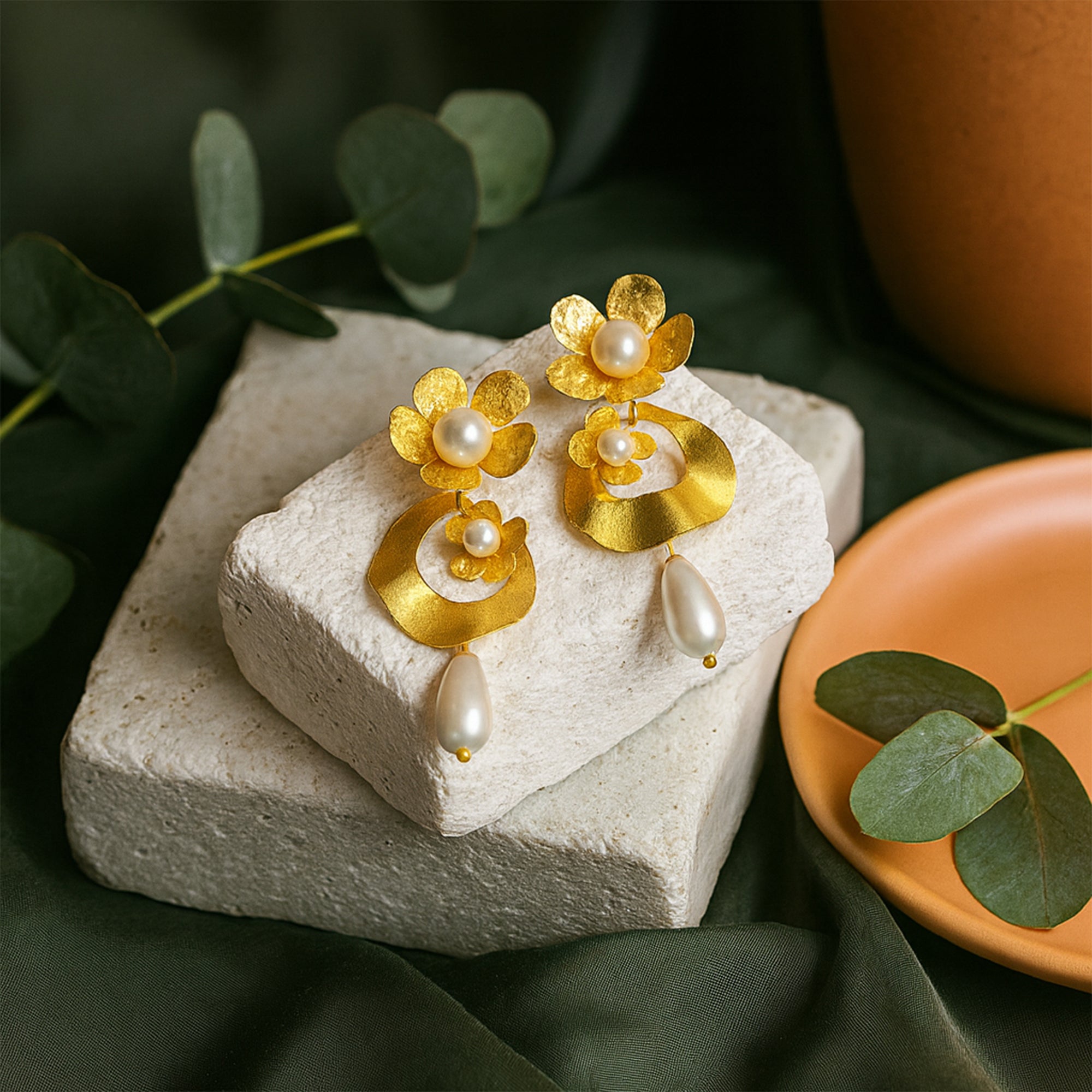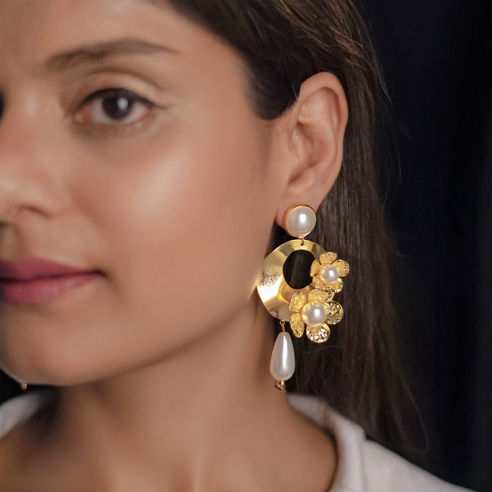 The Floral Pearl Cluster Earrings celebrate artistry and grandeur. Designed with layered metallic petals and clusters of luminous pearls, these...