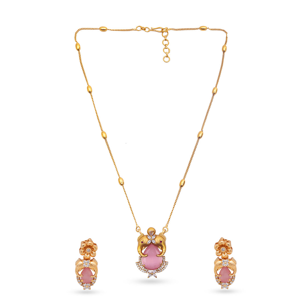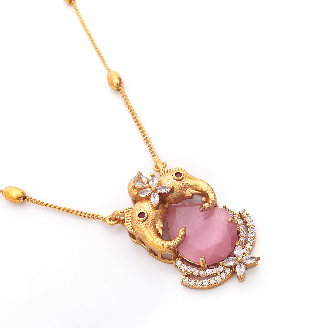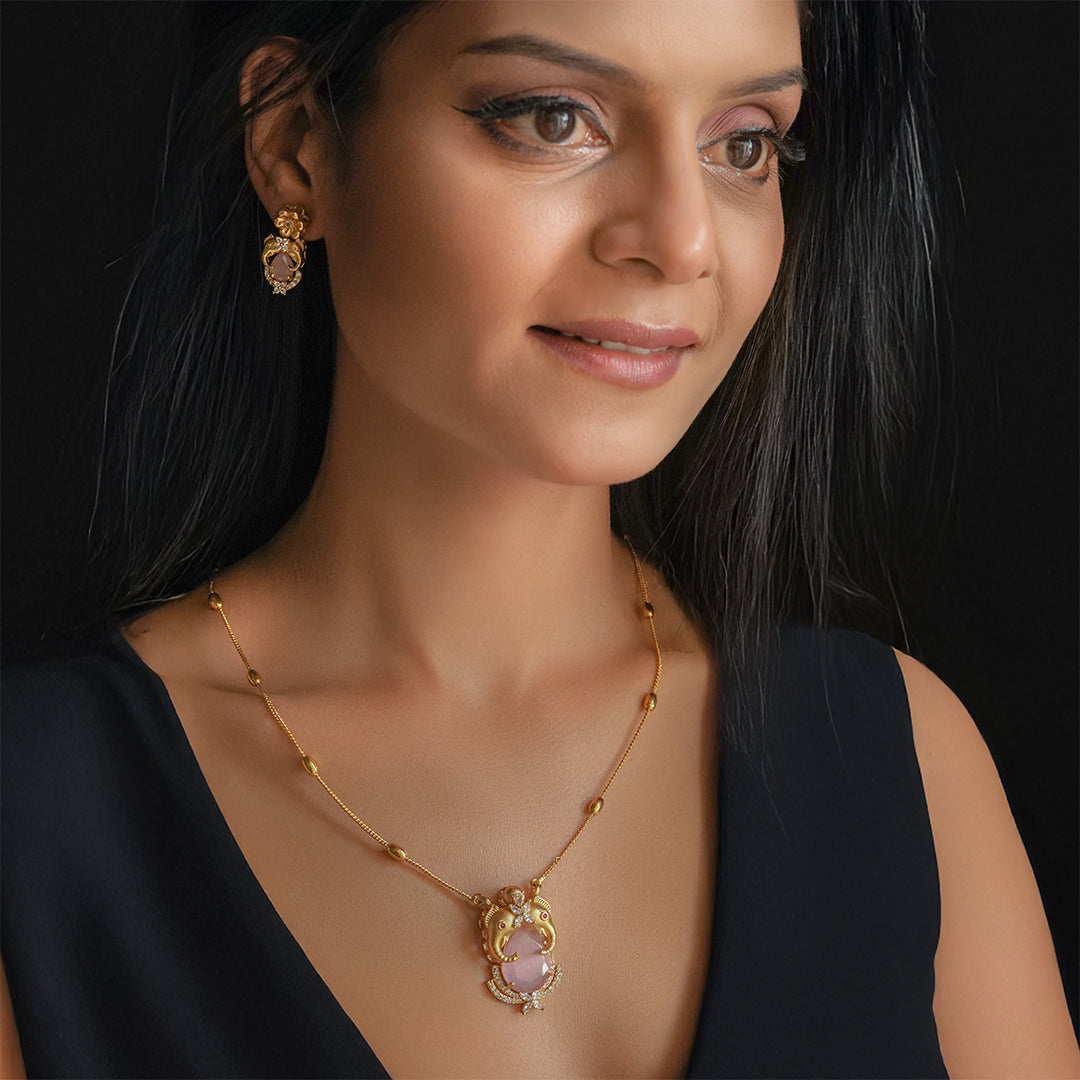 Celebrate grace and grandeur with the Gulab Gajgamini Set. Twin elephants with their trunks delicately holding a rose-pink cabochon gemstone...