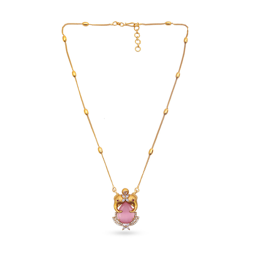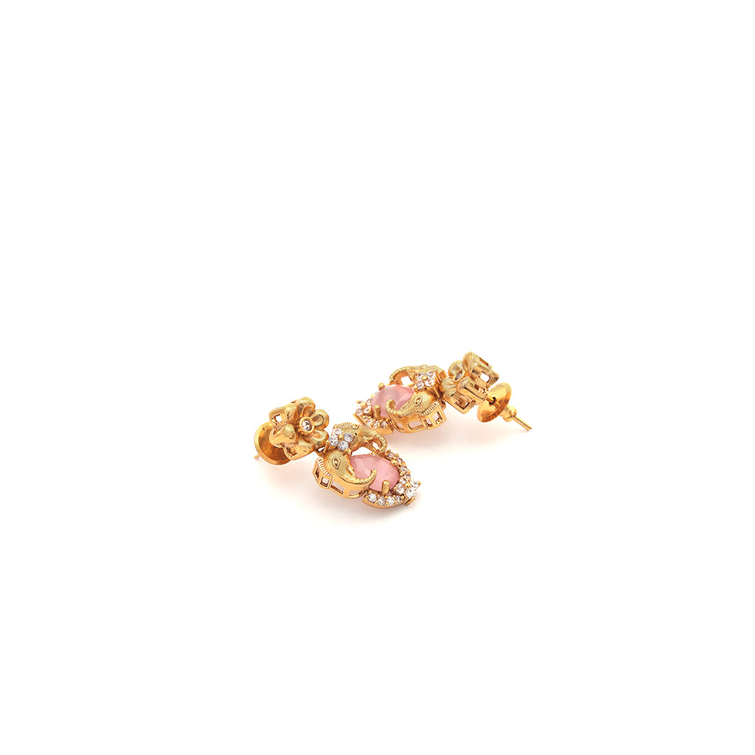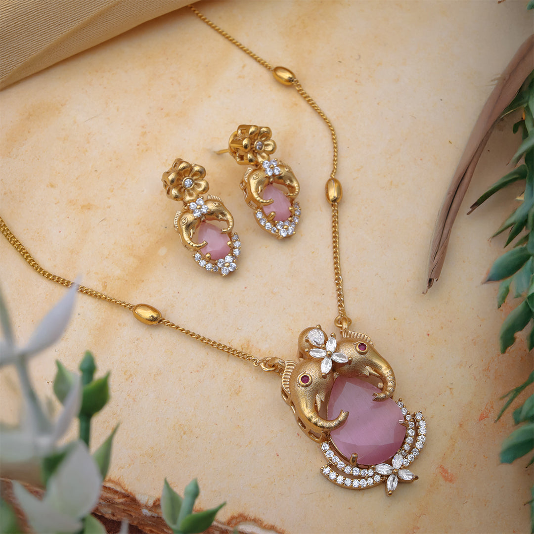 Celebrate grace and grandeur with the Gulab Gajgamini Set. Twin elephants with their trunks delicately holding a rose-pink cabochon gemstone...