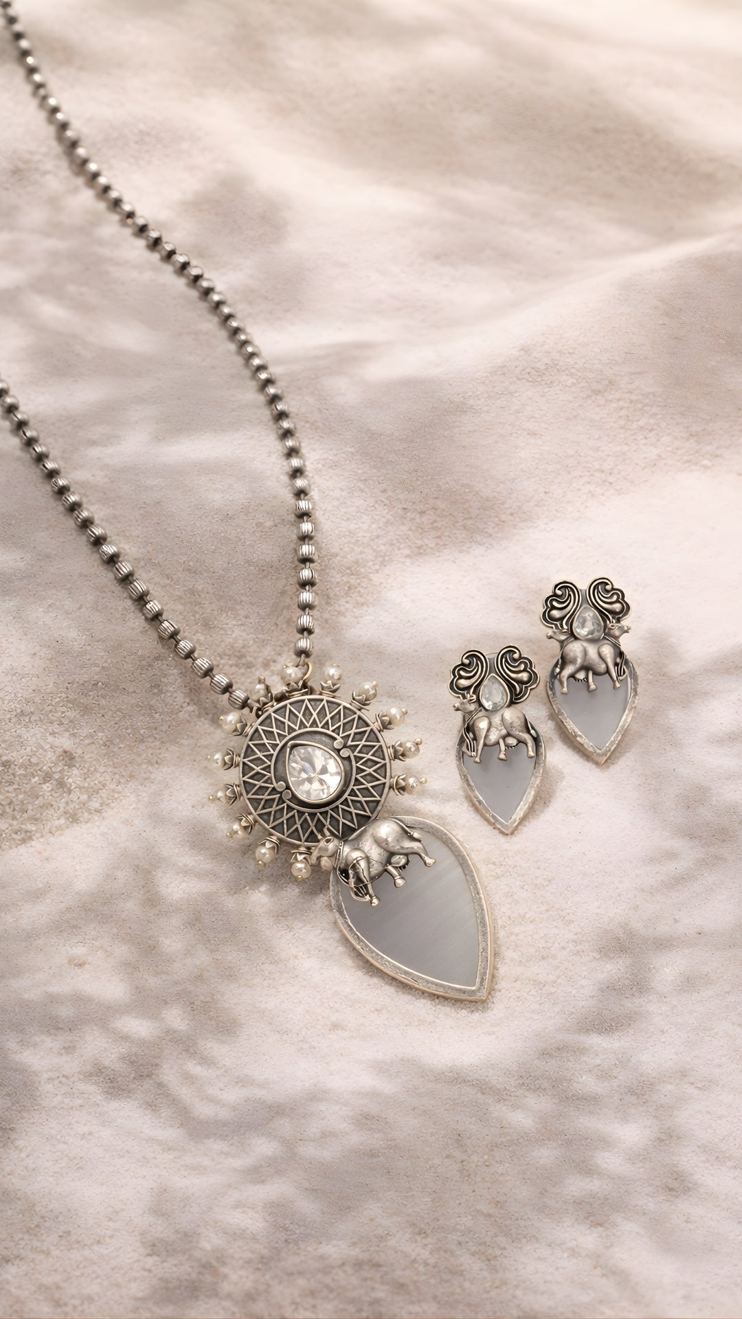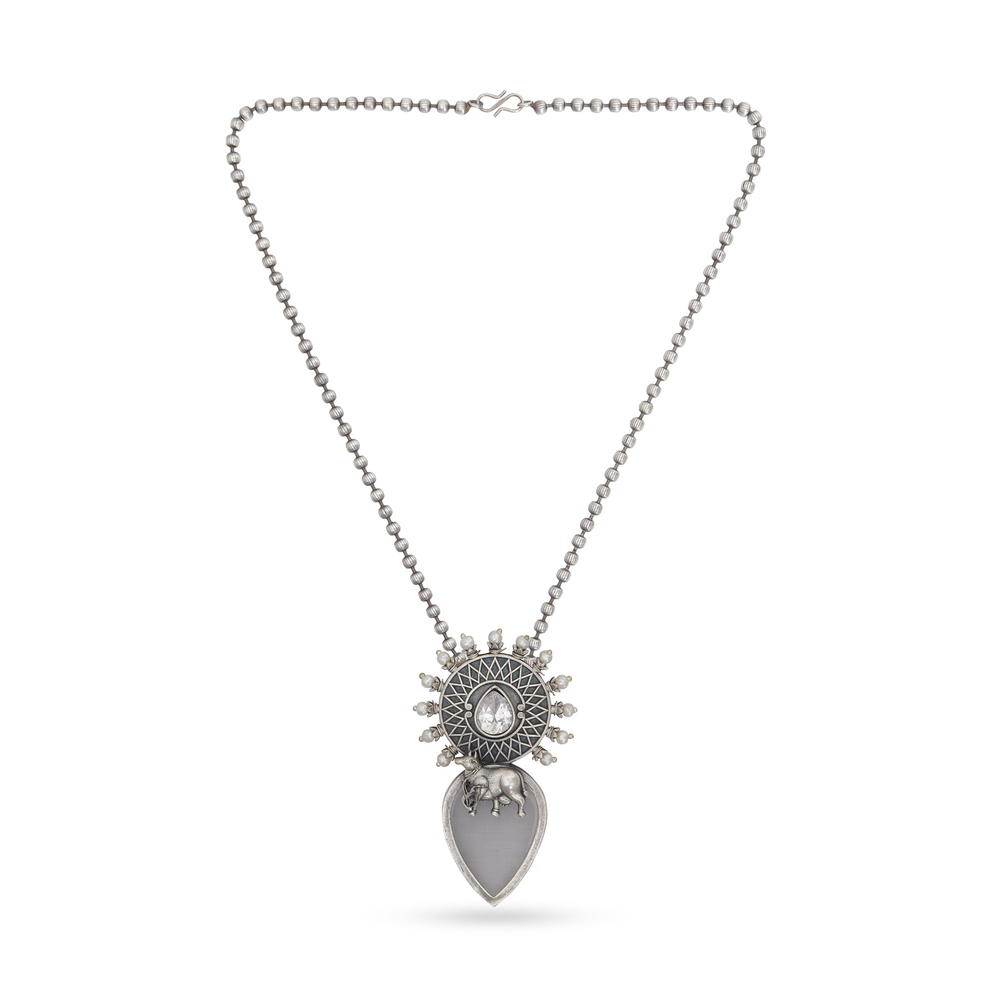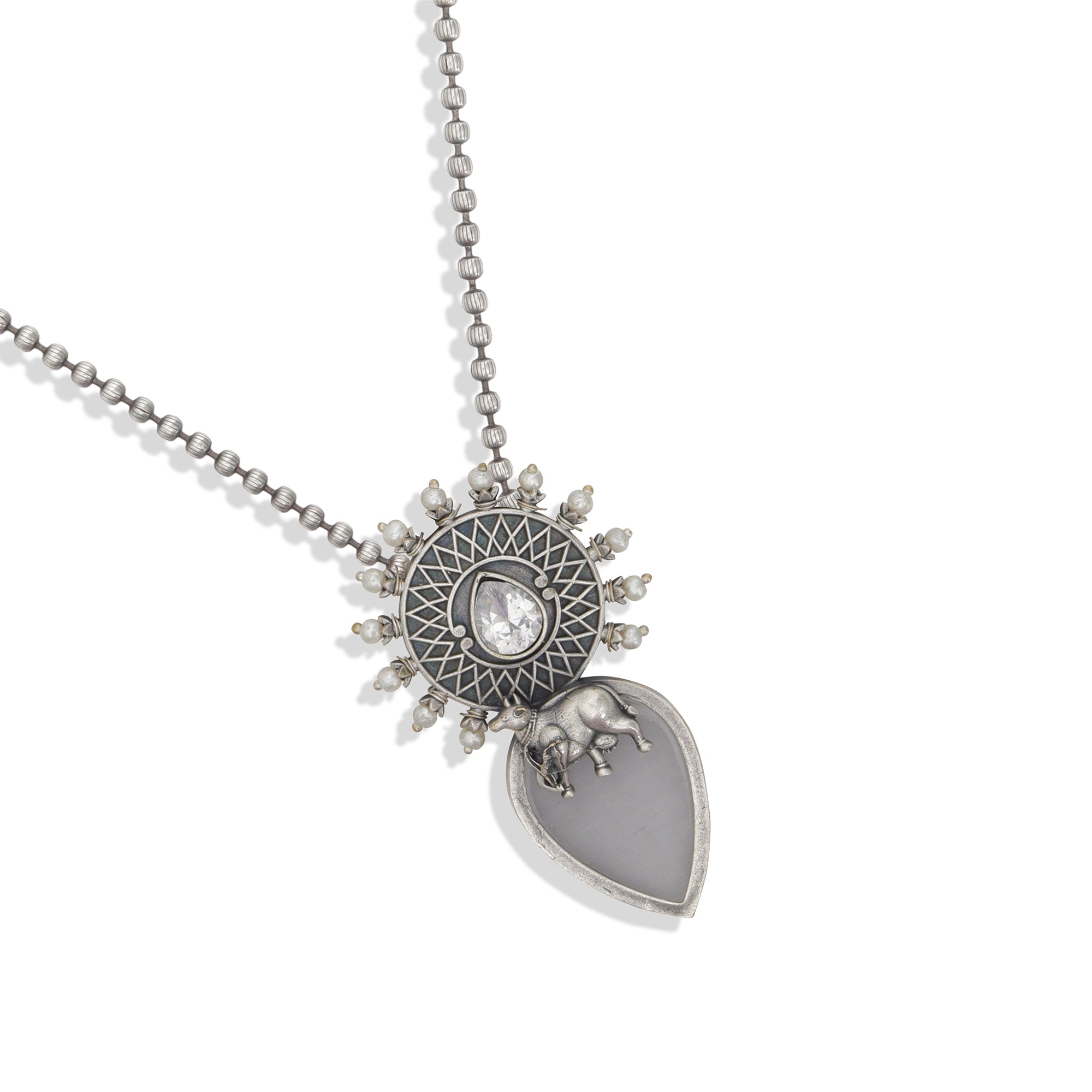 This piece blends mythology and modern elegance. The necklace features a circular sunburst pendant with a crystal center, framed by...
