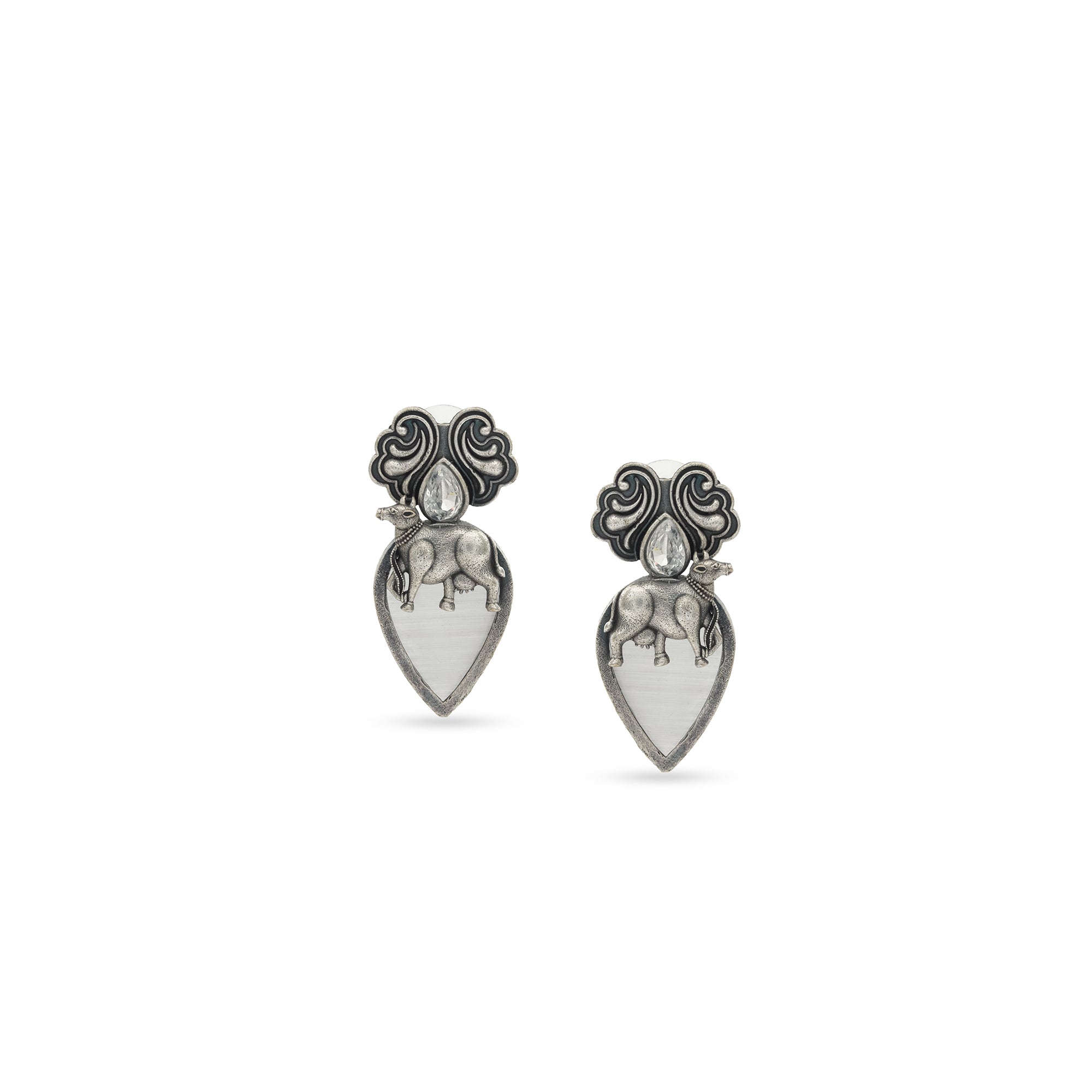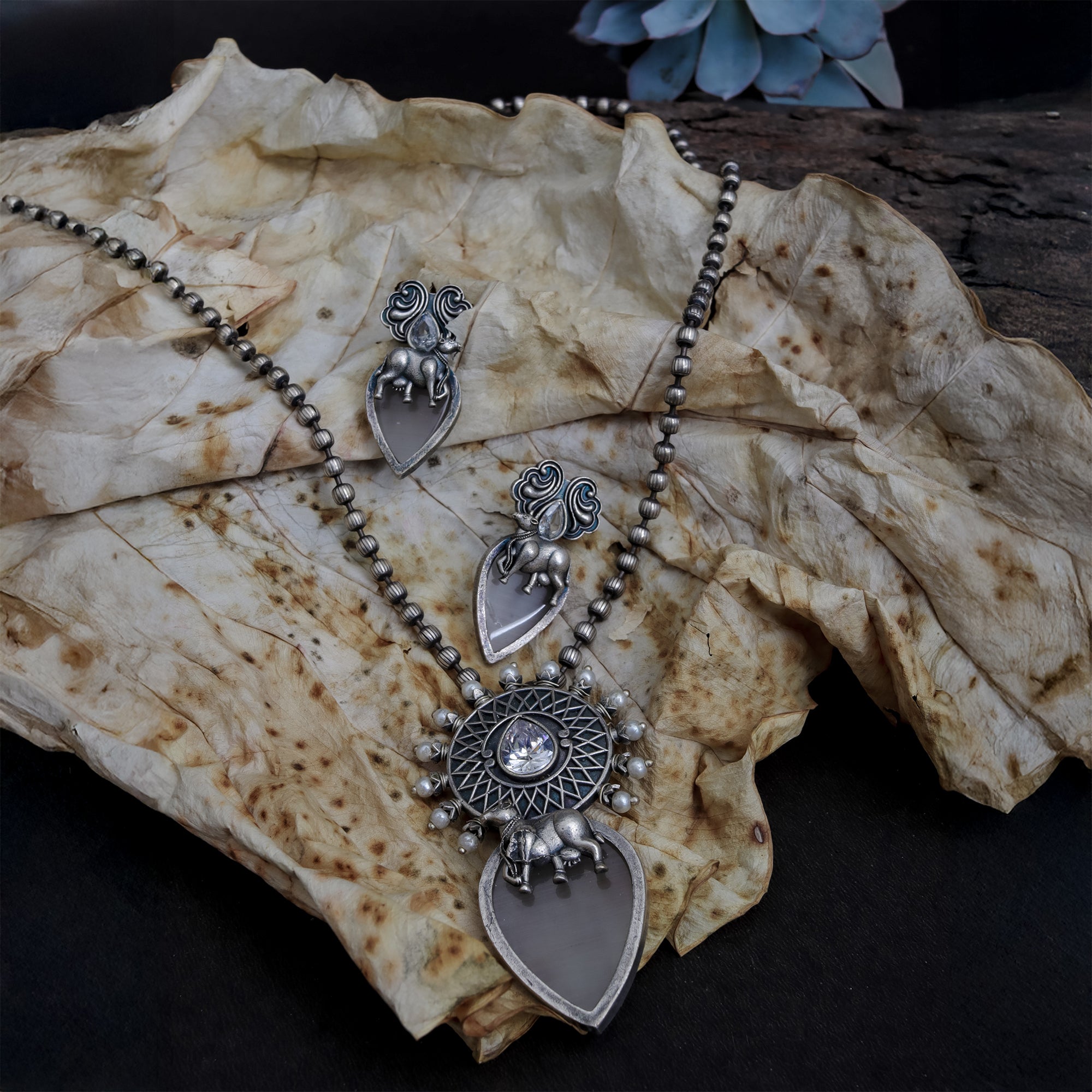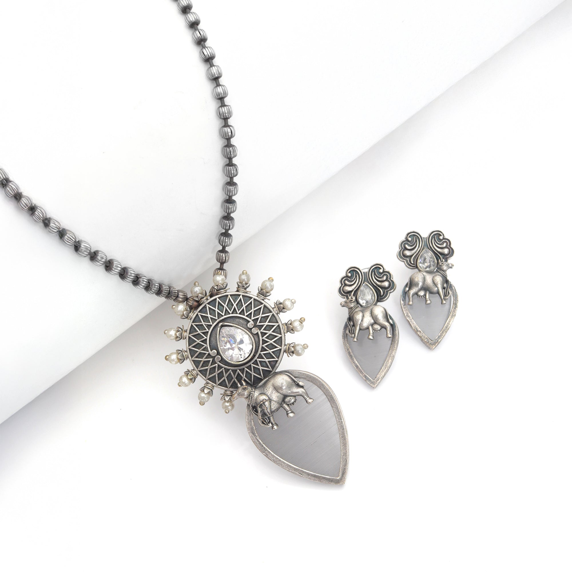 This piece blends mythology and modern elegance. The necklace features a circular sunburst pendant with a crystal center, framed by...