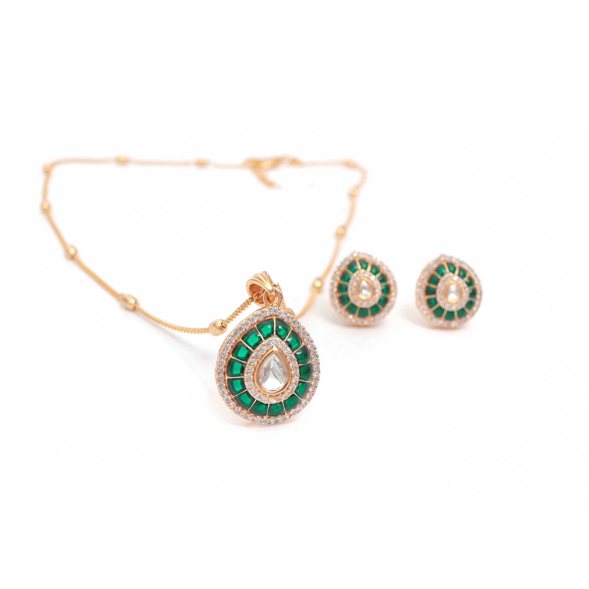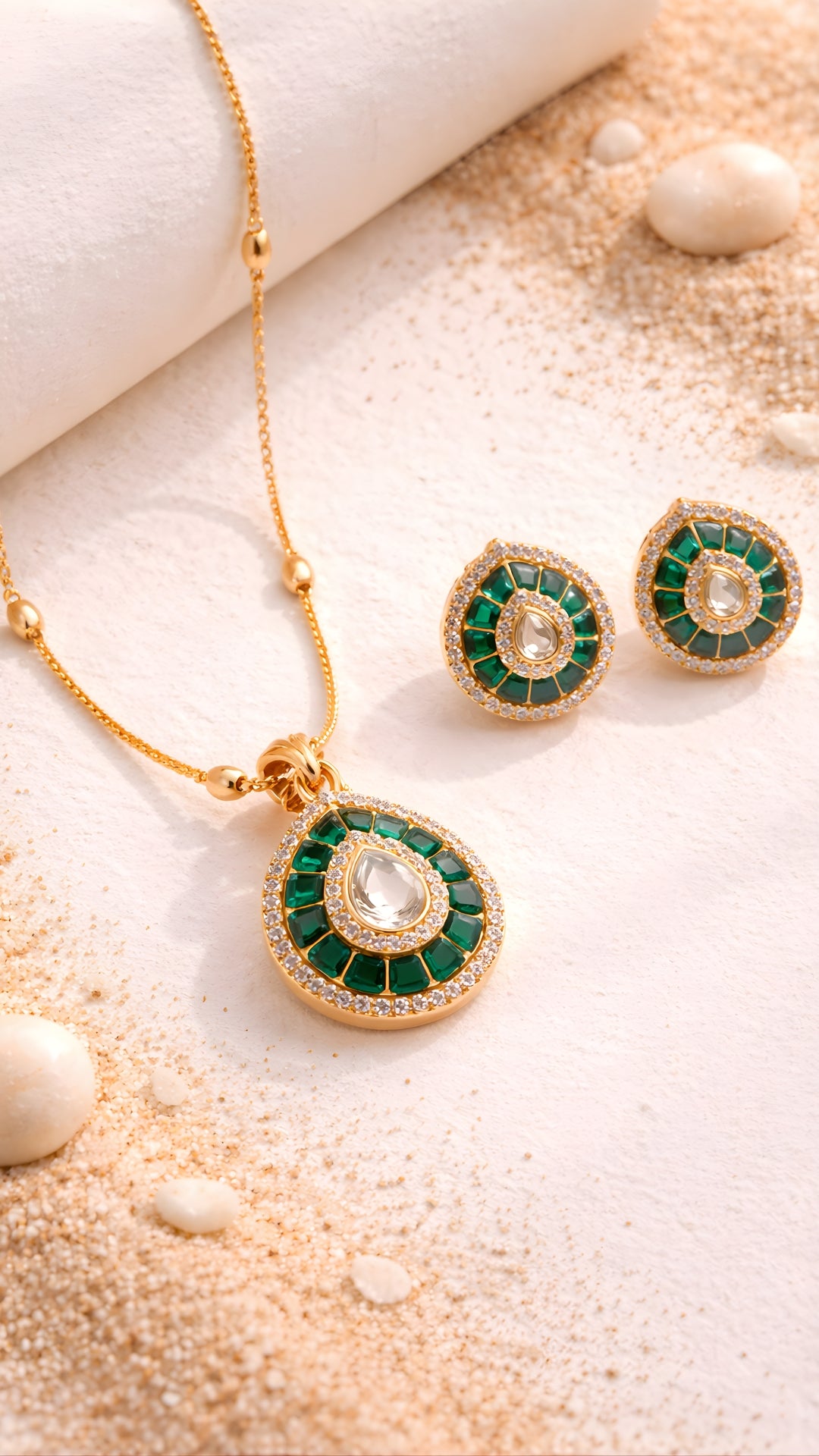 This Majestic Emerald Royale Drop Set features a layered teardrop design enhanced with emerald green stones and a radiant kundan...