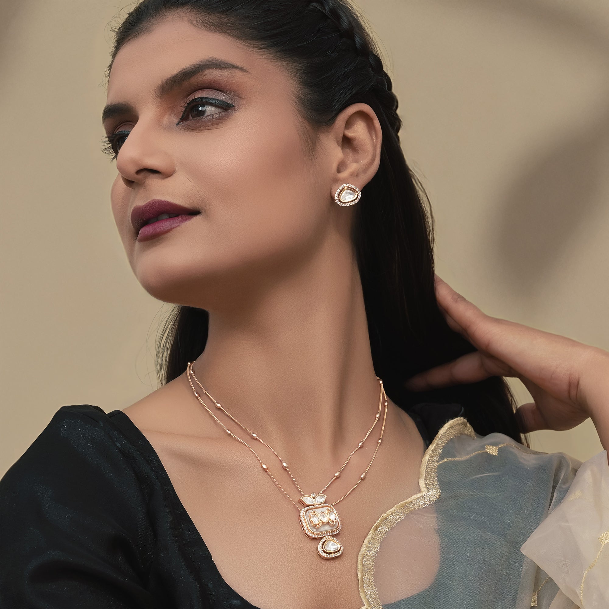 The Majestic Ivory Blossom Set features a delicate floral-inspired design crafted in soft ivory tones with kundan highlights. Elegant and...