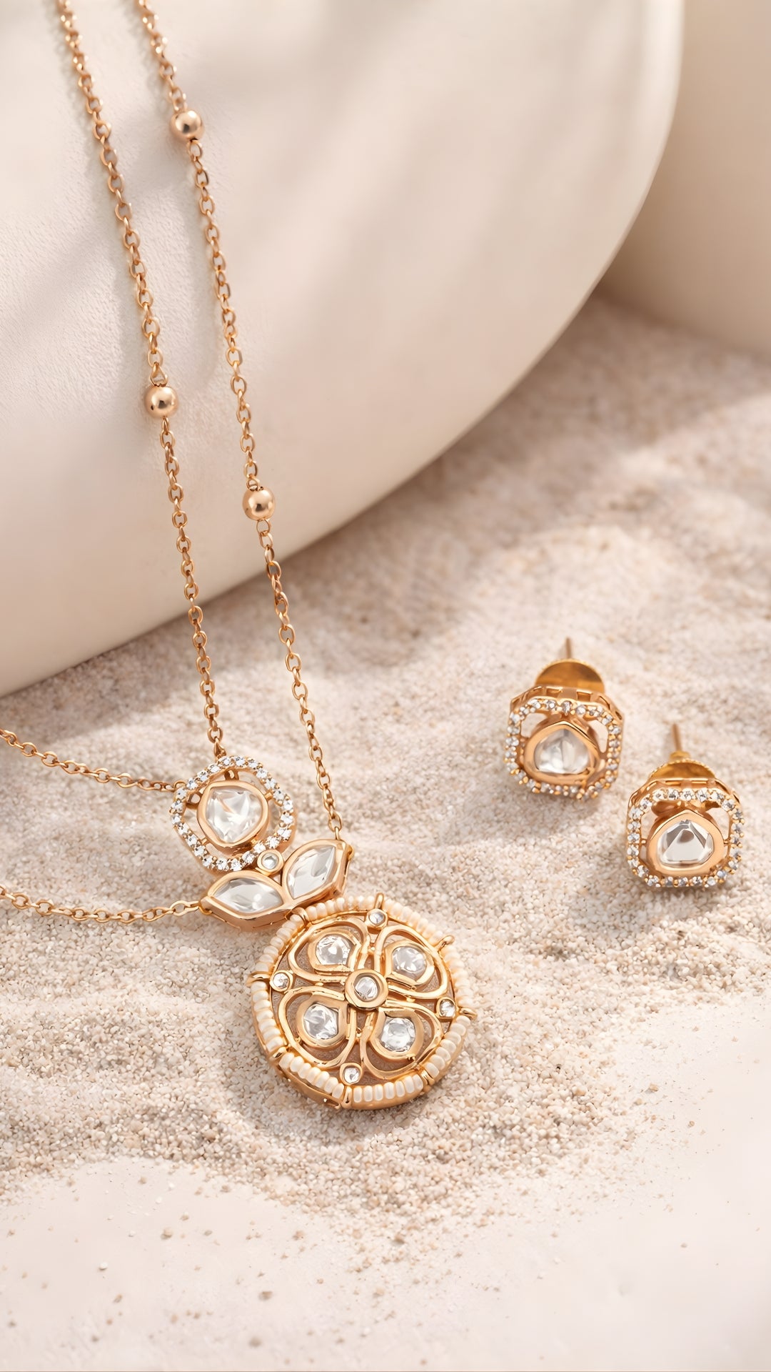Inspired by traditional mandala motifs, the Majestic Pearl Mandala Set showcases intricate kundan work accented with soft pearl detailing. The...