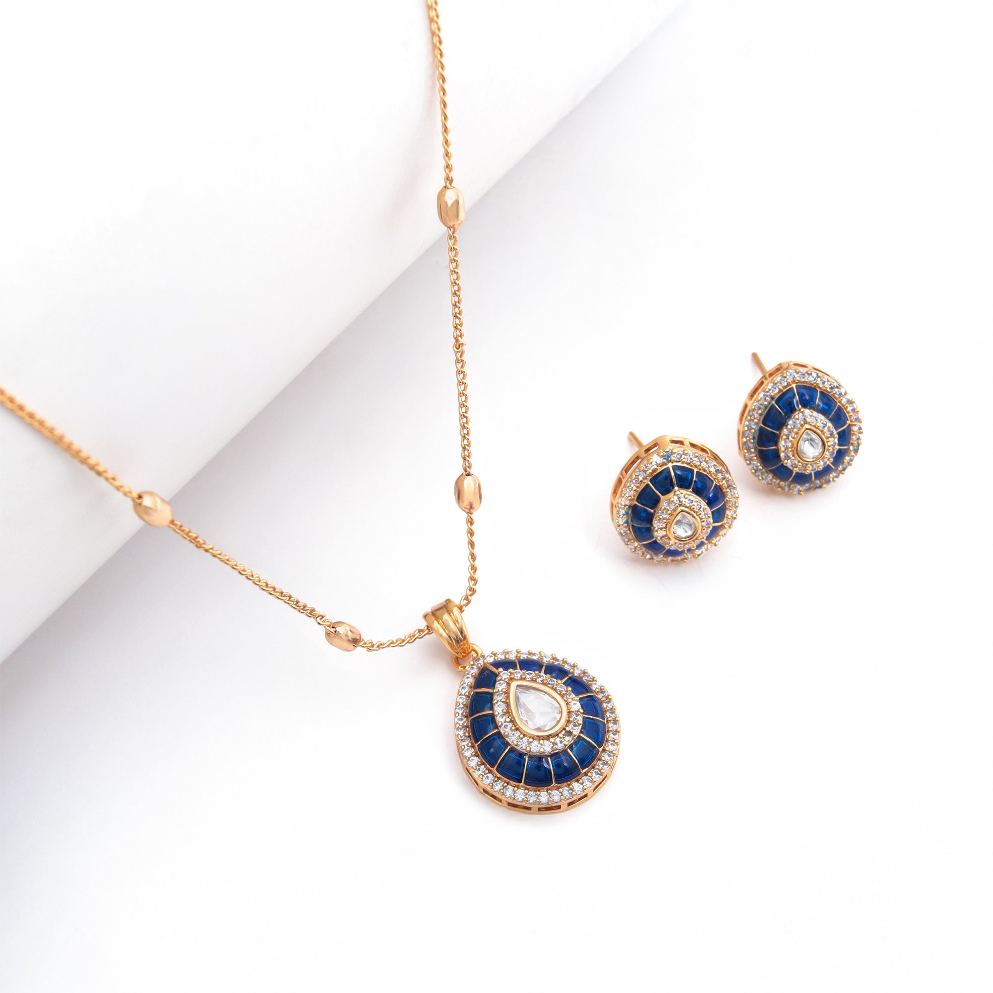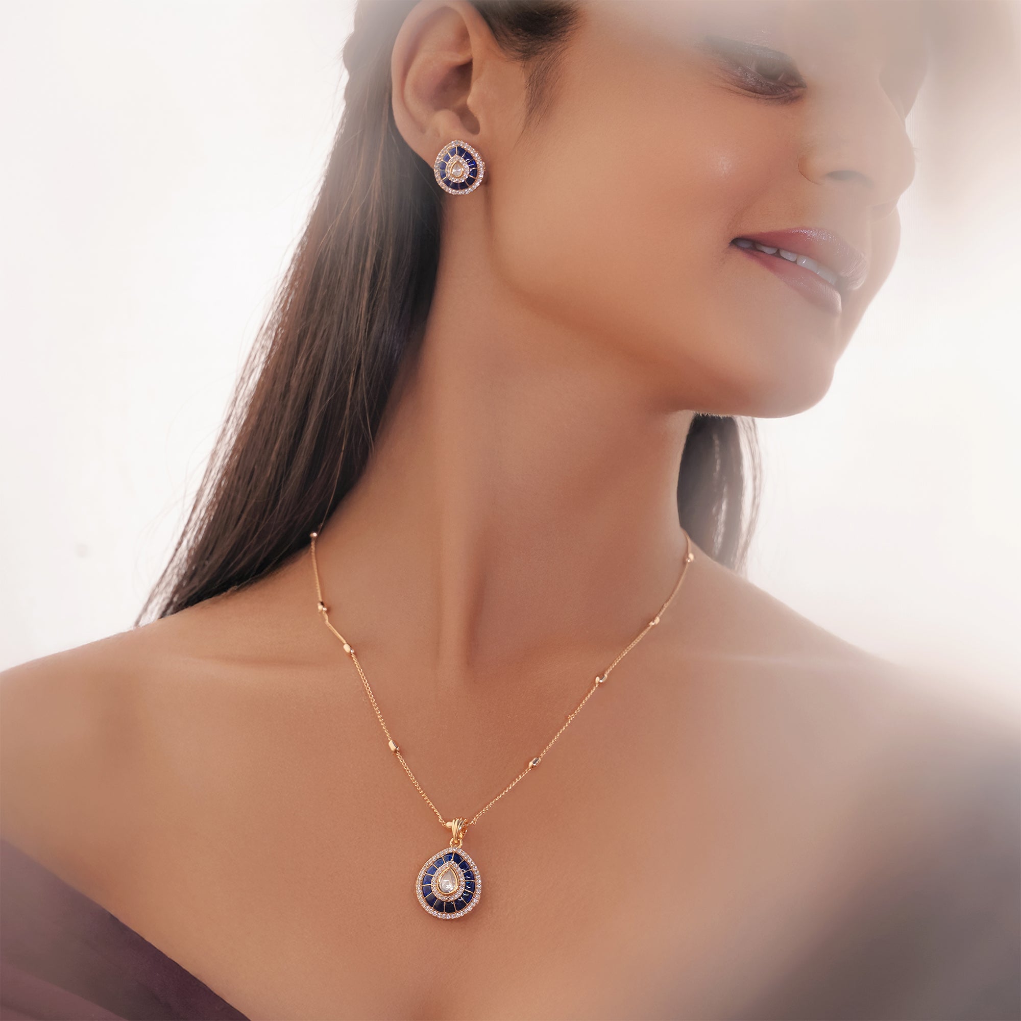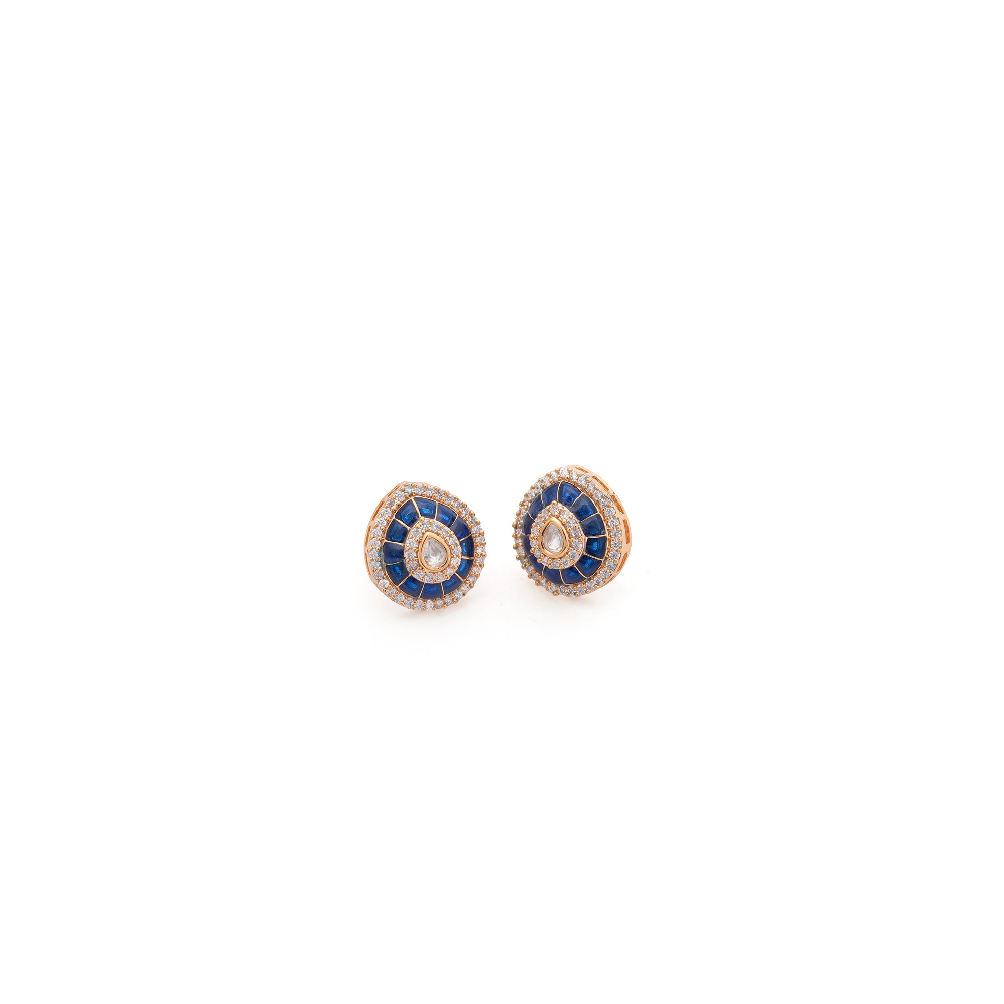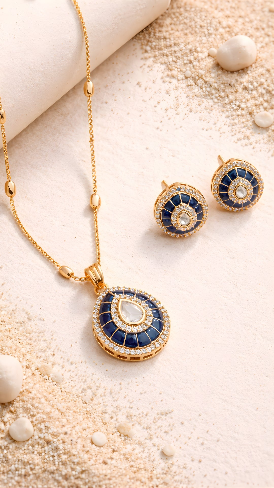 The Majestic Sapphire Raat Set is a striking kundan necklace set designed for evening elegance. Featuring deep sapphire blue stones...