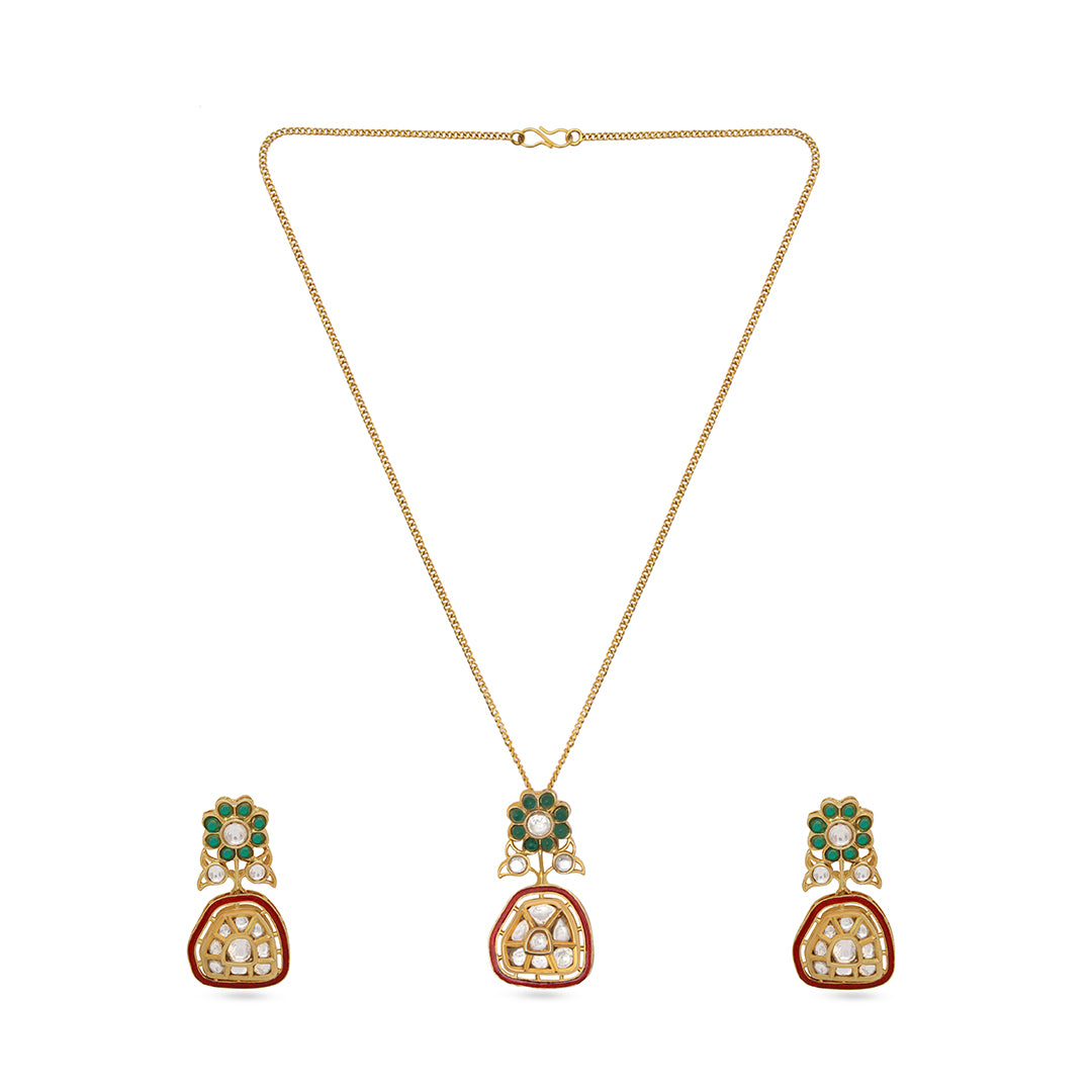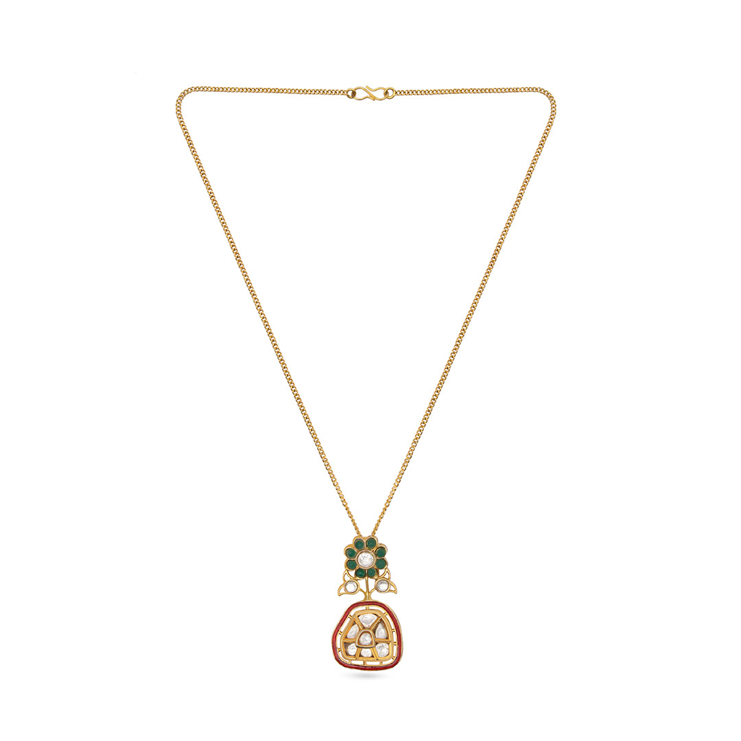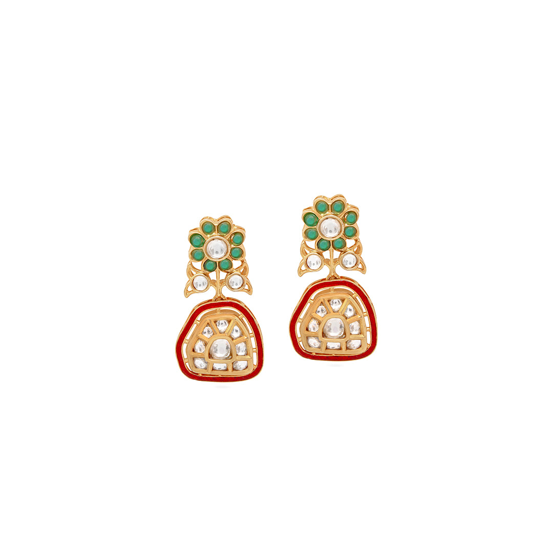 Classic and refined, this maroon-edged meenakari necklace features delicate floral accents and a geometric drop motif. Designed for those who...