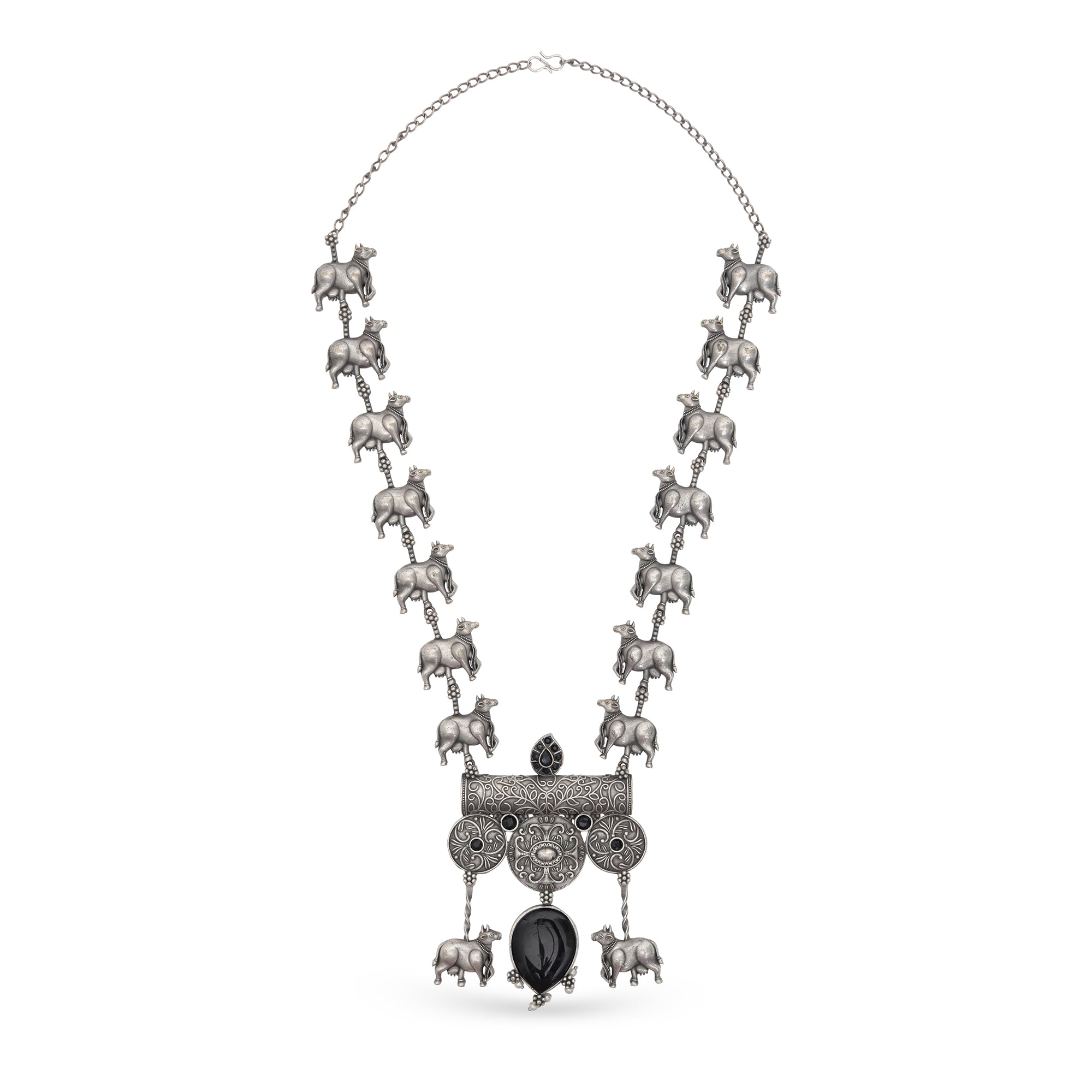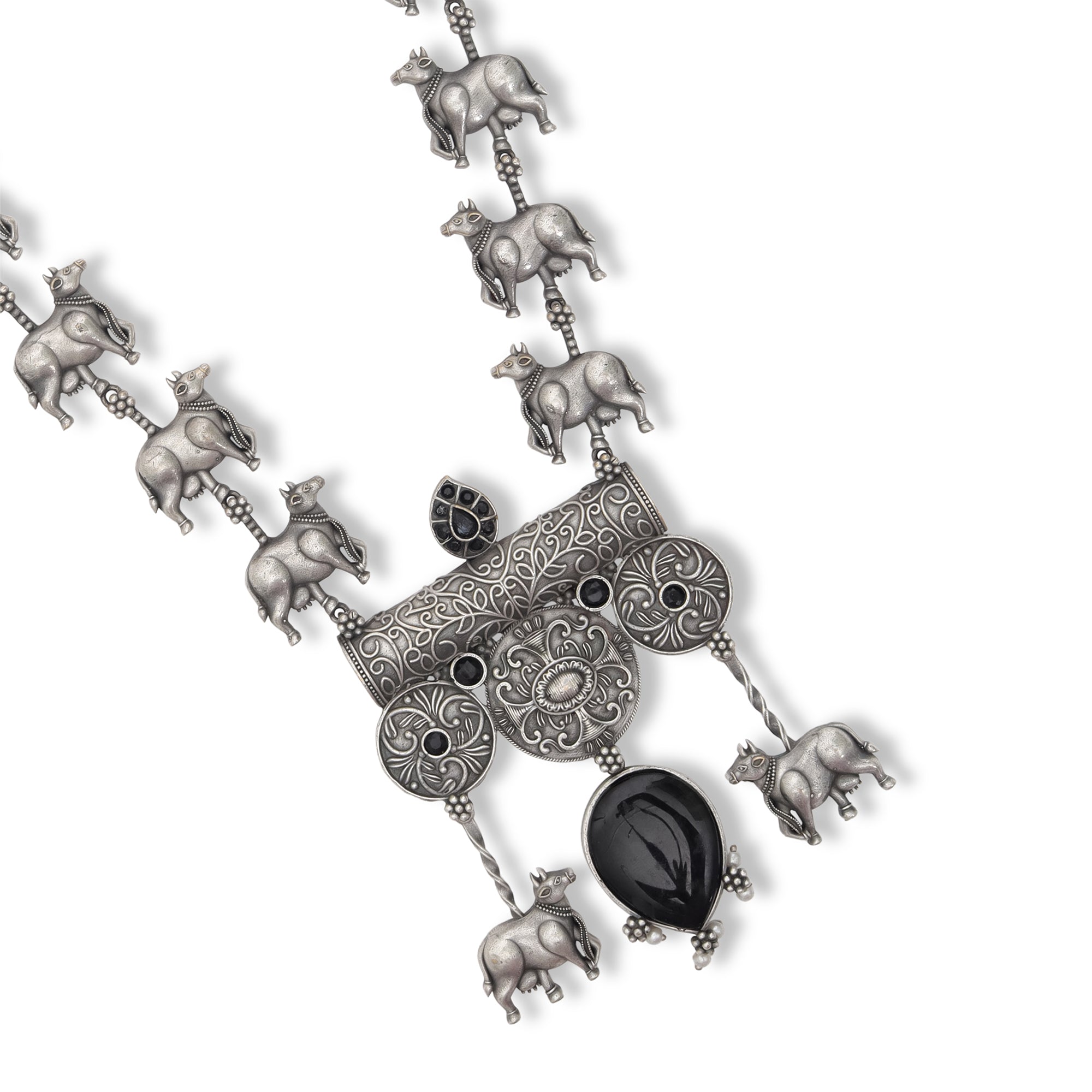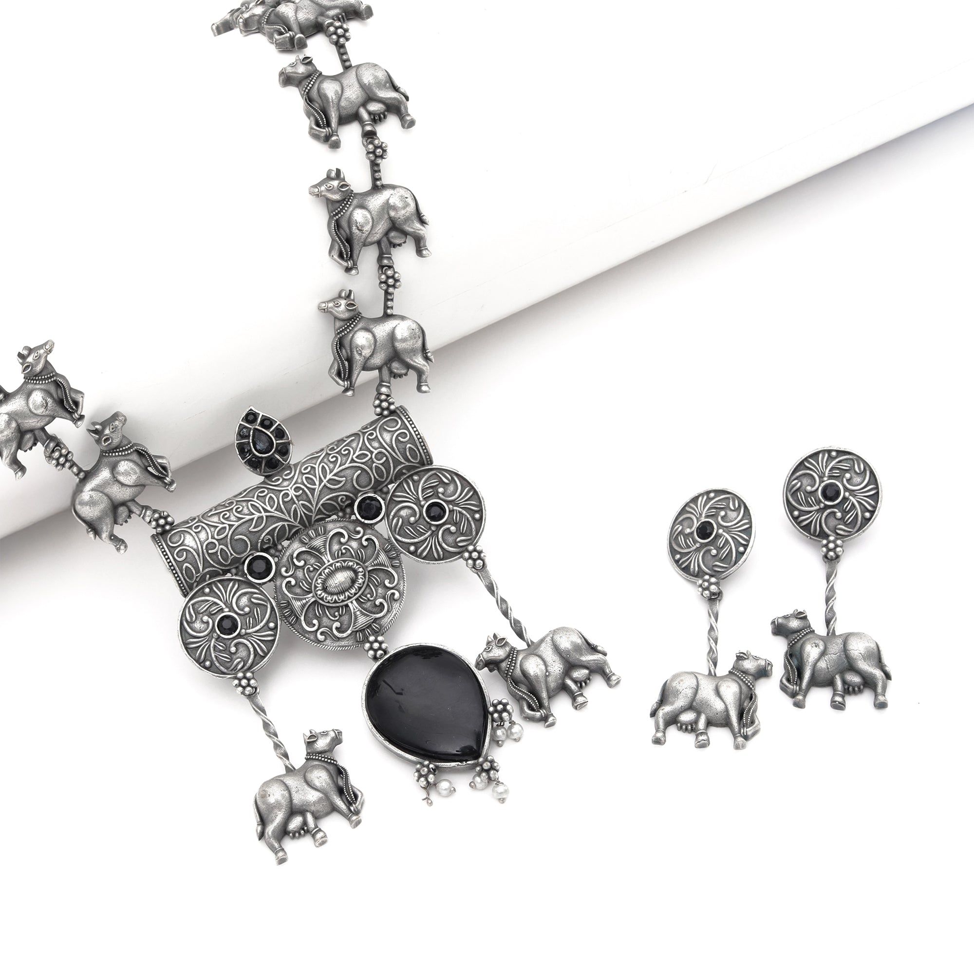 An ode to Indian roots, this set features a chunky oxidized silver necklace lined with tiny cow motifs. At the...
