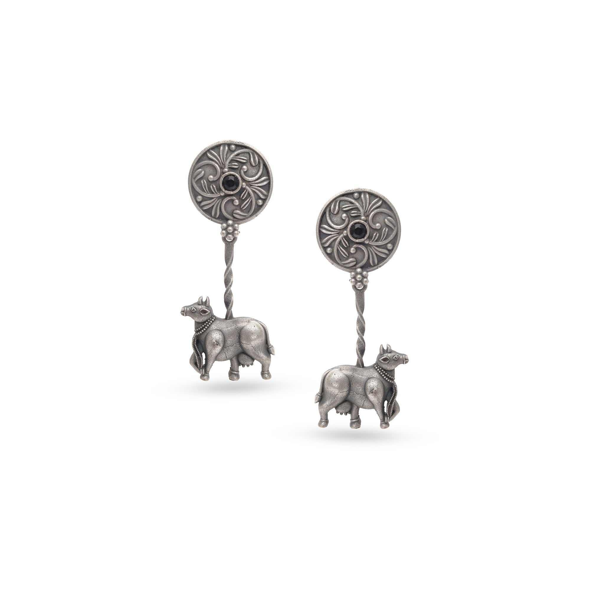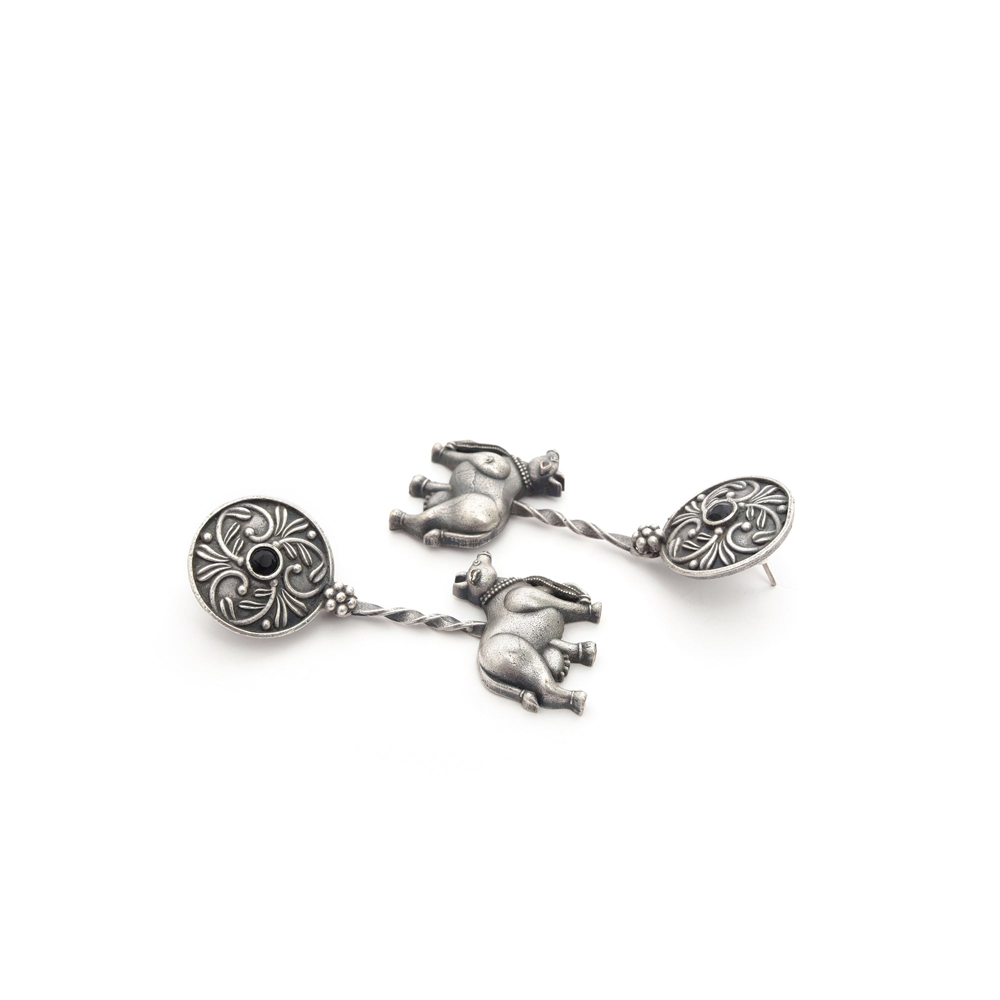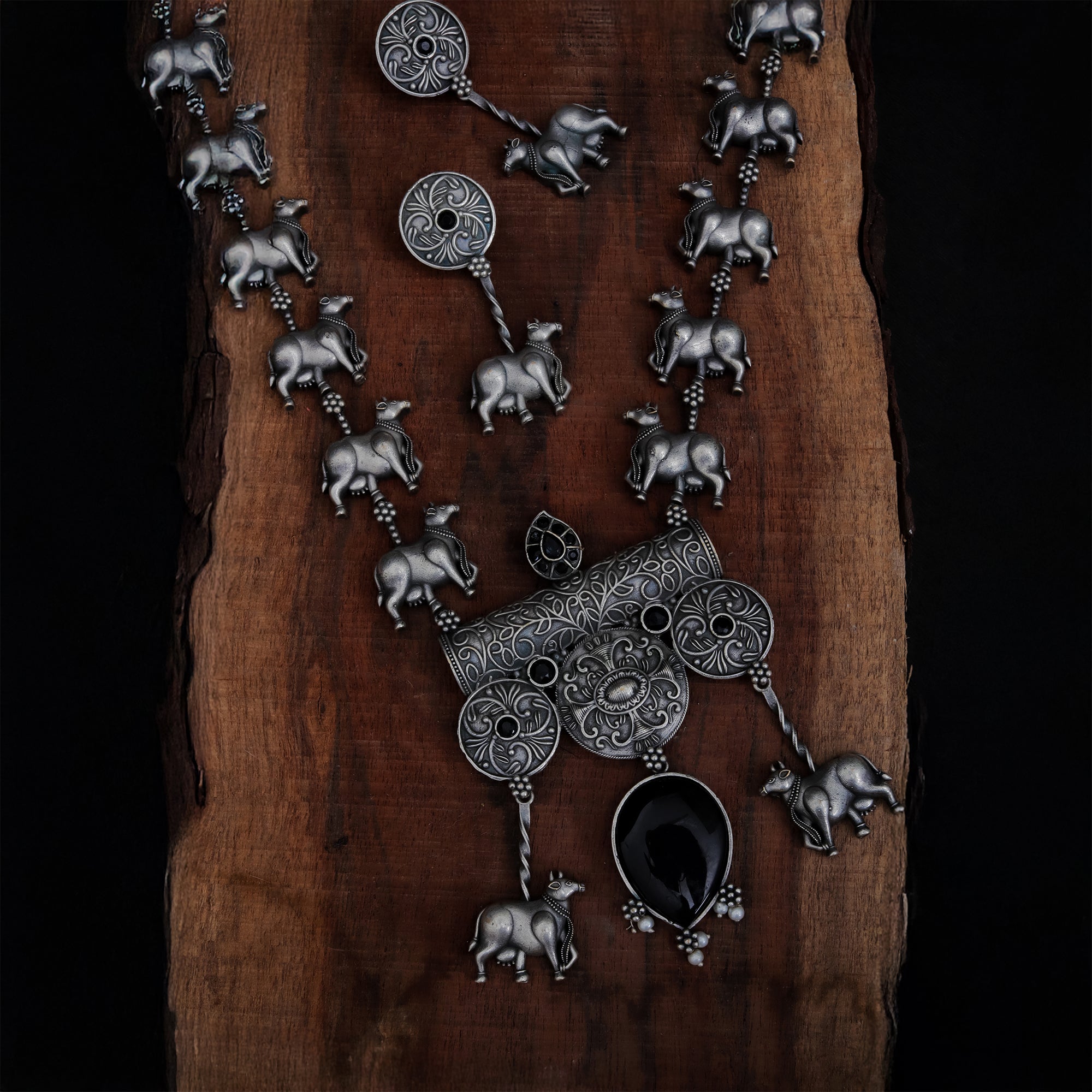 An ode to Indian roots, this set features a chunky oxidized silver necklace lined with tiny cow motifs. At the...