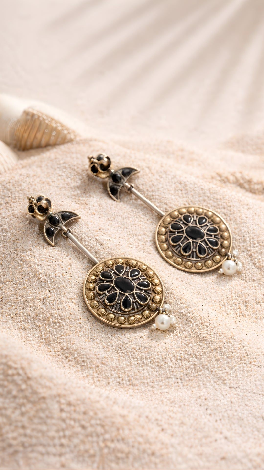 The same graceful silhouette, but this time in deep black stones that add a bold, mysterious touch. Antique gold detailing...
