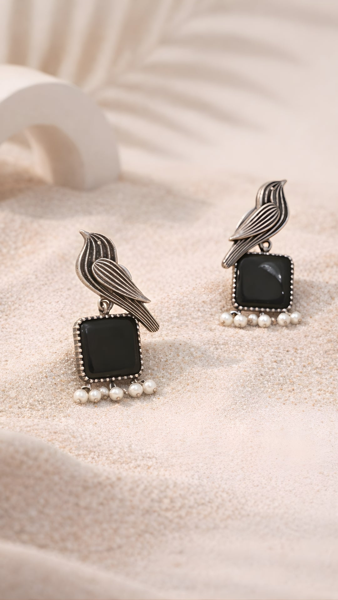 Elegance meets edge in the Morni Dusk Earrings. An oxidized bird sits poised above a jet-black square gemstone, framed with...