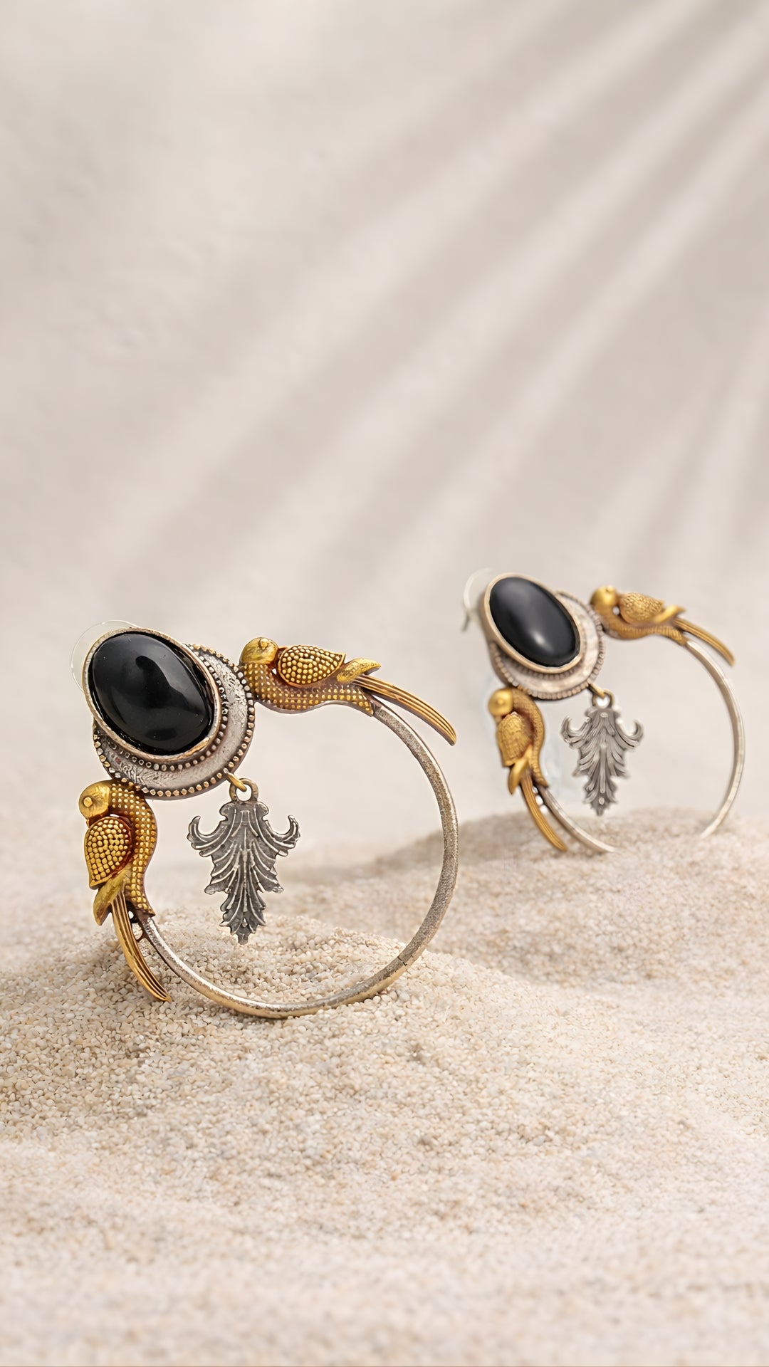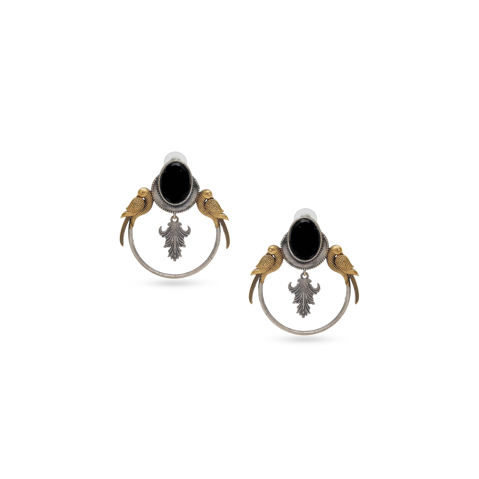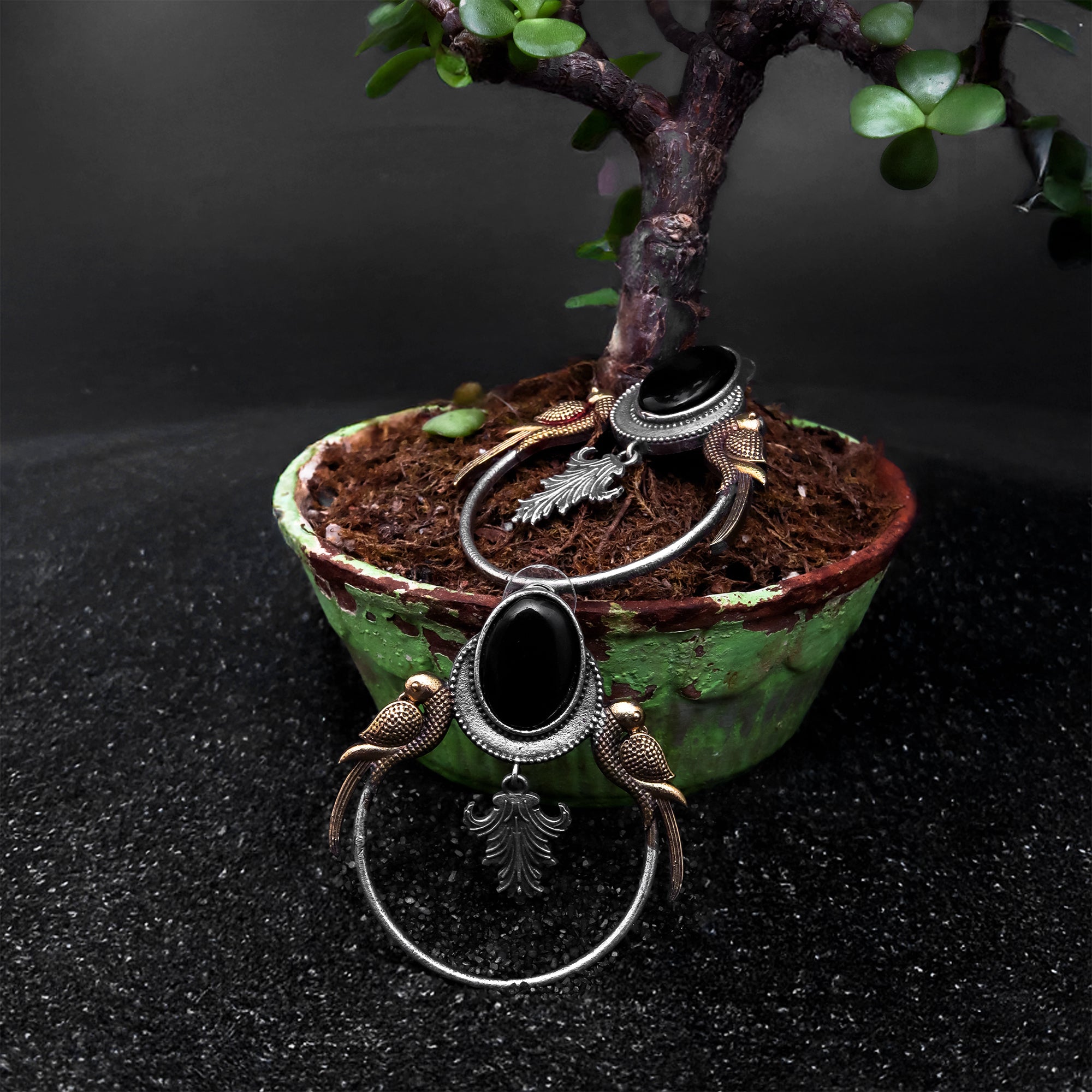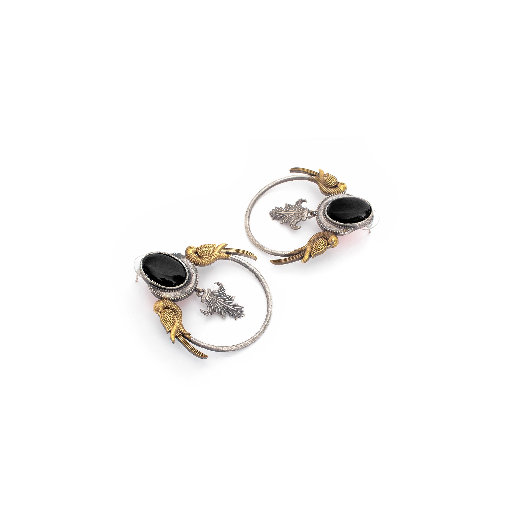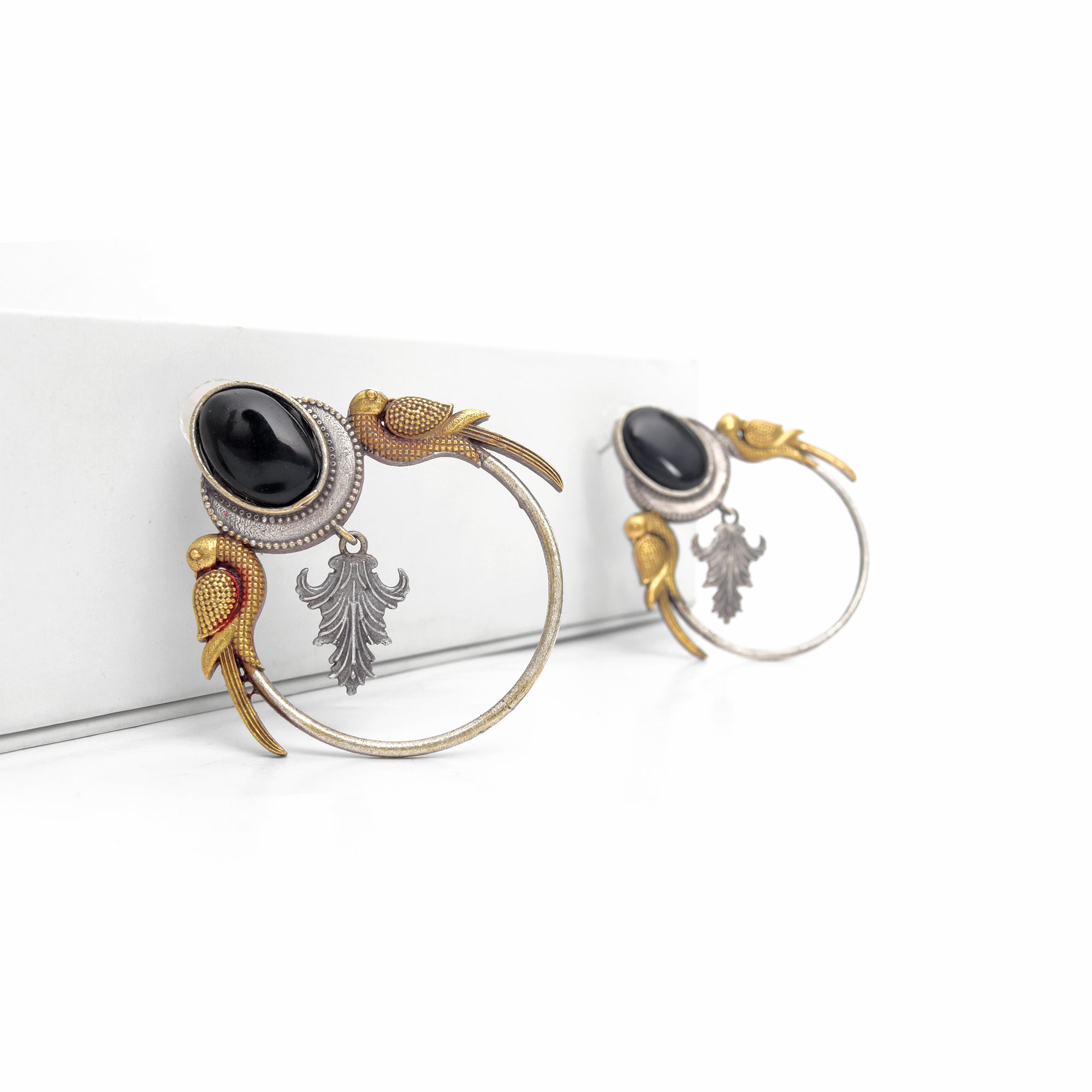 Edgy yet rooted in tradition, these oxidized hoops feature a bold black oval stone at the center, framed by twin...
