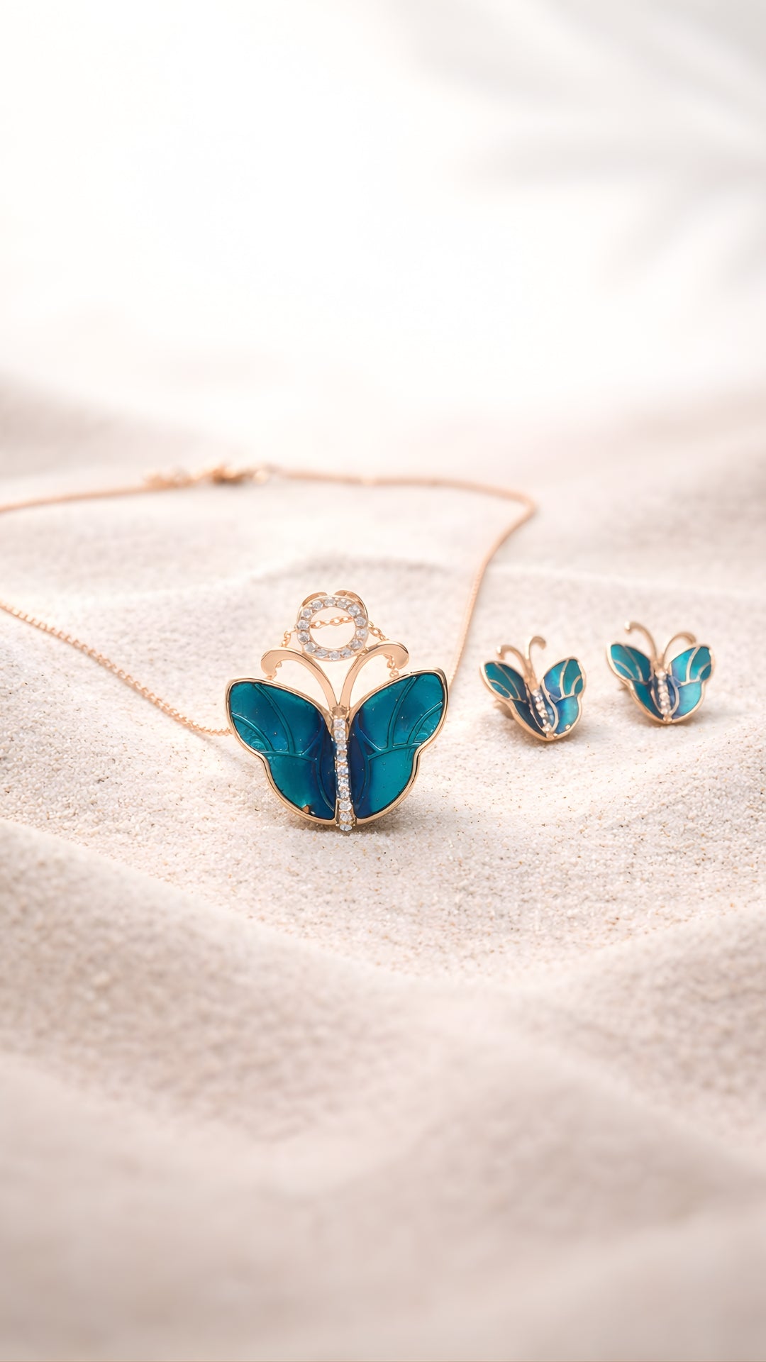 Dive into beauty with the Ocean Bloom Butterfly Set, featuring a bold butterfly pendant with striking deep blue enamel wings...