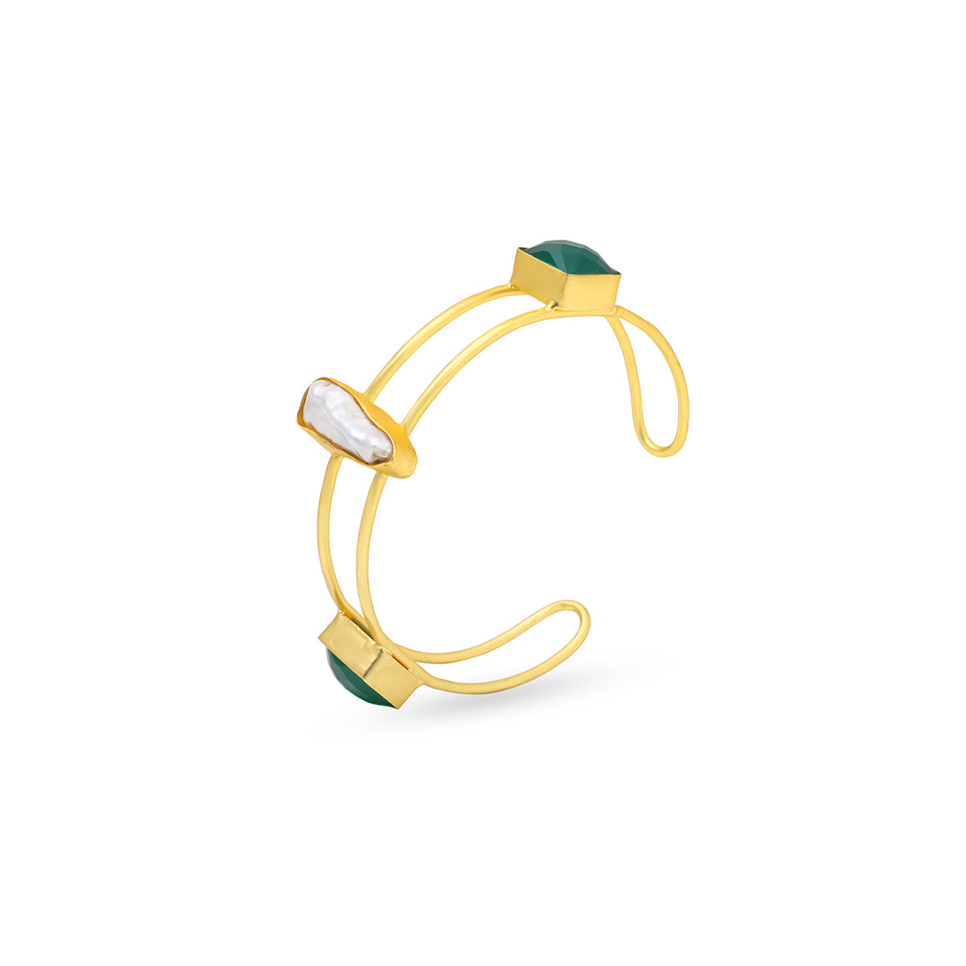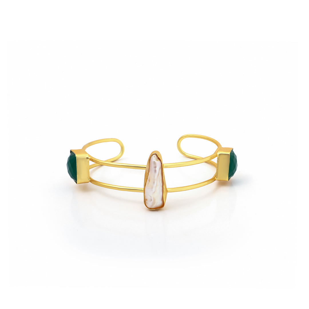 A unique fusion of organic form and structured elegance. This bangle features a baroque pearl centerpiece flanked by deep green...