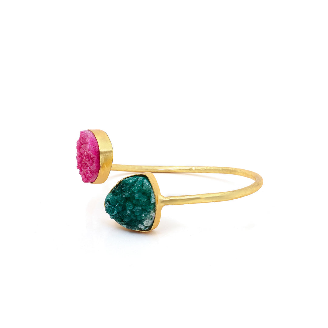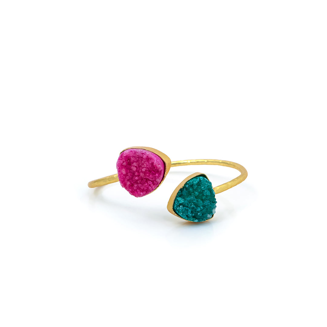 This playful cuff features raw-cut crystals in bold pink and ocean blue tones. The uneven texture and vivid color make...