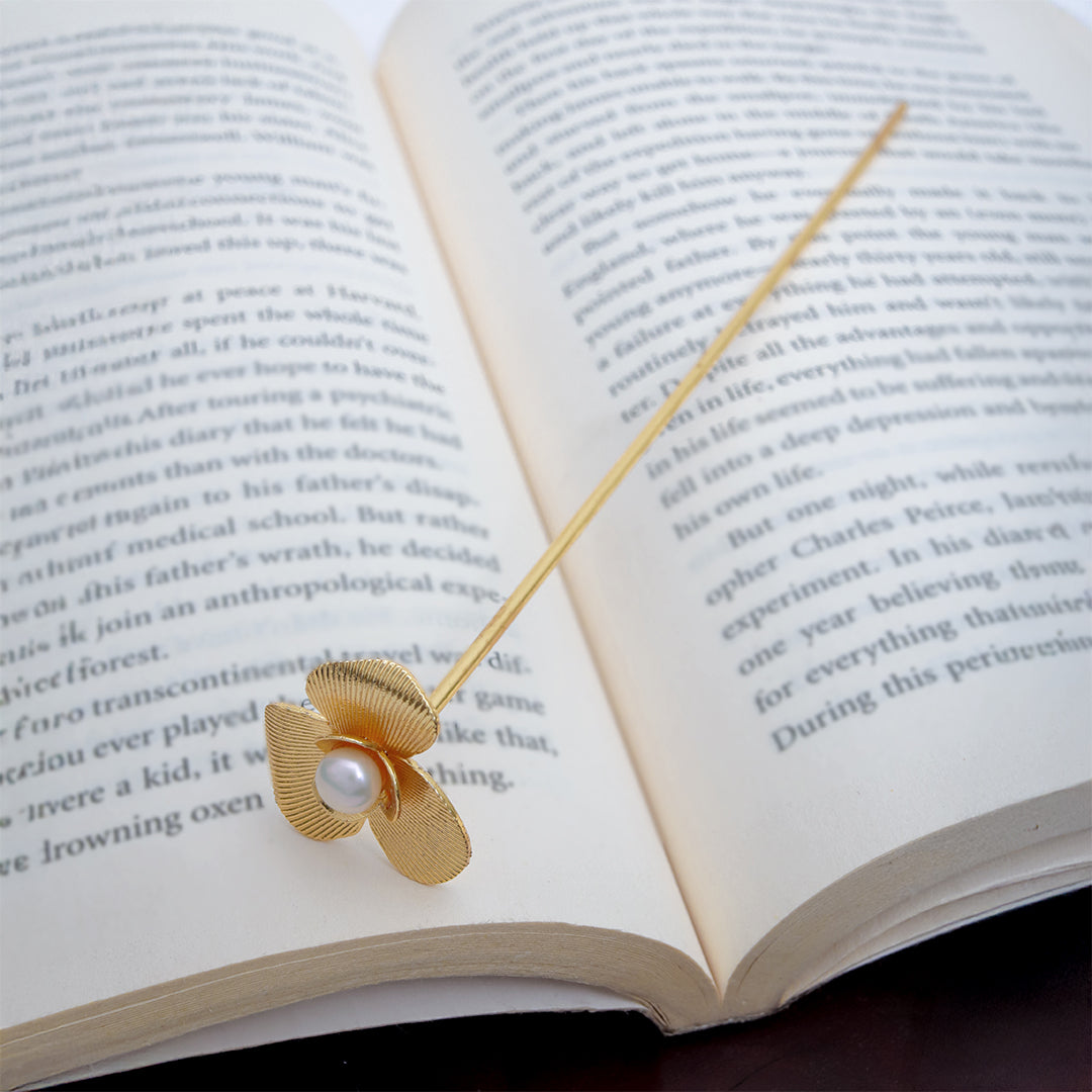 A delicate fusion of elegance and utility, the Pearl Bloom Bookmark Pin features three embossed petals embracing a luminous pearl...