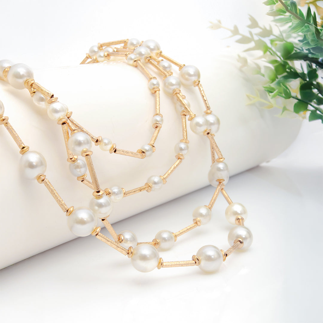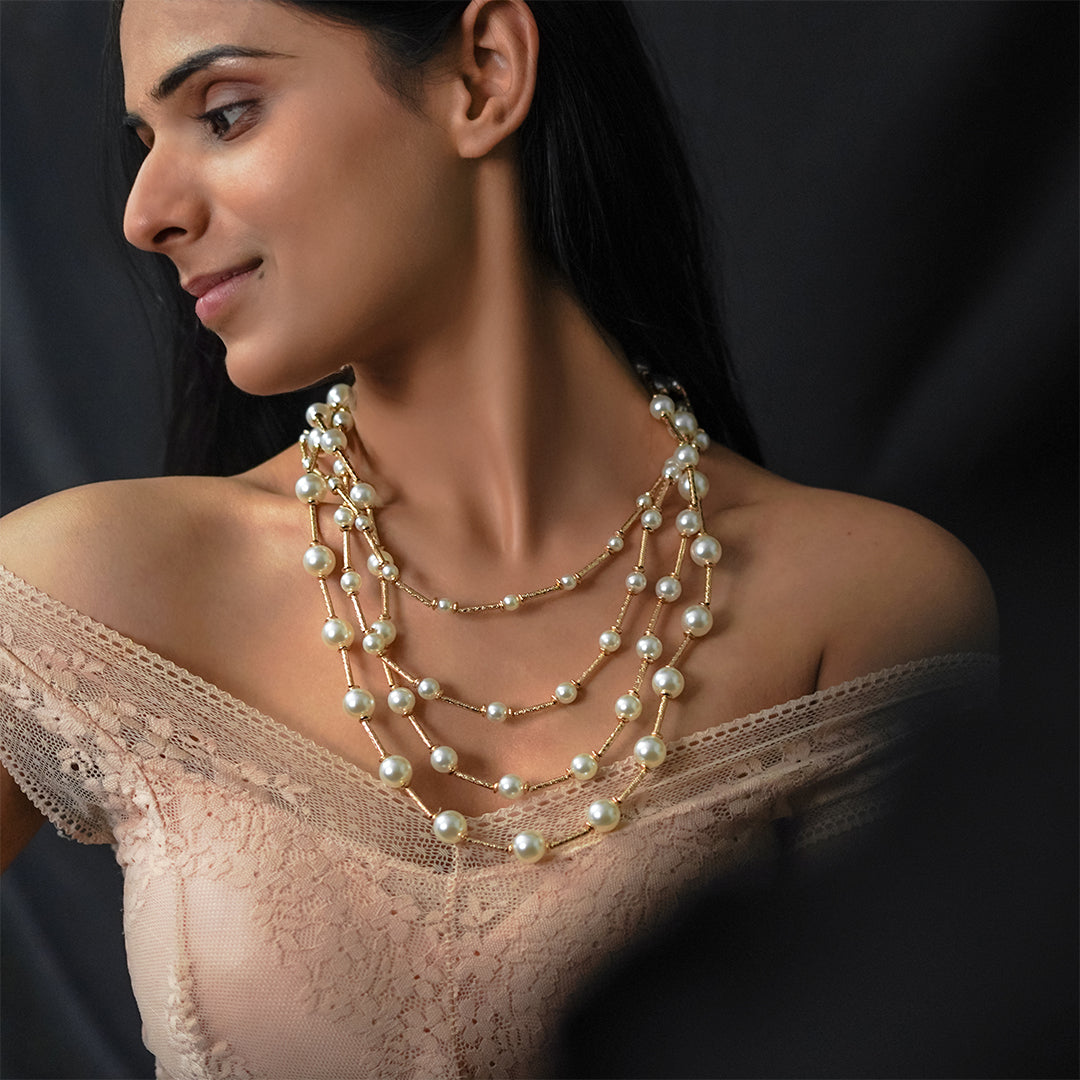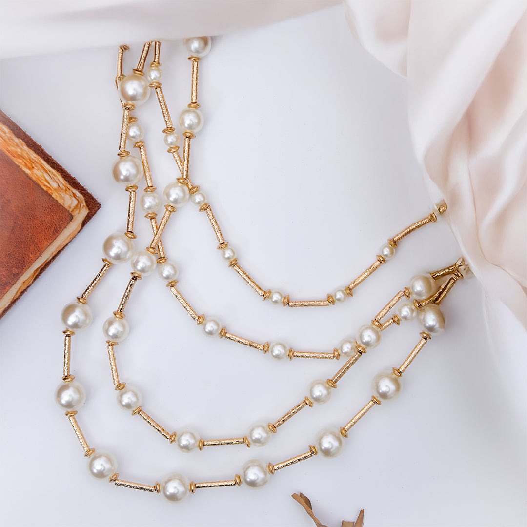 The Pearl Cascade Rope Necklace is a graceful blend of baroque pearls and textured golden tubes. Long, layered, and luminous—this...