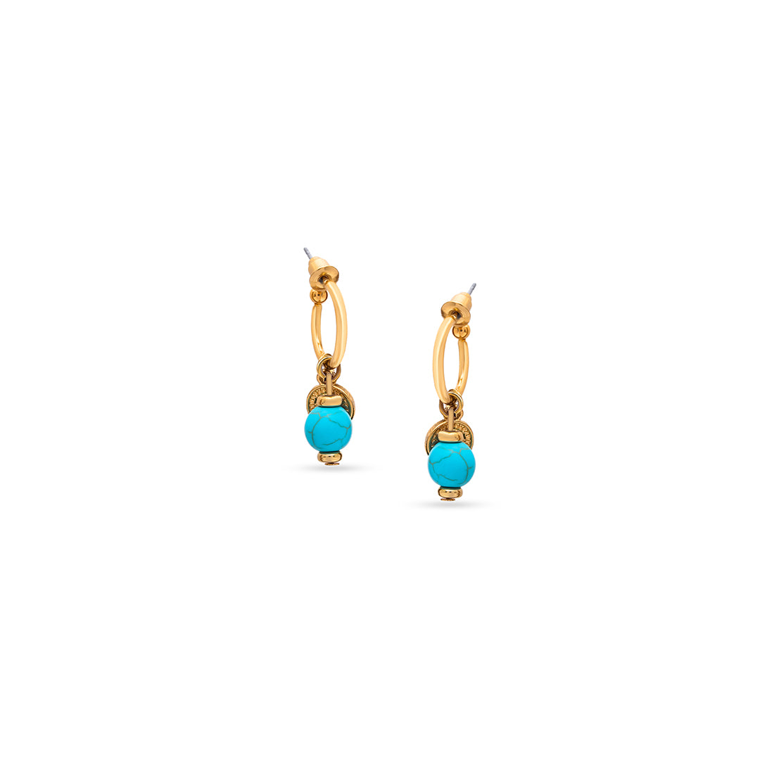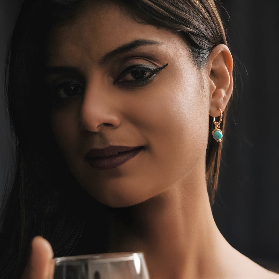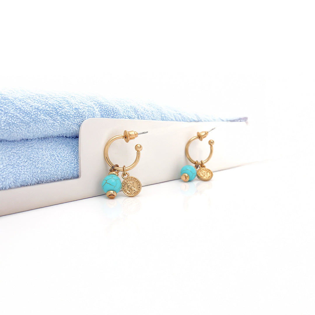 Elevate your accessory game with these stunning Bohemian-style gold hoop earrings featuring vibrant turquoise beads and intricate coin charm accents....