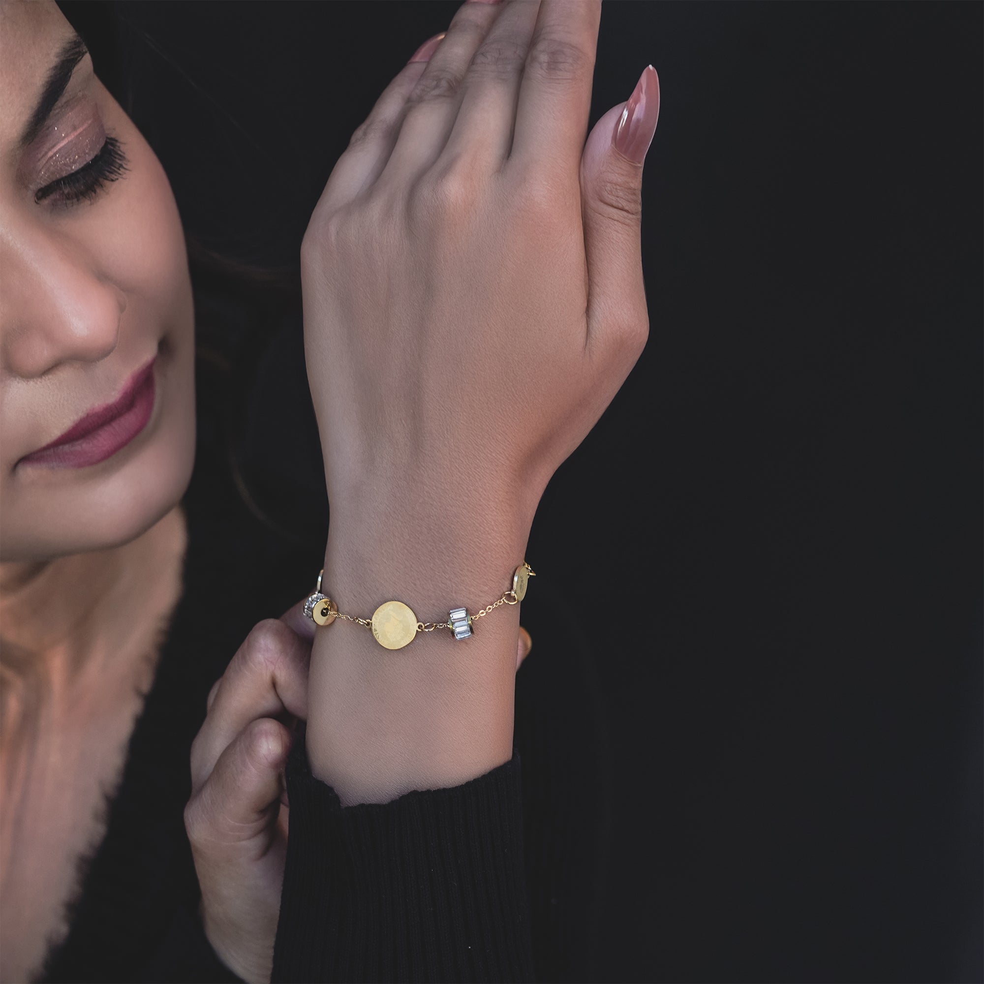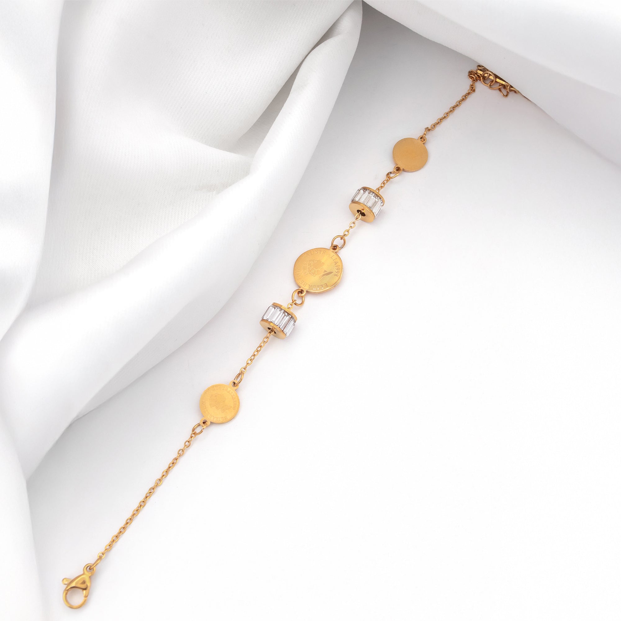Luxury with a soft feminine touch.The Regal Coin & Crystal Bracelet blends coin motifs with crystal barrel accents for a...