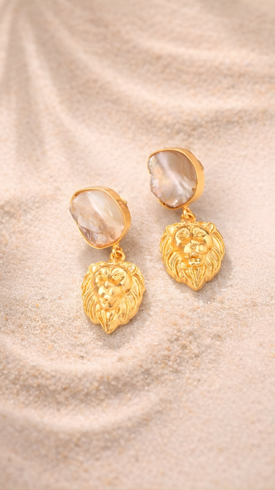 The Regal Roar Earrings symbolize confidence, power, and poise. Designed with a captivating lion motif and a soft pearl-like stone, these earrings celebrate feminine strength wrapped in elegance. Their textured gold finish adds depth and dimension, making them perfect for festive occasions or glamorous evenings.