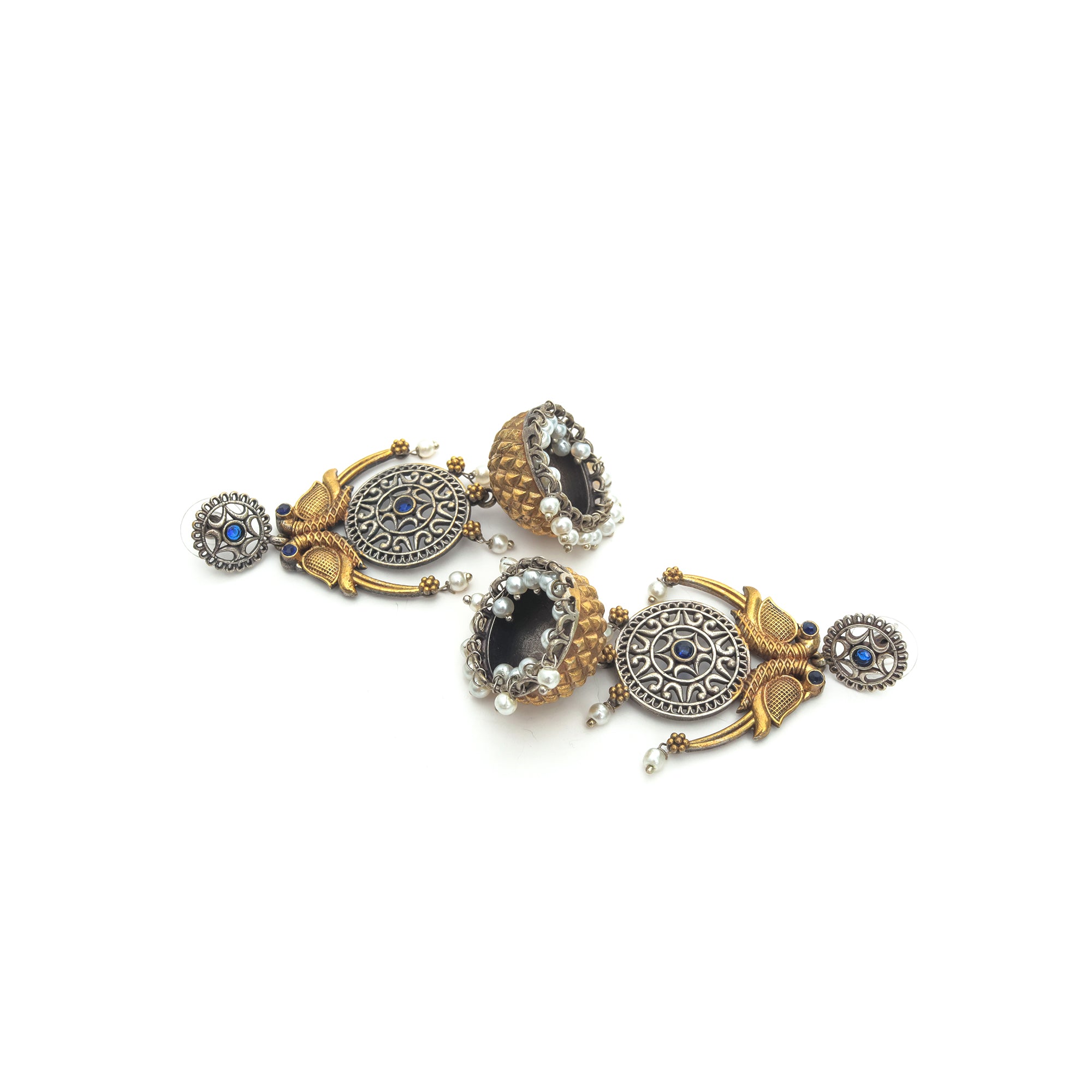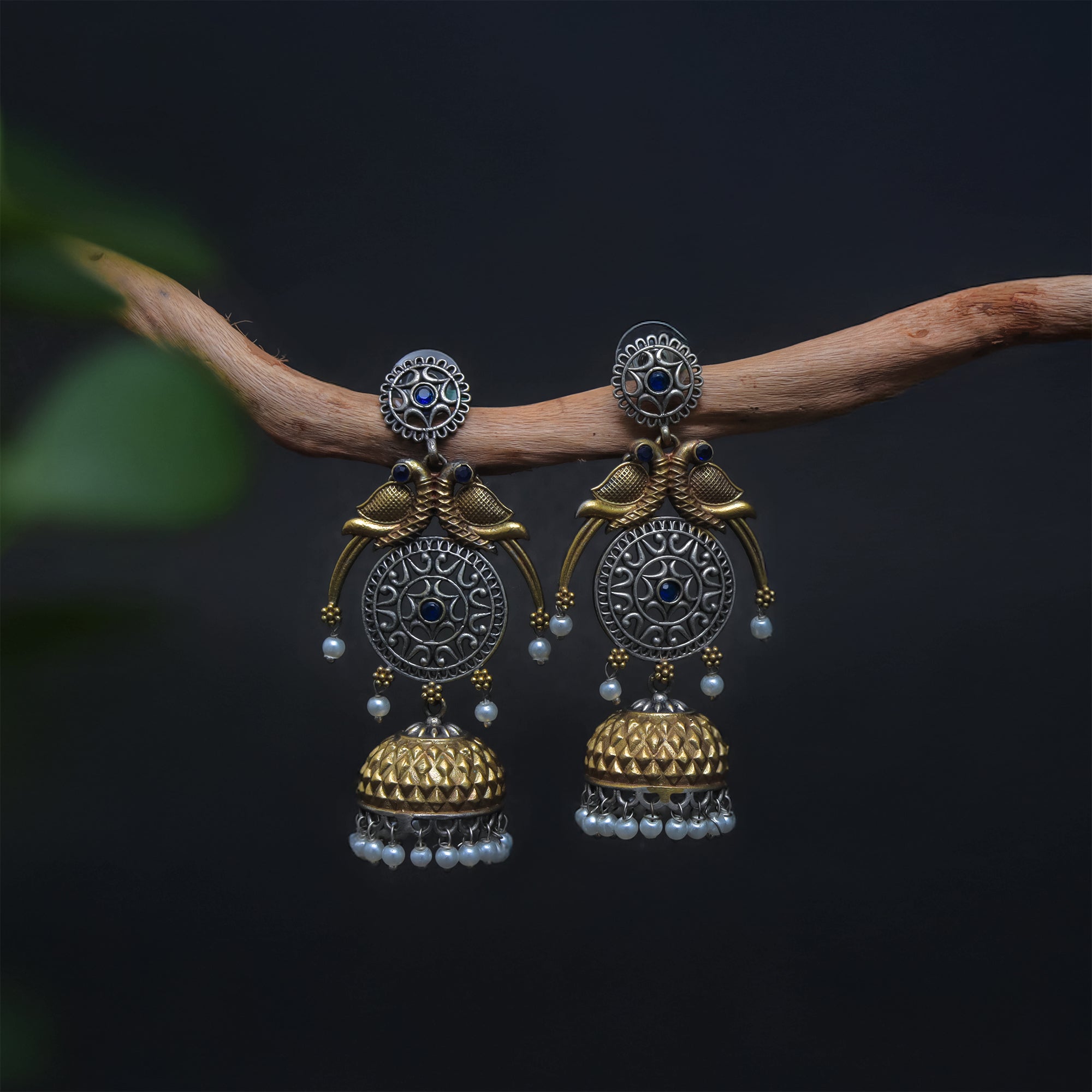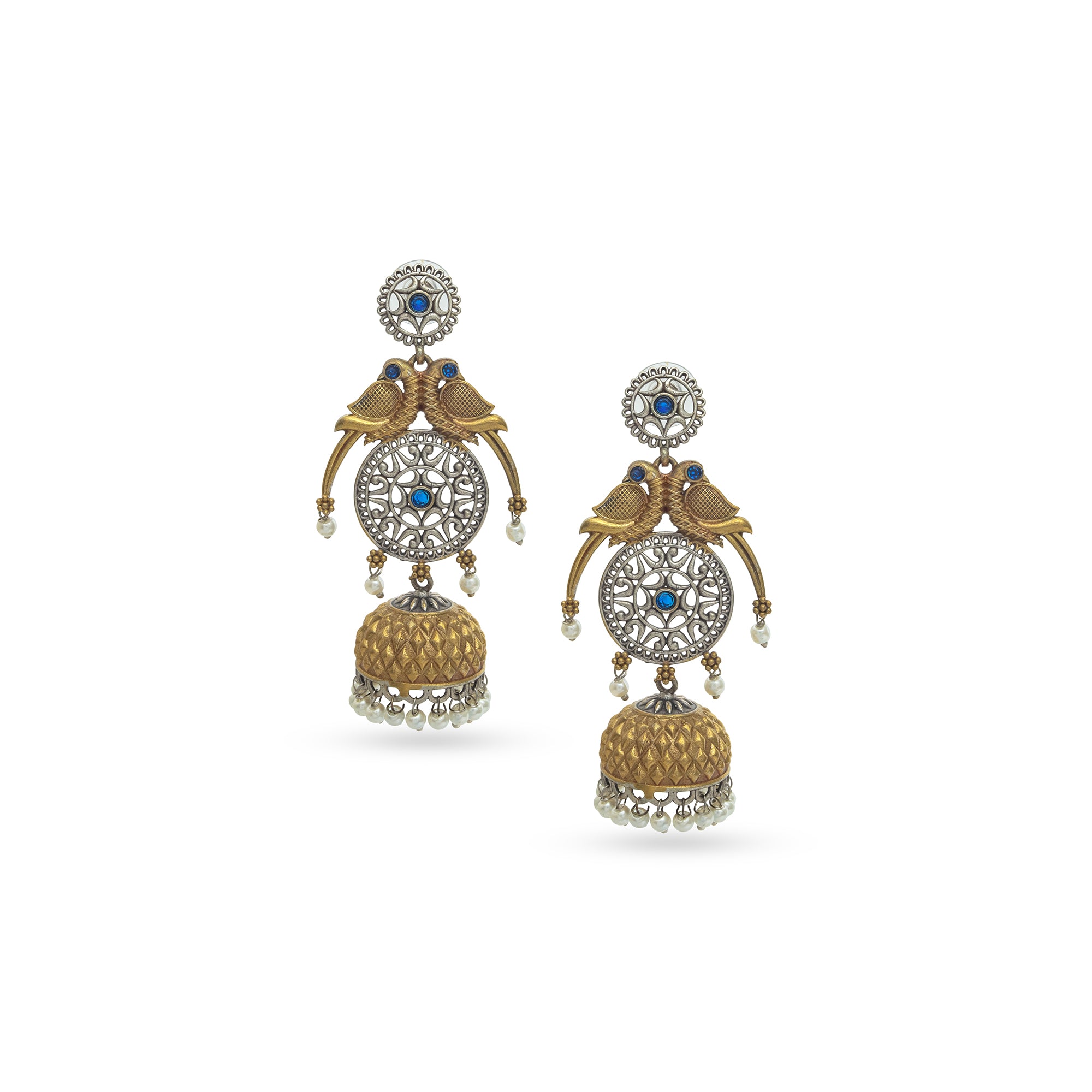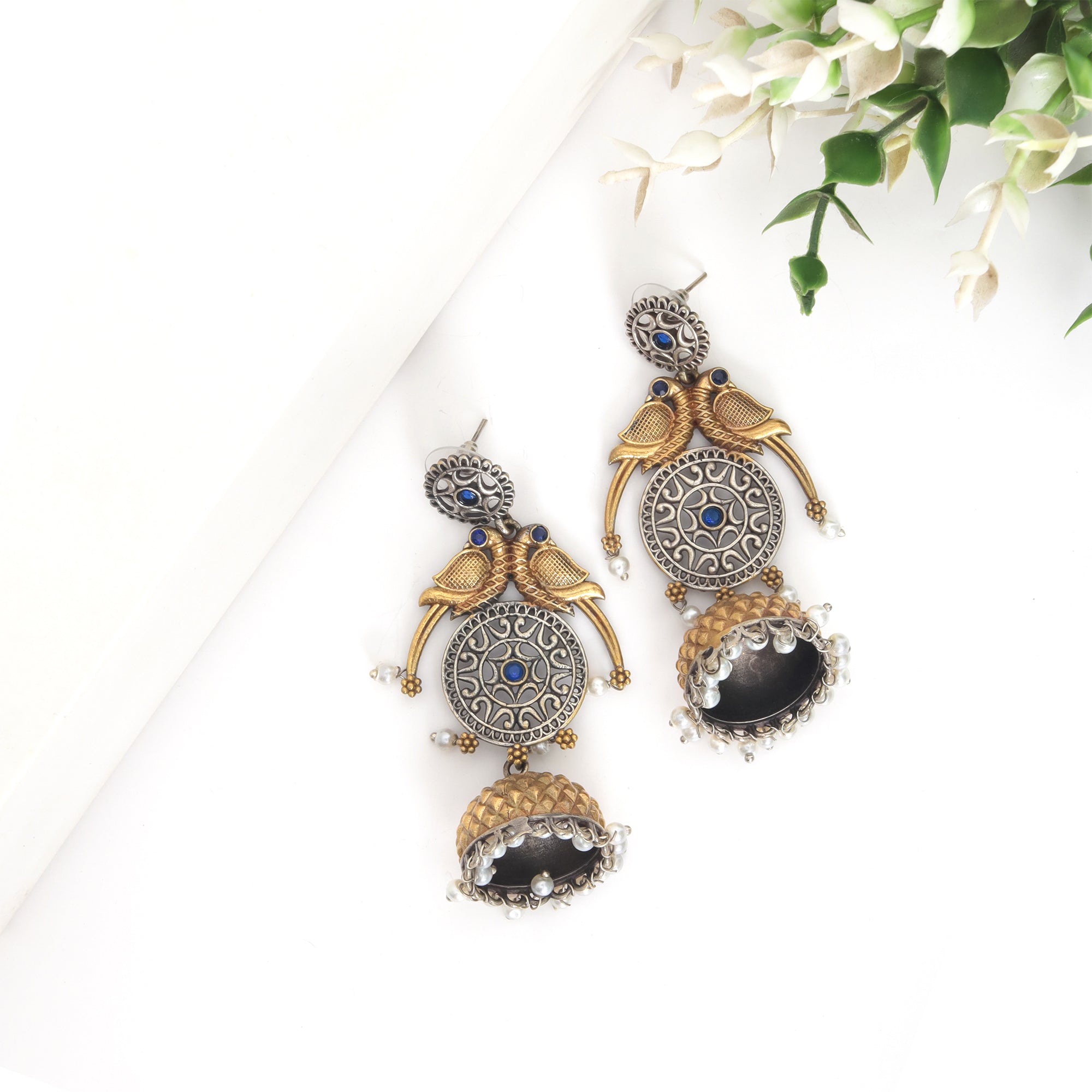 When heritage meets high drama, you get these stunning twin-bird dome jhumkas. Antique gold birds sit atop detailed oxidized silver...