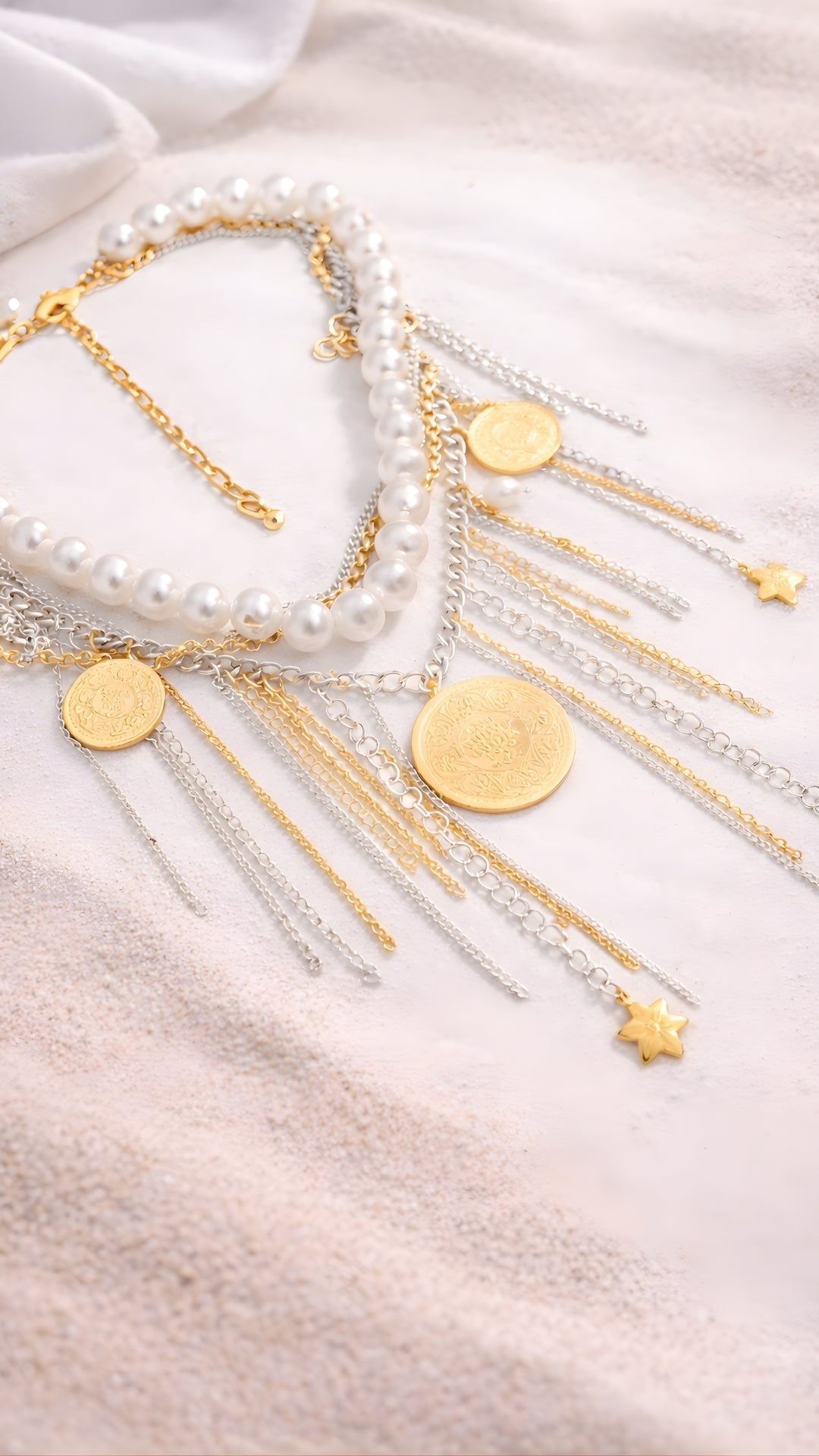 Layered pearls, coins & chains – a fusion of classic and contemporary.