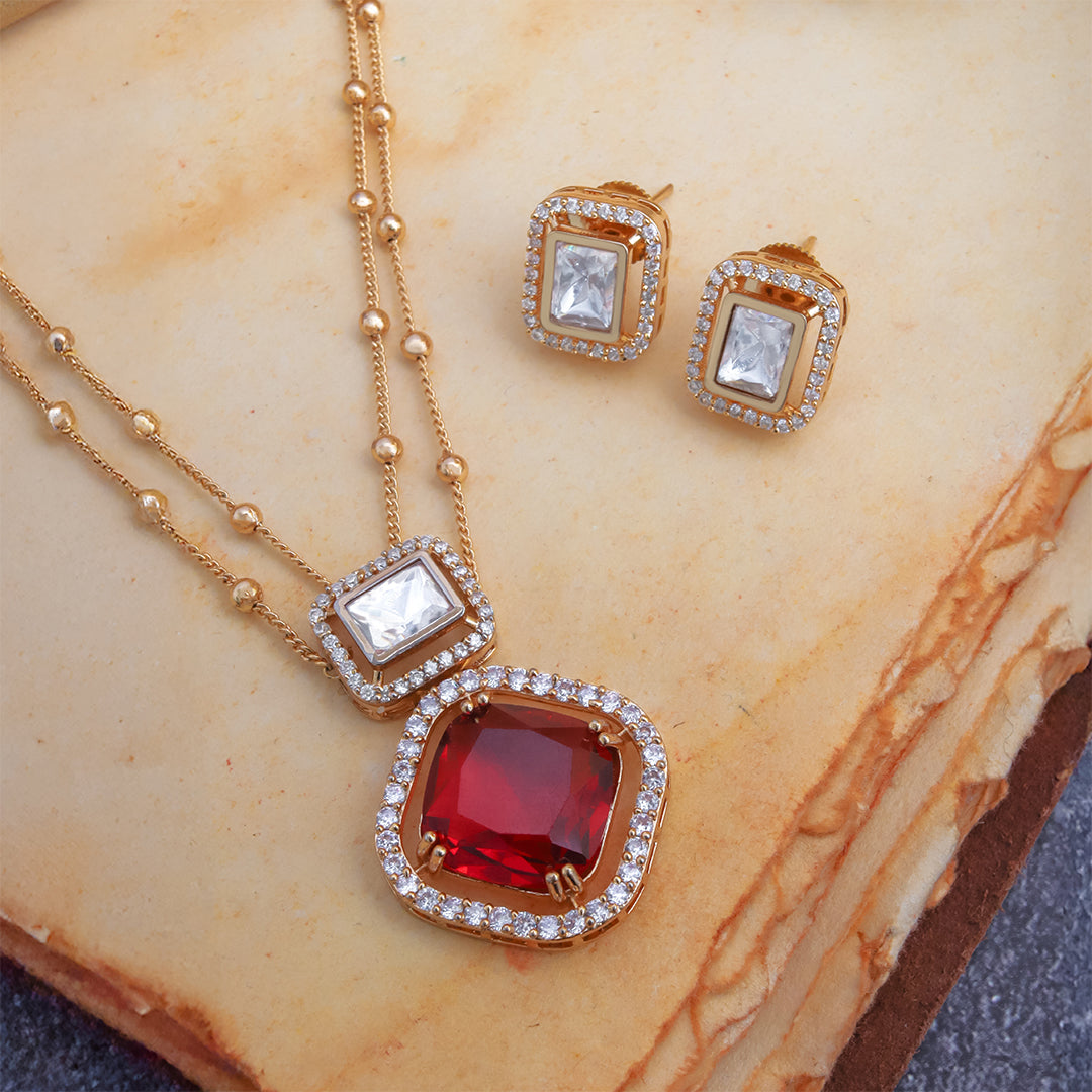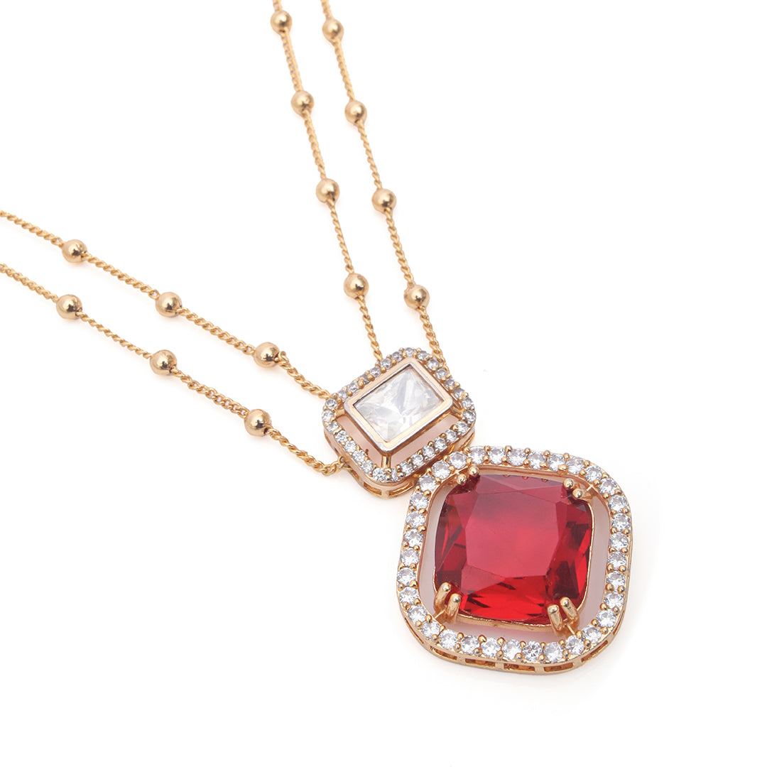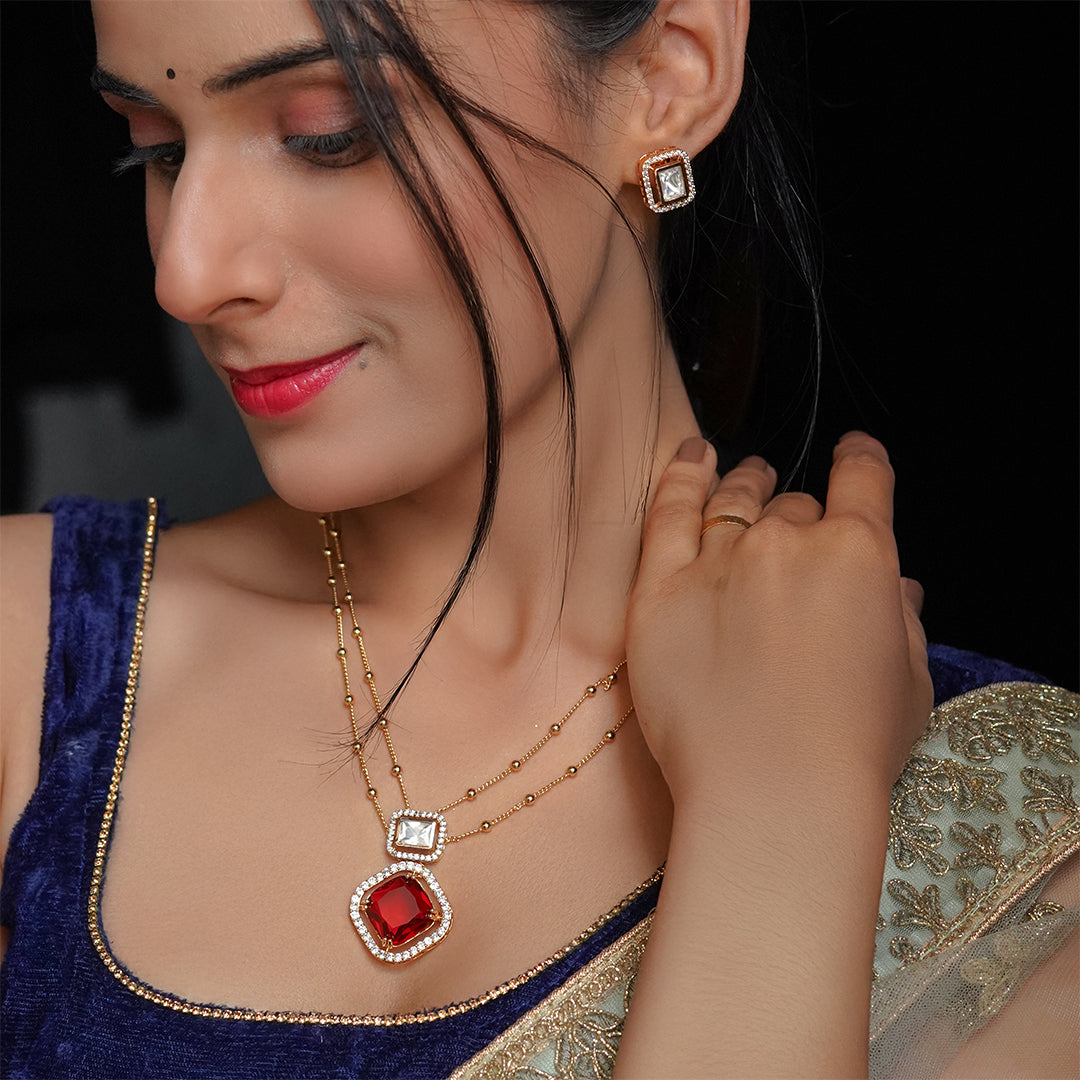 Modern meets majestic in the Ruby Prism Necklace Set. Featuring a stunning ruby-colored crystal paired with square-cut white stones and...