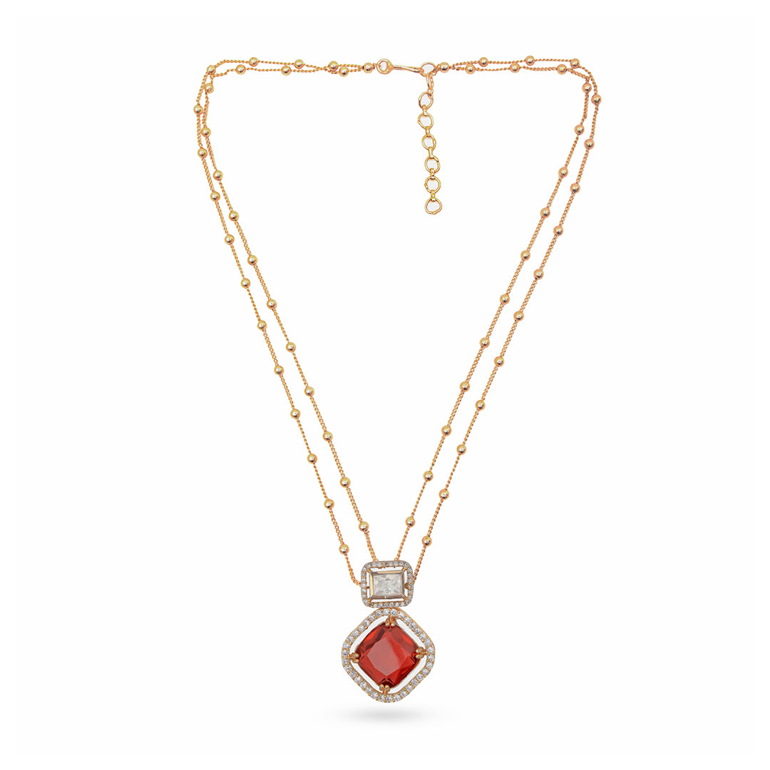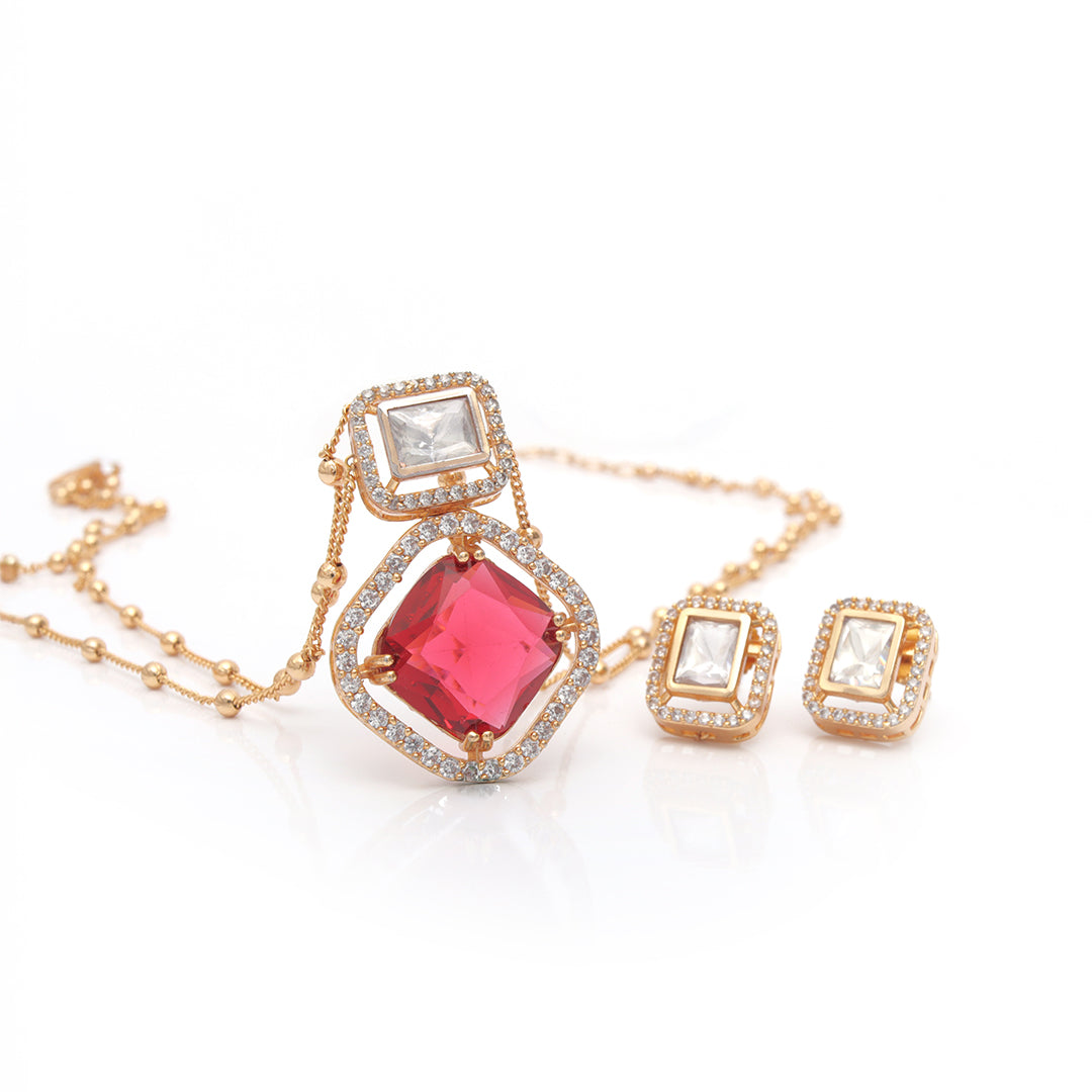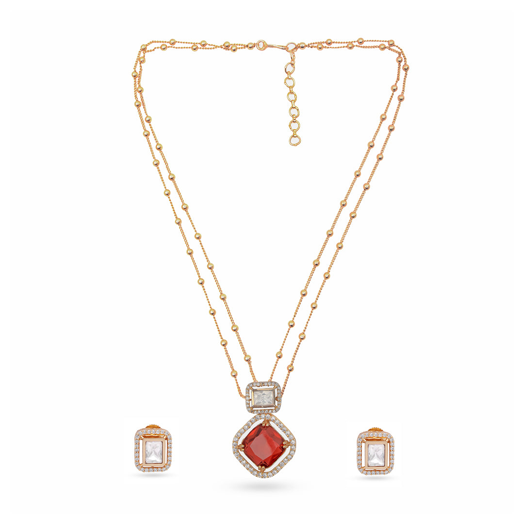 Modern meets majestic in the Ruby Prism Necklace Set. Featuring a stunning ruby-colored crystal paired with square-cut white stones and...
