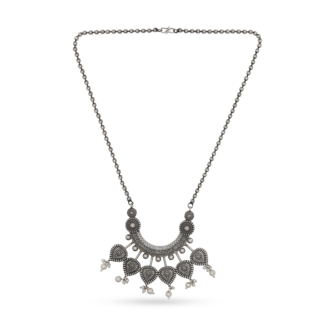 The Shringaar Moon Set celebrates Indian femininity with grace and volume. The crescent-shaped oxidized necklace is adorned with shell-like danglers...