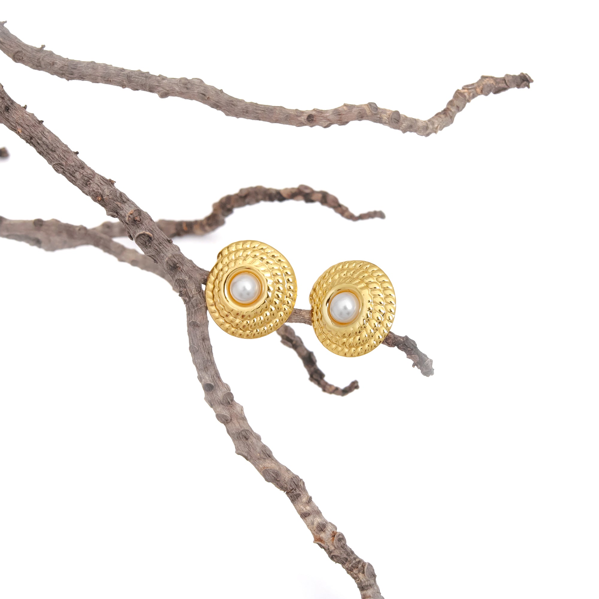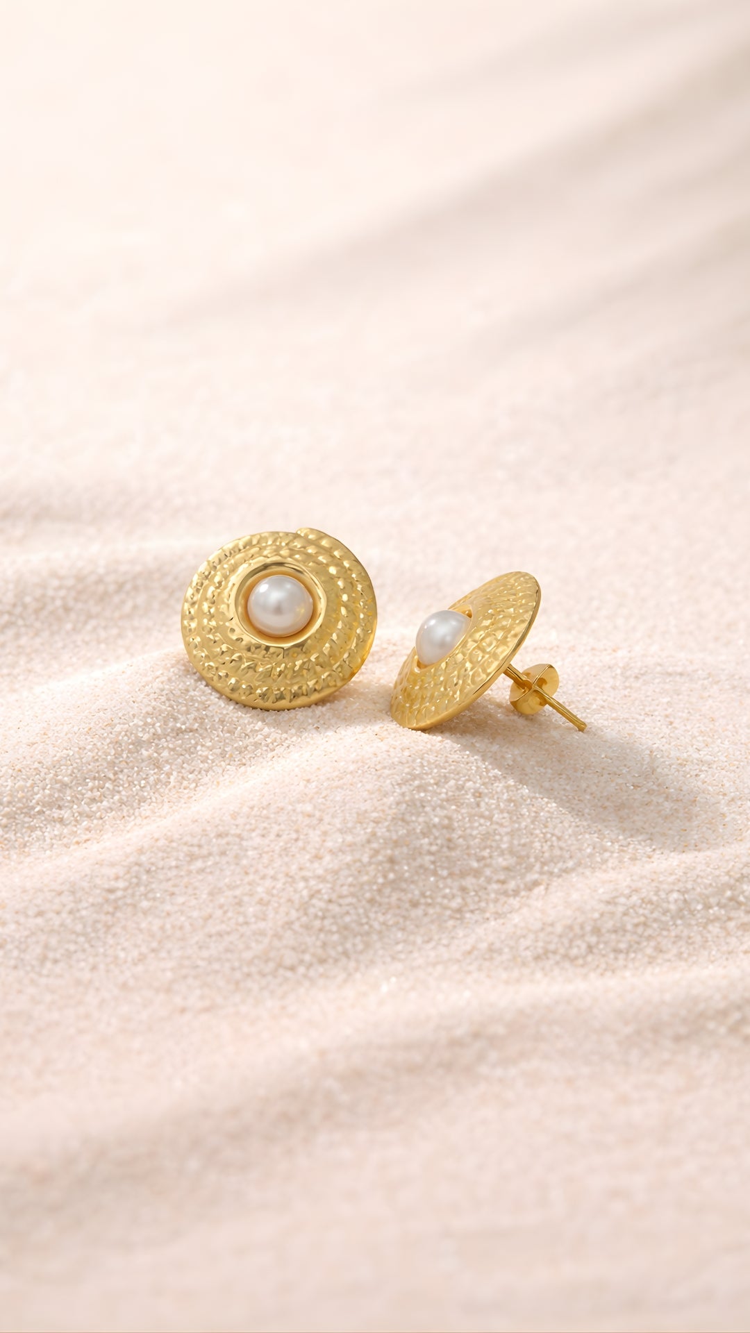 Sunburst Pearl Studs A radiant pair that brings old-school charm into a modern frame. These gold-toned studs feature a textured...