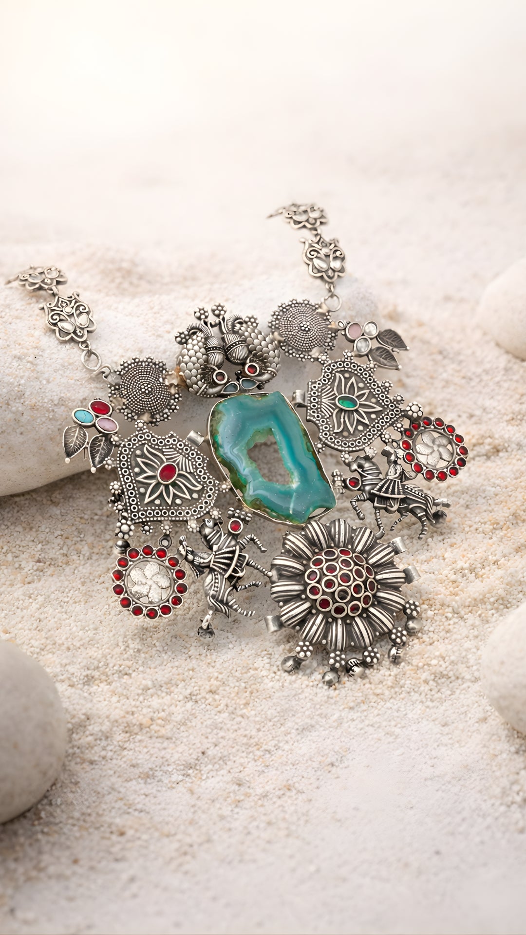 The Emerald Bloom Necklace is a true reflection of regal beauty and traditional artistry. At its heart lies a bold emerald-green stone, surrounded by finely detailed oxidized silver flowers, intricate filigree patterns, and delicate gemstone accents in red. The antique silver chain is crafted with ornate floral links, making it an exquisite design from every angle.