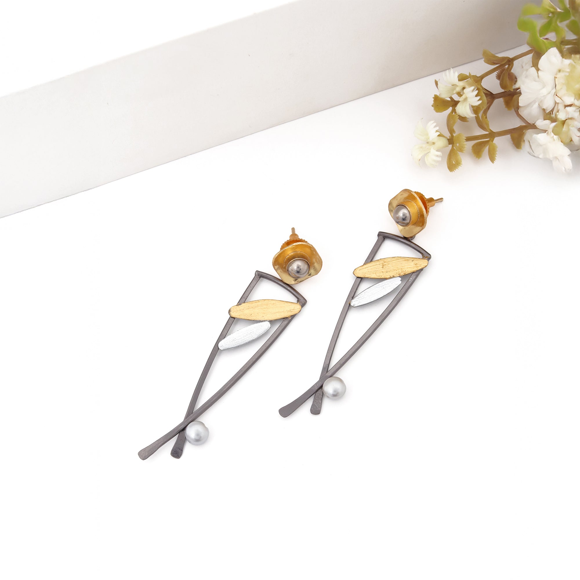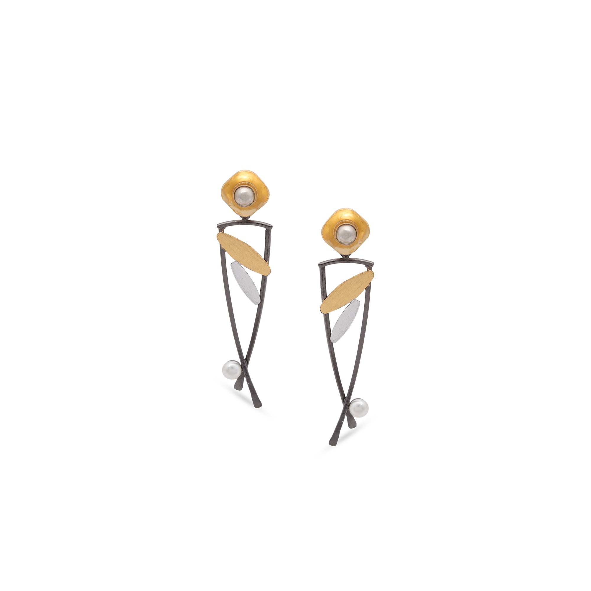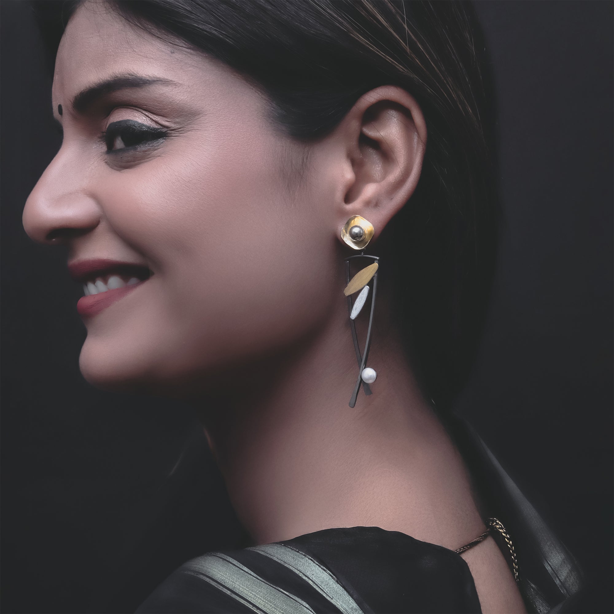 A sleek combination of oxidised arcs, brushed gold elements, and pearl accents — crafted like wearable modern art with a...