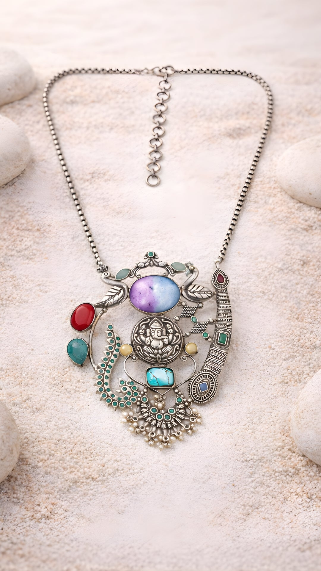 Step into the festive spirit with this masterpiece that embodies the joy and vibrance of Navratri. The Vibrant Harmony Necklace is designed with a striking blend of colorful stones—rich purple, calming turquoise, fiery red, and soothing green—all set against a backdrop of antique oxidized silver. The necklace features finely carved motifs, delicate floral engravings, and clusters of tiny pearls that add movement and charm as you sway to the beats of garba and dandiya.