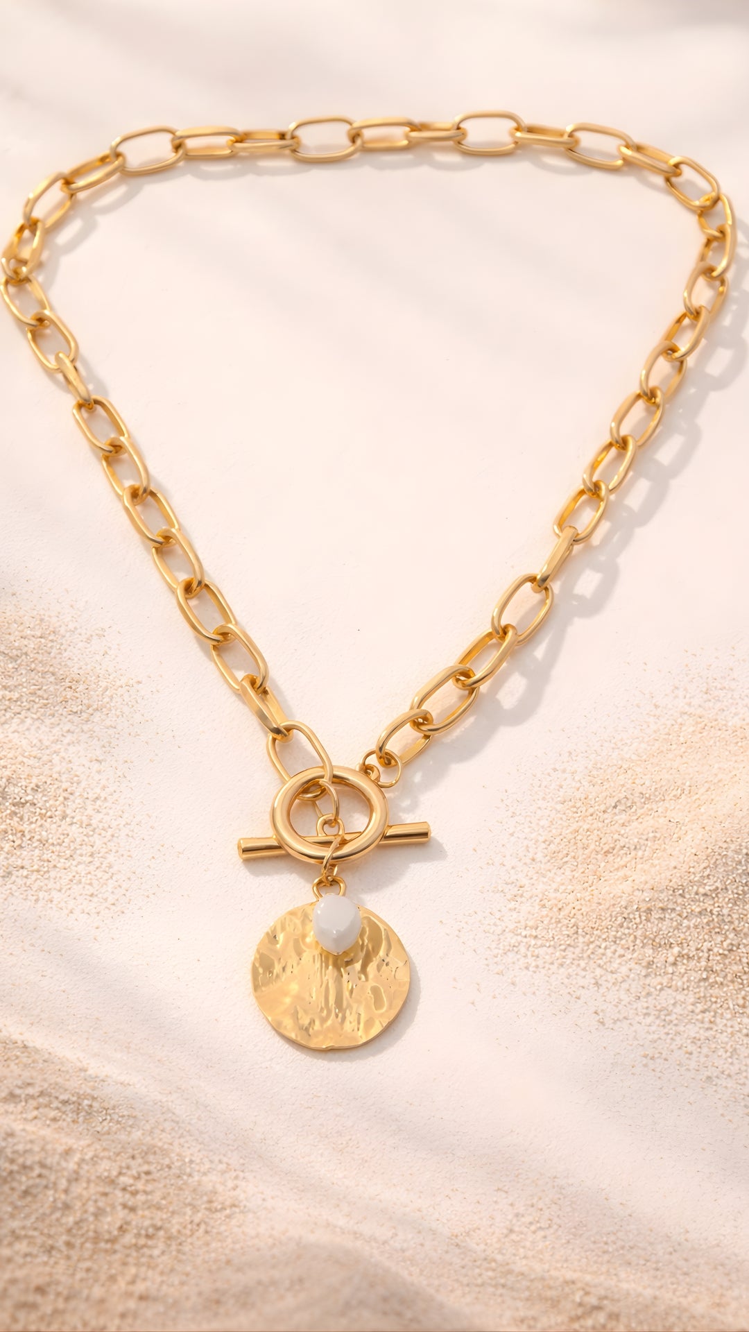 Zora brings bold to basics with a hammered coin pendant and single drop pearl charm hanging from a thick gold...